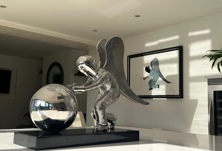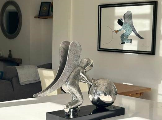 The artist's signature is engraved in the sculpture. The details shine through on the durable stainless-steel sculpture.