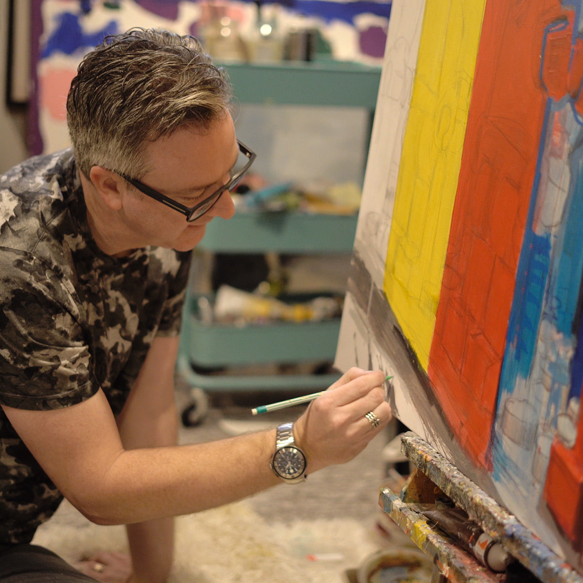 Inspired by Abstract Impressionism and his young daughter’s artistic self-expression, John’s paintings allow the original pencil sketches to live in the layers of paint. Recognisable characters are presented as both entire beings and a unique combination of shapes, patterns and colour.
