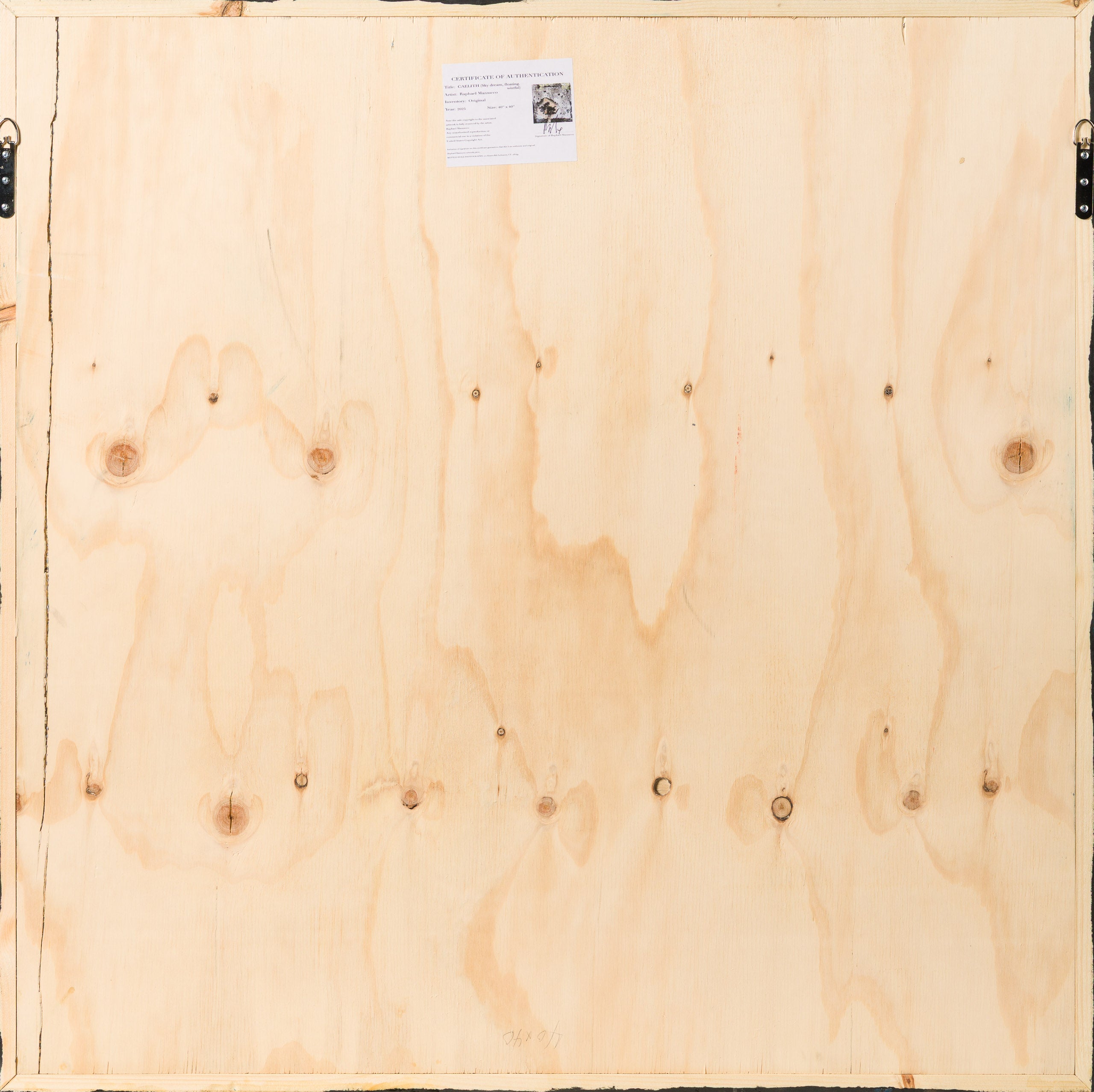 Mazzucco has incorporated ripped paper and shimmering loose pigments in his work for the first time in the Dreamscape collection, adding an ethereal, otherworldly aesthetic to the artwork. Layering photographs, pigments and found objects between glossy veils of resin, the artist offers contrast and cohesion where the image is repeated or disrupted, alluding to hazy, hard to reach memories. The torn edges form clouds, cliffs and silhouettes, dissolving and reforming to create artworks within artworks, like dreams within dreams. Adding his signature elements of handwritten text, Mazzucco wrote words that flowed through his mind whilst he created the piece, reaching into his own subconscious.