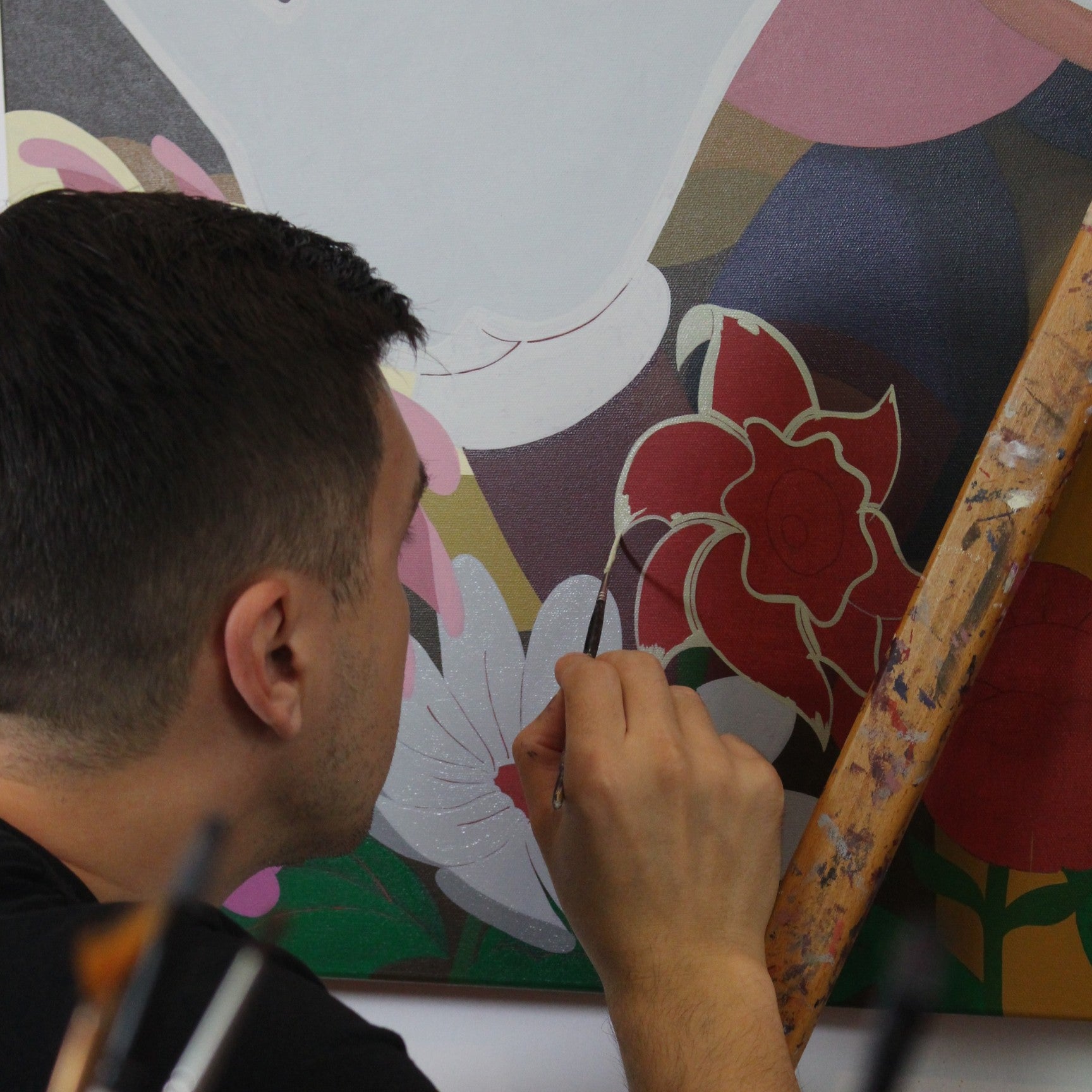 Raised in post-Soviet Lithuania and entirely self-taught, YAMA began sketching imagined worlds as a child. Today, those early drawings have evolved into expressive, character-led paintings that explore themes of consumerism, conformity and identity. His bright colours, soft gradients and painterly textures contrast with the weight of the ideas beneath, inviting viewers into a world that’s gentle on the surface but rich with meaning.
