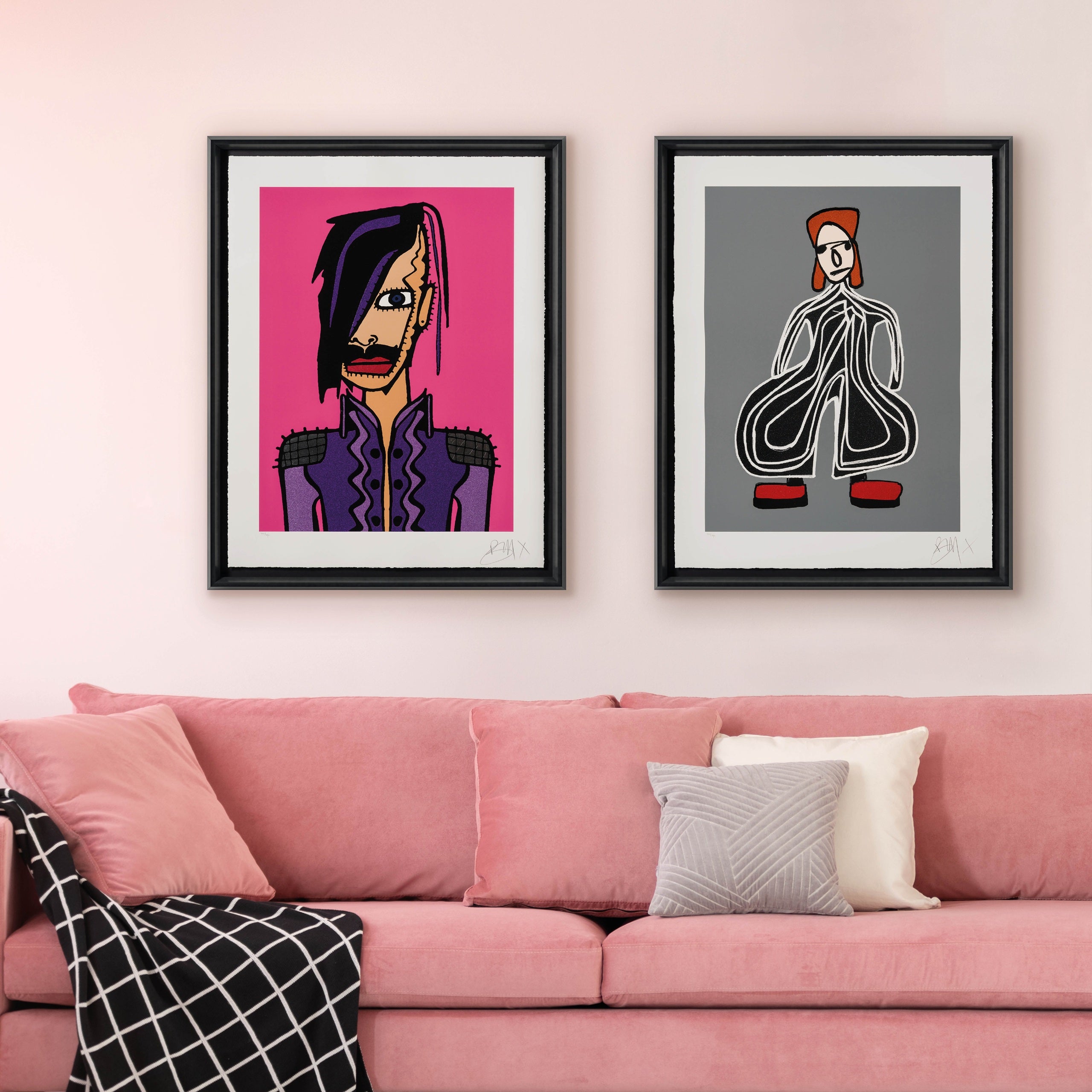Firstly, depending on the prints requirements, an initial print pass using archival pigments is used to map out the design (this has been used on “Colour By Numbers” and “Purple Reign” which then have silkscreen overlays). Two of the works, “Madame X” and “Yamamoto” are predominantly silkscreen. Next, sections are picked out using “glitter gloss”; a process which involves screening inks containing fine glitter suspended within. Further embellishment is then added to finish the works; this being a silkscreen varnish to pick out George’s black line work and silver leaf (silver leaf is used on “Madame X” and “Purple Reign)