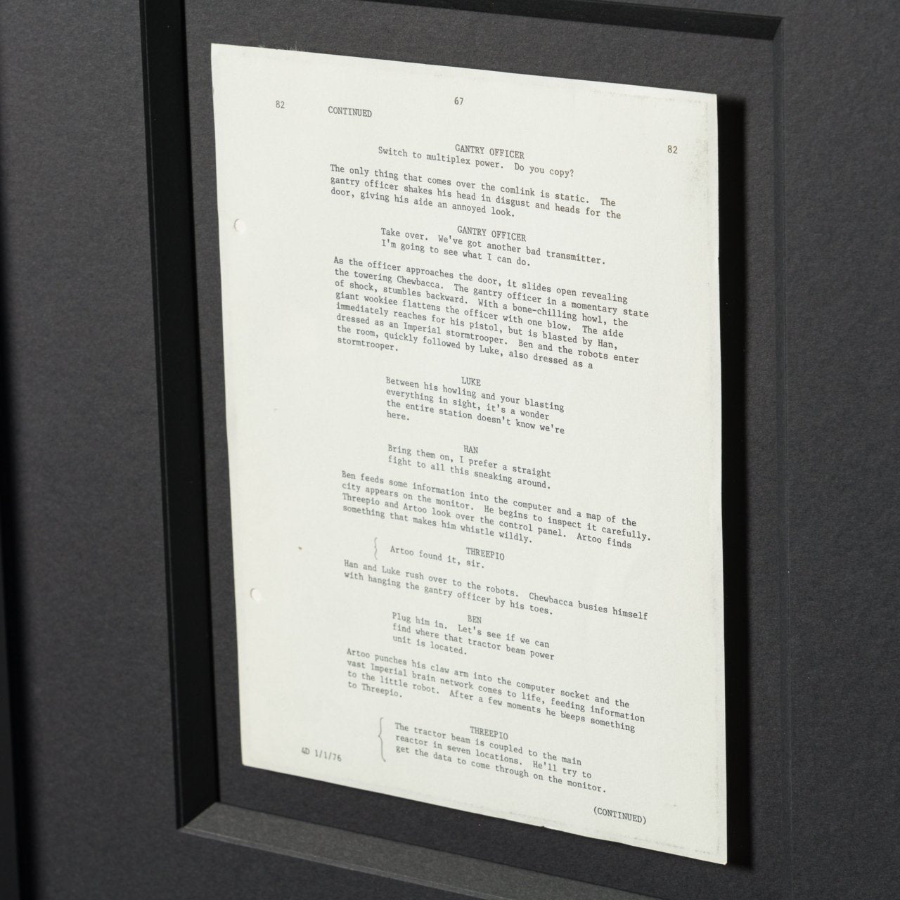 His 145-page draft script, credited to Lucas, is dated January 1, 1976. The visibly worn title page has Daniels' name stamped on it and features the title “Star Wars”.