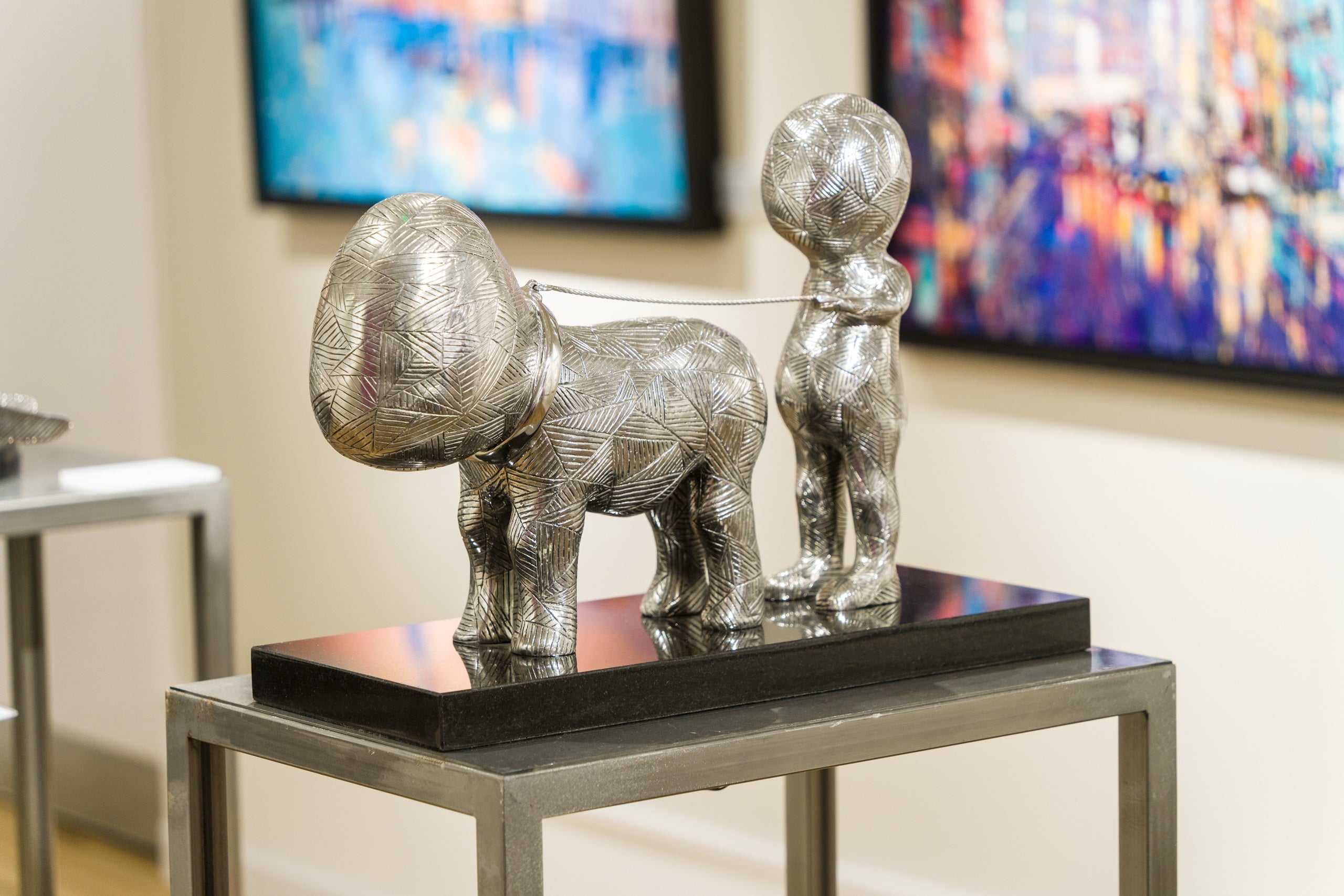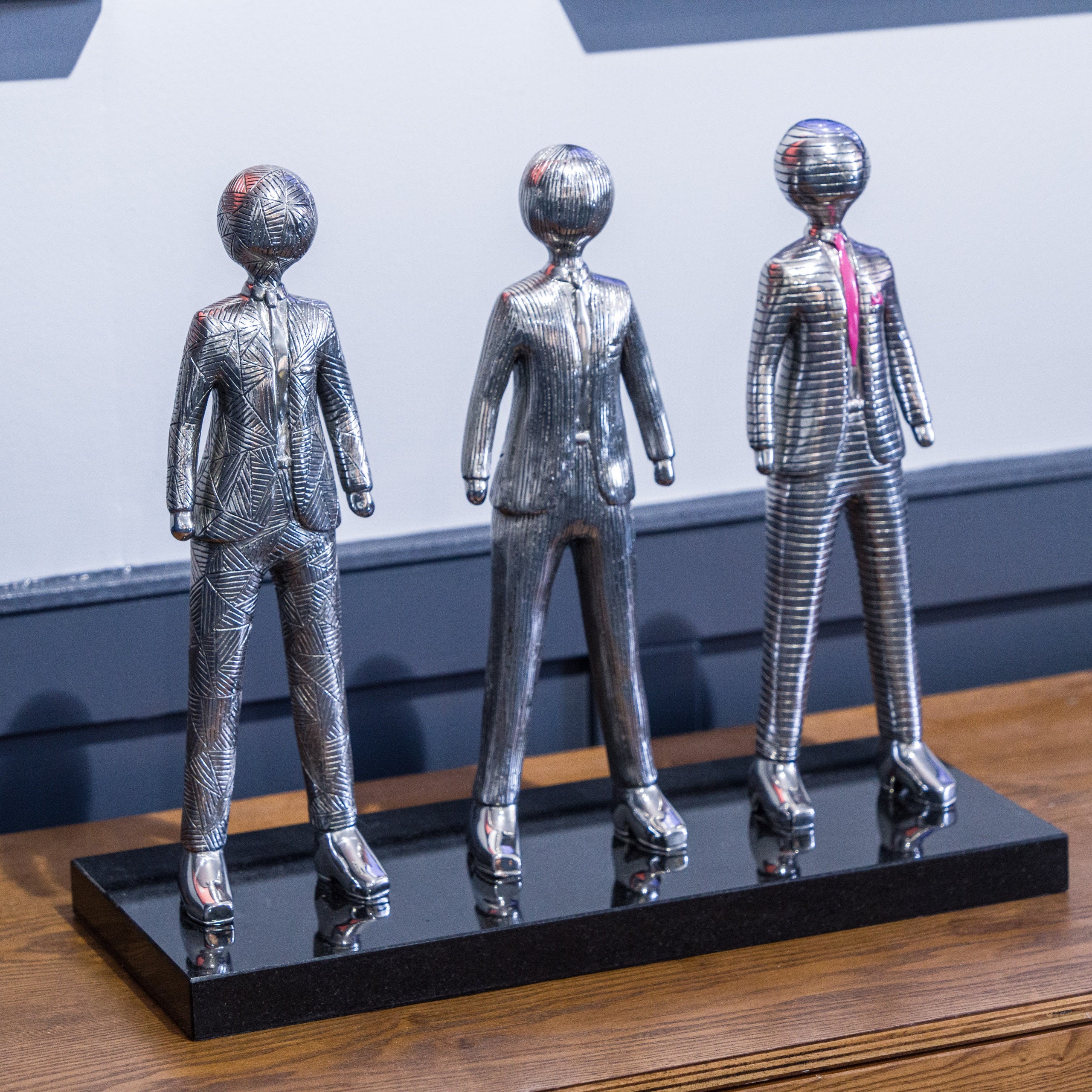 Formed first in clay to capture the detailed lines of his signature style, the sculptures are then cast in immaculate stainless steel which embodies Billy's time as a welder in the shipyards of Glasgow. Contrast is created between detailed and patterned areas through intricate texture and polishing while the tie and pocket square on 'Pink Tie & Hanky' are hand-painted.