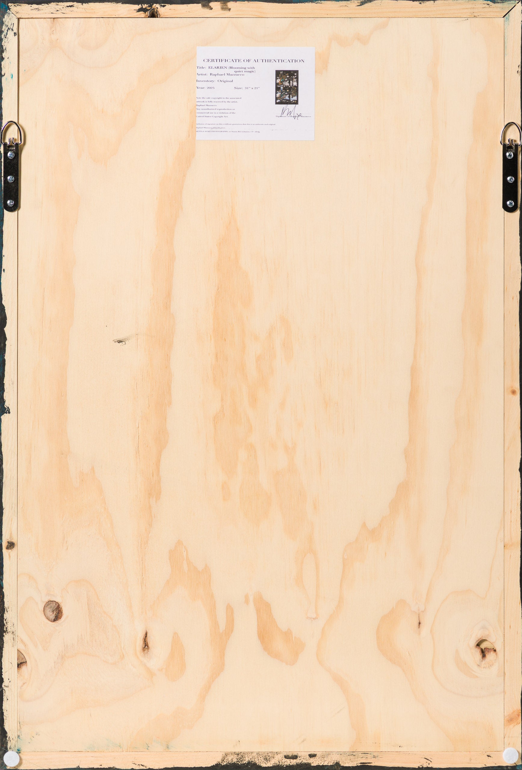 Mazzucco has incorporated ripped paper and shimmering loose pigments in his work for the first time in the Dreamscape collection, adding an ethereal, otherworldly aesthetic to the artwork. Layering photographs, pigments and found objects between glossy veils of resin, the artist offers contrast and cohesion where the image is repeated or disrupted, alluding to hazy, hard to reach memories. The torn edges form clouds, cliffs and silhouettes, dissolving and reforming to create artworks within artworks, like dreams within dreams. Adding his signature elements of handwritten text, Mazzucco wrote words that flowed through his mind whilst he created the piece, reaching into his own subconscious.