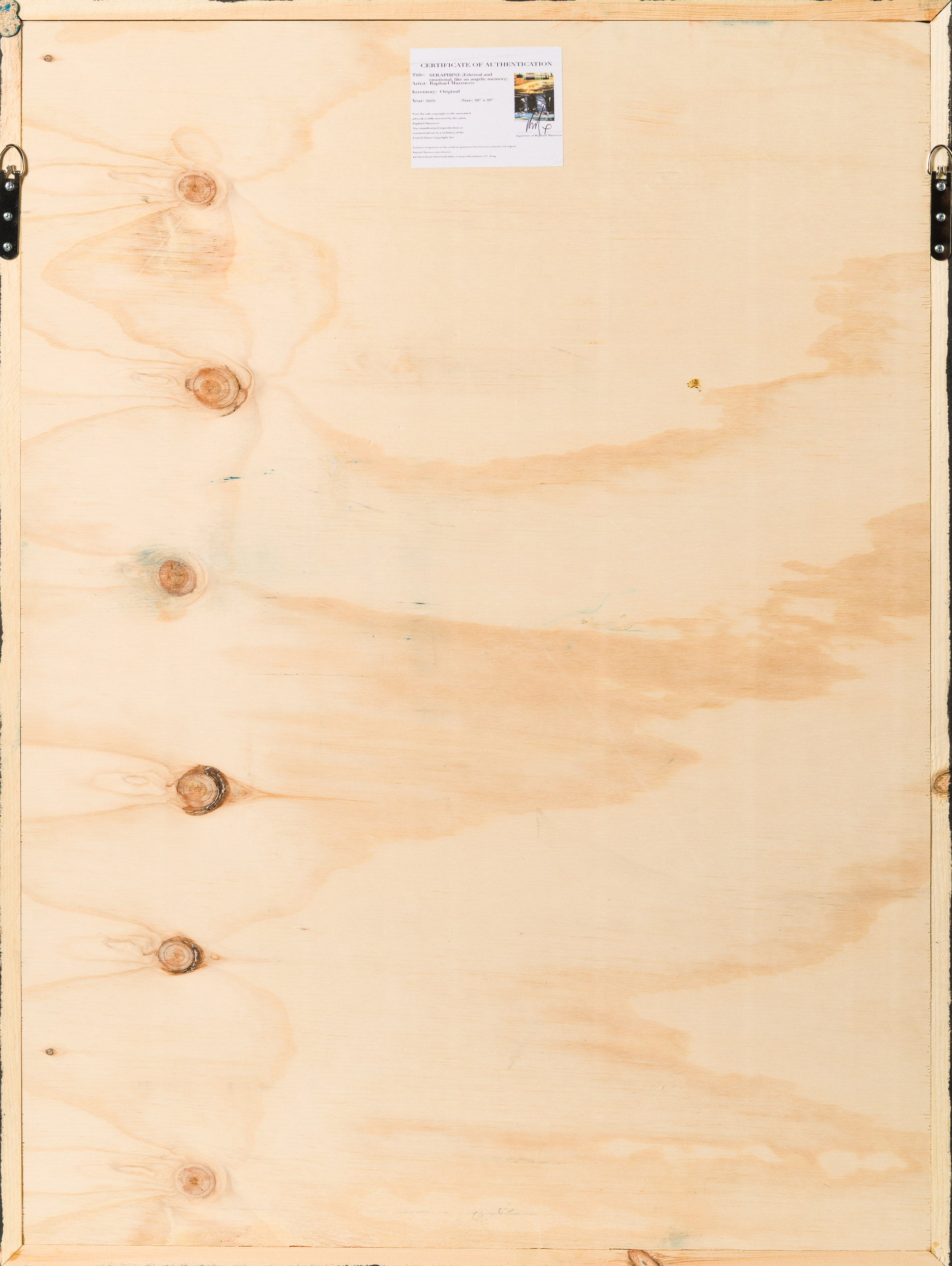 Mazzucco has incorporated ripped paper and shimmering loose pigments in his work for the first time in the Dreamscape collection, adding an ethereal, otherworldly aesthetic to the artwork. Layering photographs, pigments and found objects between glossy veils of resin, the artist offers contrast and cohesion where the image is repeated or disrupted, alluding to hazy, hard to reach memories. The torn edges form clouds, cliffs and silhouettes, dissolving and reforming to create artworks within artworks, like dreams within dreams. Adding his signature elements of handwritten text, Mazzucco wrote words that flowed through his mind whilst he created the piece, reaching into his own subconscious.