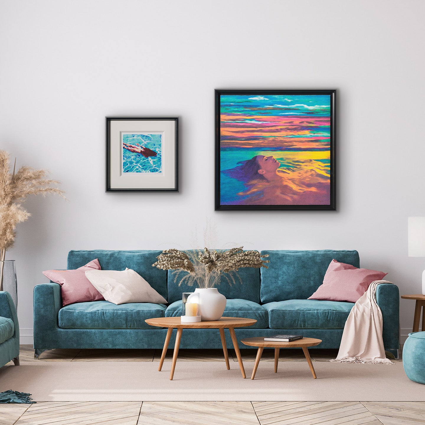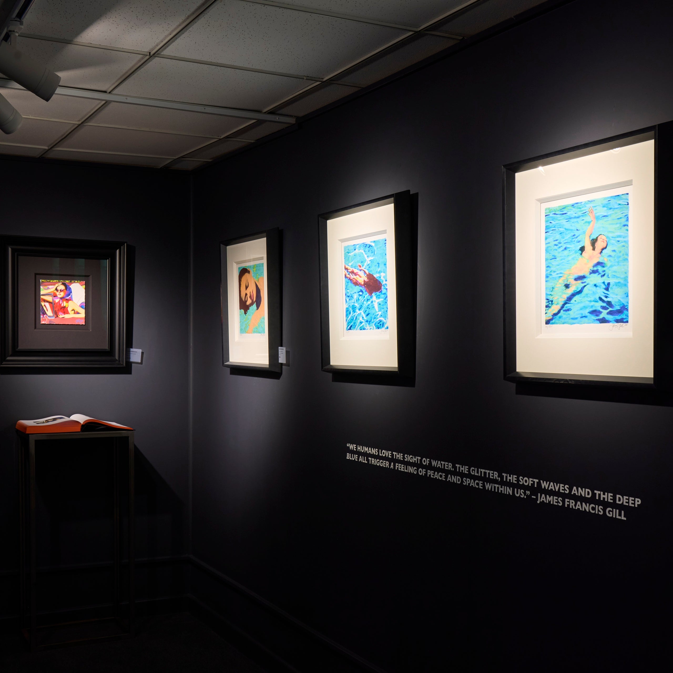 Framed as through seen from above, the women are shown through a lens of vulnerability, liberation and quiet intensity. Gill paints his muses gently gliding through serene blue waters, luxuriating in tranquillity.