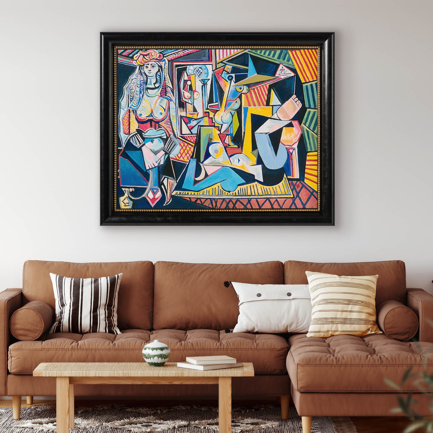 This artwork is based on Picasso's "Women in Algiers", 1955. In this striking piece, Picasso masterfully distorts the forms of the women in the foreground, presenting them in dynamic and impossible contortions that reveal both front and back views simultaneously. This emphasis on the odalisque reflects Picasso's admiration for Henri Matisse, a master of depicting women adorned in exotic costumes. Inspired by Matisse's recent passing, Picasso delves into this theme with a fresh perspective.