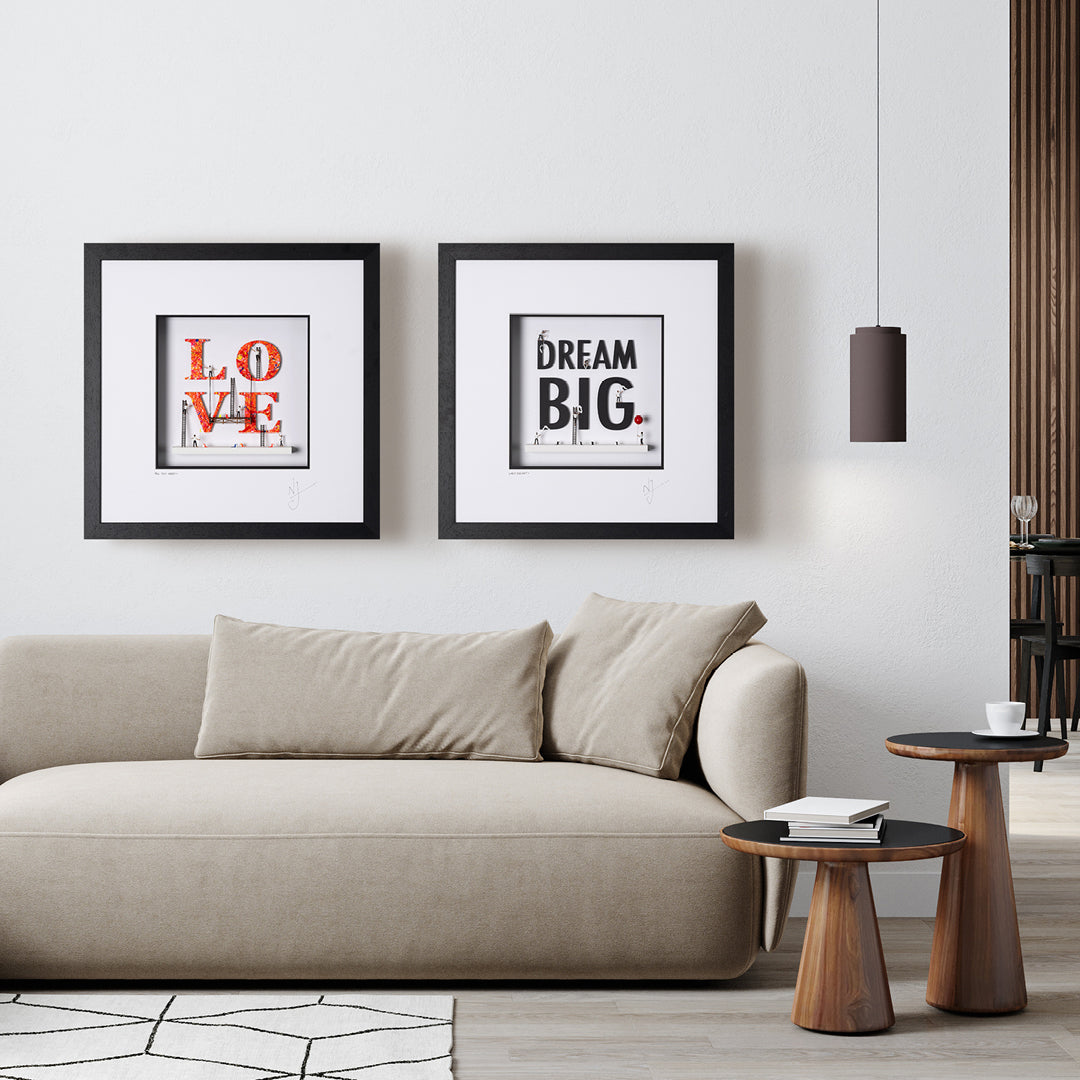 For this special collection, Joly has created two different editions for each title which not only vary in size, but have different edition sizes: the Collector's edition, a larger artwork with an edition number of 100 and featuring more of his iconic figurines, while the Conceptual edition is smaller in size and edition number of 295.