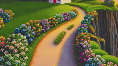 Working with a punchy and harmonious colour palette, Paul Corfield’s new collection shows us idyllic landscapes inspired by the south of England. With his signature white house in vista, Corfield douses British coastlines in warm sunlight. From luscious greenery to turquoise waters, in ‘Coastal Harmony’ the artist captures the real-life effects of light and atmosphere in his distinctive, imaginative realism style.