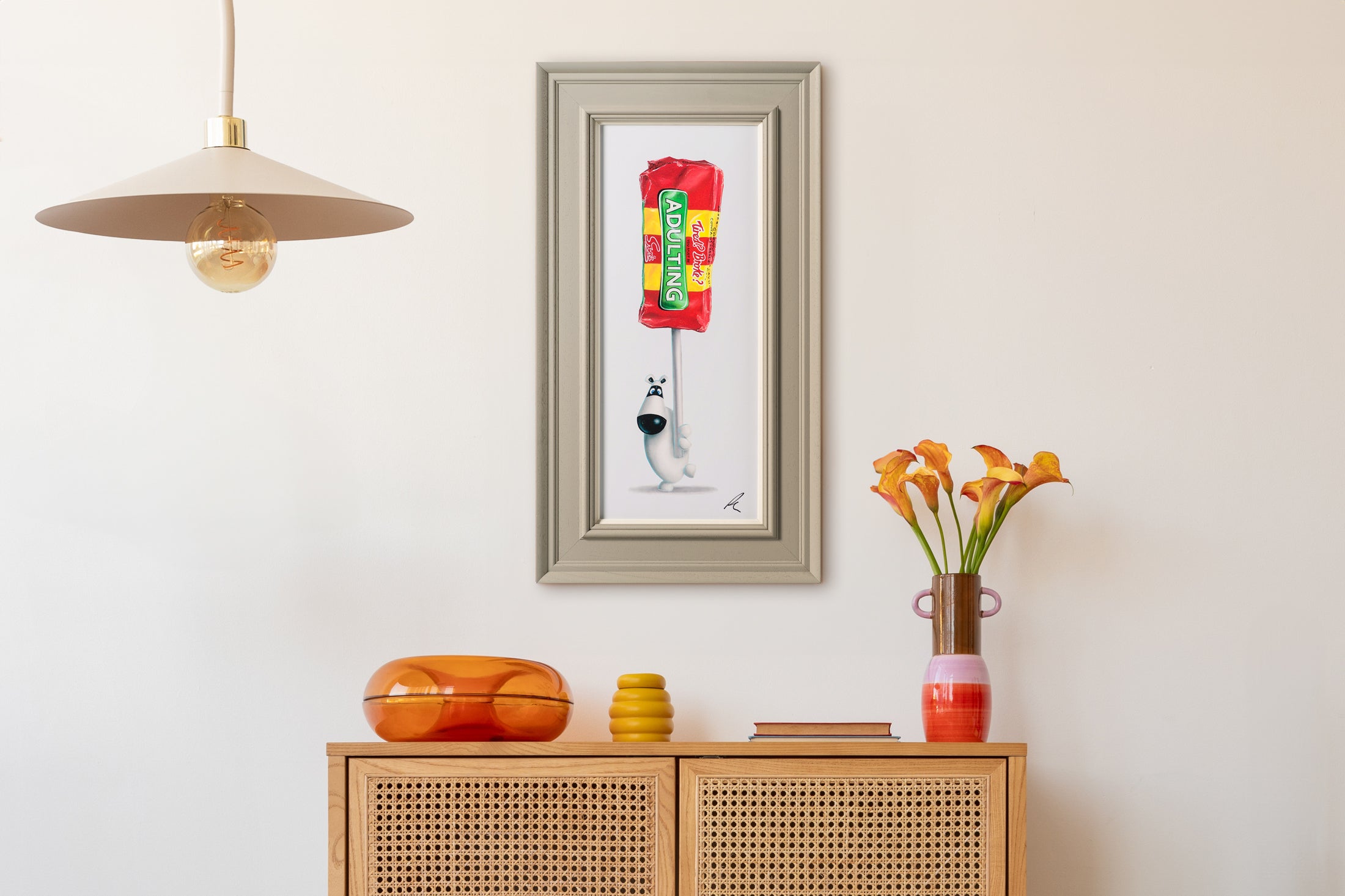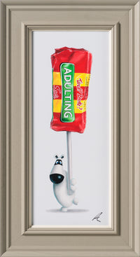 Across the collection, familiar British classics, in this case Drumsticks are reimagined with the Smiths’ hyper-realist precision. Peters’ refined oil technique gives each wrapper a tactile presence so convincing it appears almost peelable, while the clean compositions maintain a crisp contemporary elegance perfectly suited to modern interiors.