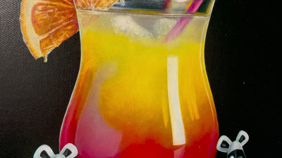 Following the roaring success of Shaker Maker and Sip, the British duo invites us to indulge in a decadent array of the artist’s signature serves – each one a playful marriage of humour, character, and technical mastery. Radiating warmth and nostalgia, this Tequila Sunrise glows with the easy charm of a long, sun-drenched afternoon. Vivid layers of orange and crimson melt seamlessly together, evoking the soft haze of a tropical sunset. Ever the provocateur, an Impossimal holds aloft two perfectly round cherries, a cheeky flourish to this beautifully balanced blend of colour, craft, and mischief.
