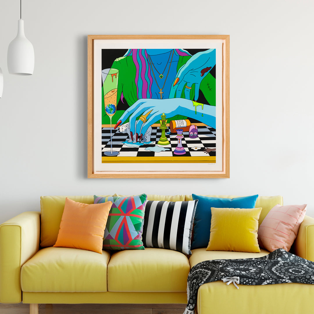 A femme fatale figure plays chess, but the pawns are far from traditional. The bloodied hand of another touches the player’s wrist, are they looking to take control of her game? The painting features many of Graceland London’s signature motifs, including the ‘squeegee’ – a small, colourful, expressive character that represents the ego, often acting as an indicator of the wider narrative behind the image.