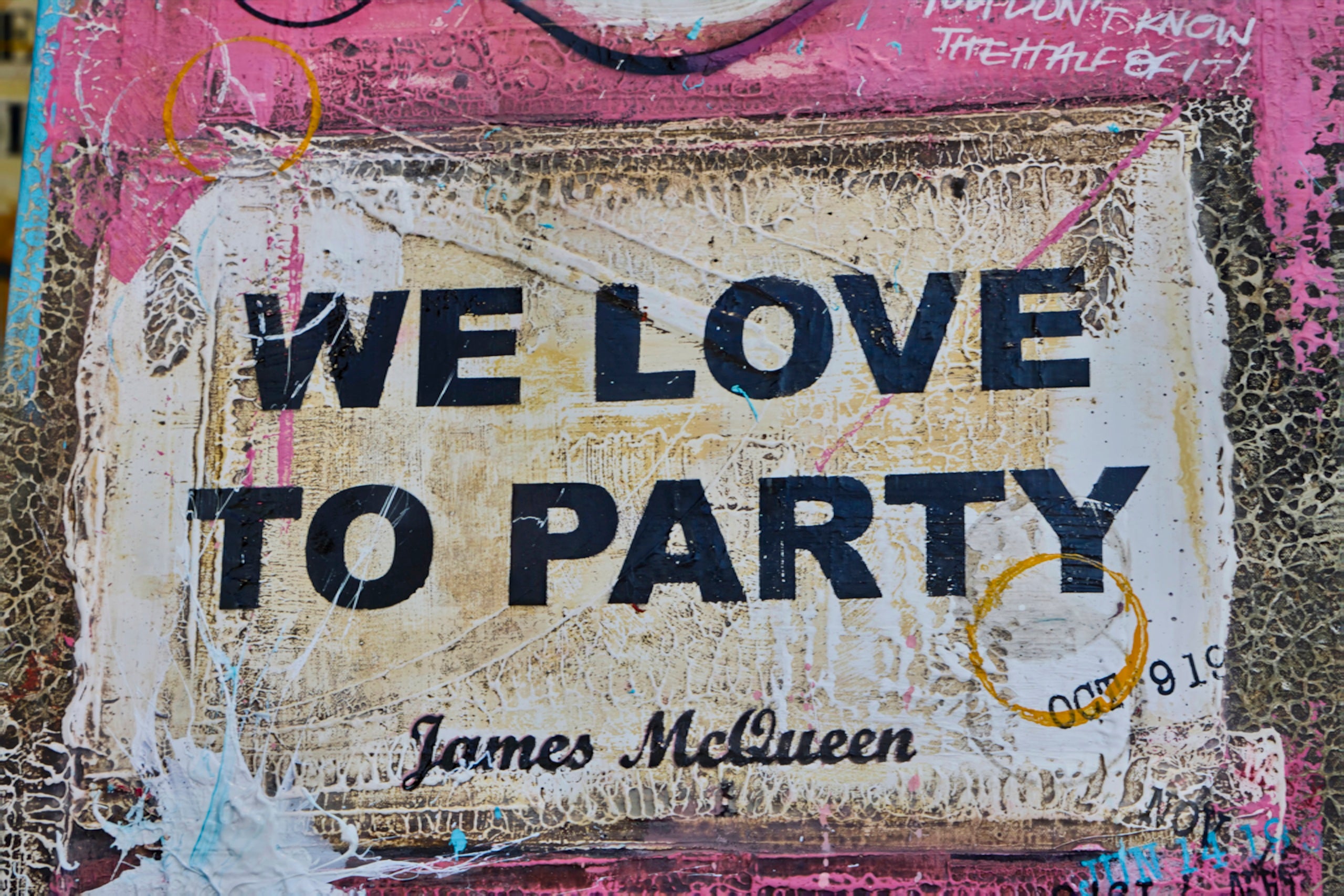 Elusive artist James McQueen is best known for his vibrant vintage book covers and provocative titles which speak to memory and experience. An expert in evoking an emotional response in the viewer, McQueen captures the excitement, colour, and movement of carefree celebration in his new collection, We Love to Party.