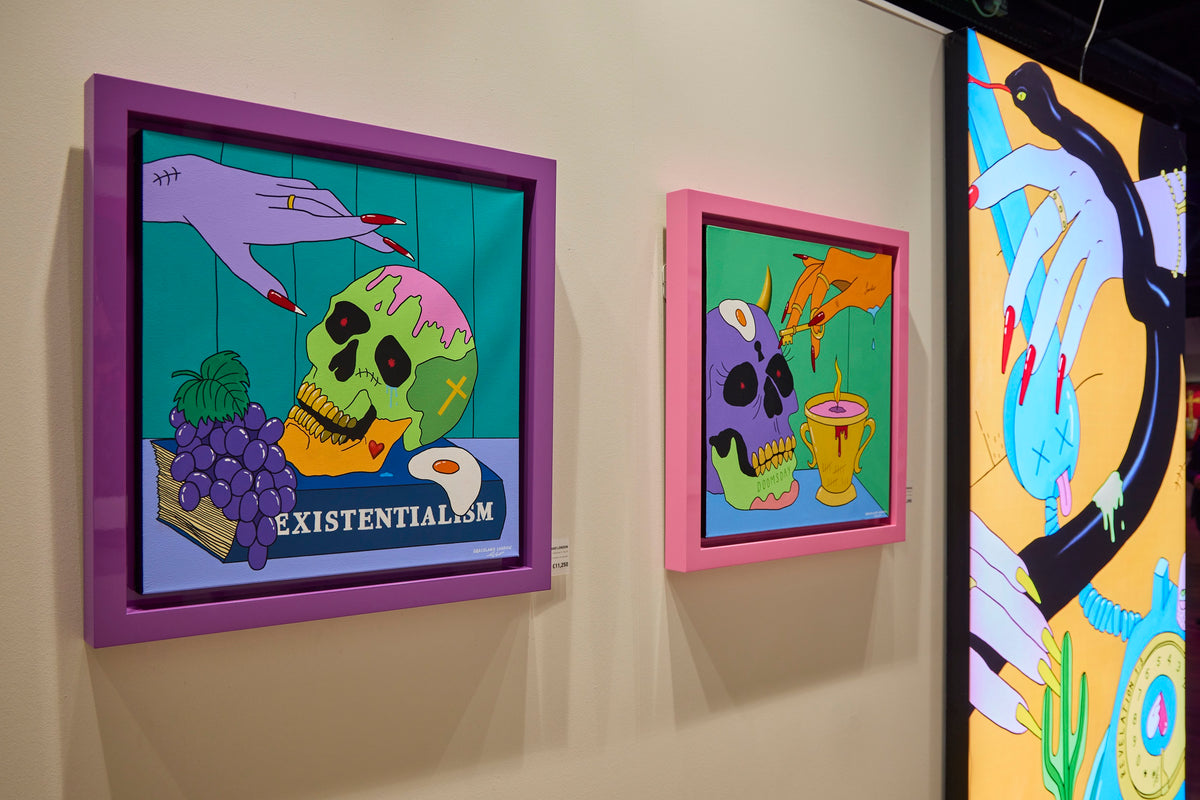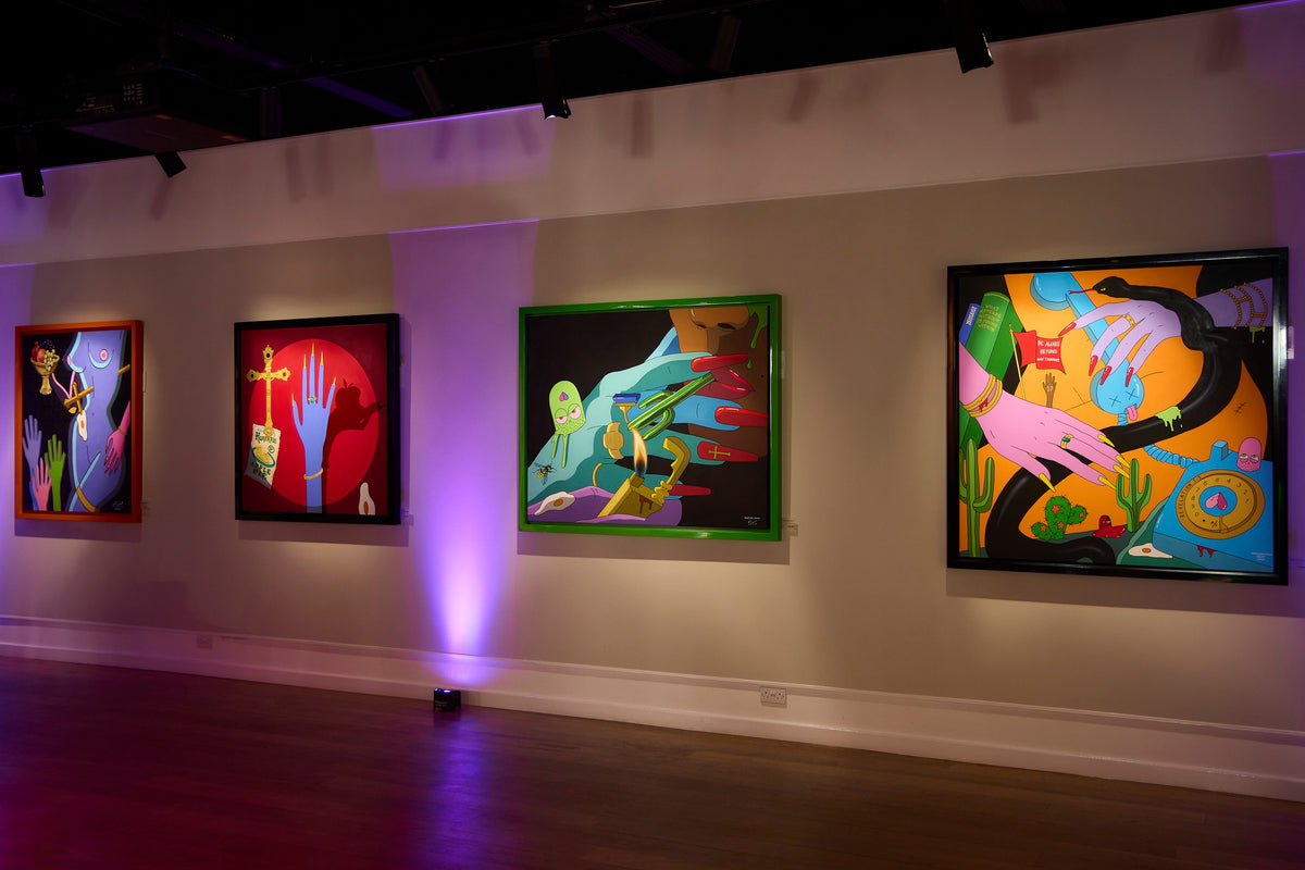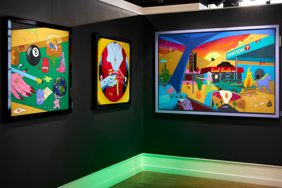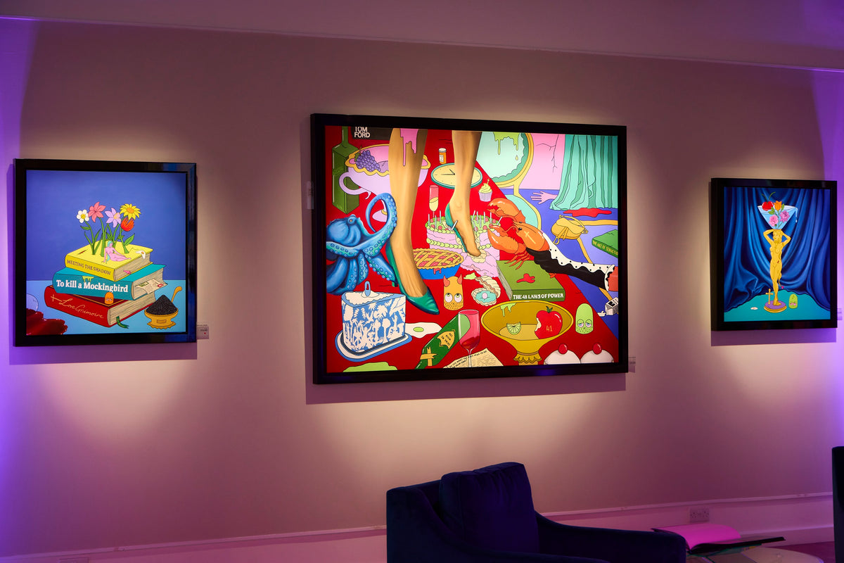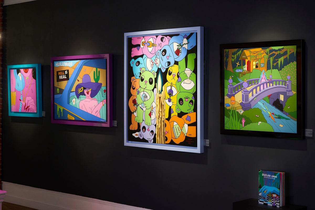 Creating images of decadence and vice through candy colours and playful form, Graceland London’s paintings mirror the age we live in through an animated fantasia.