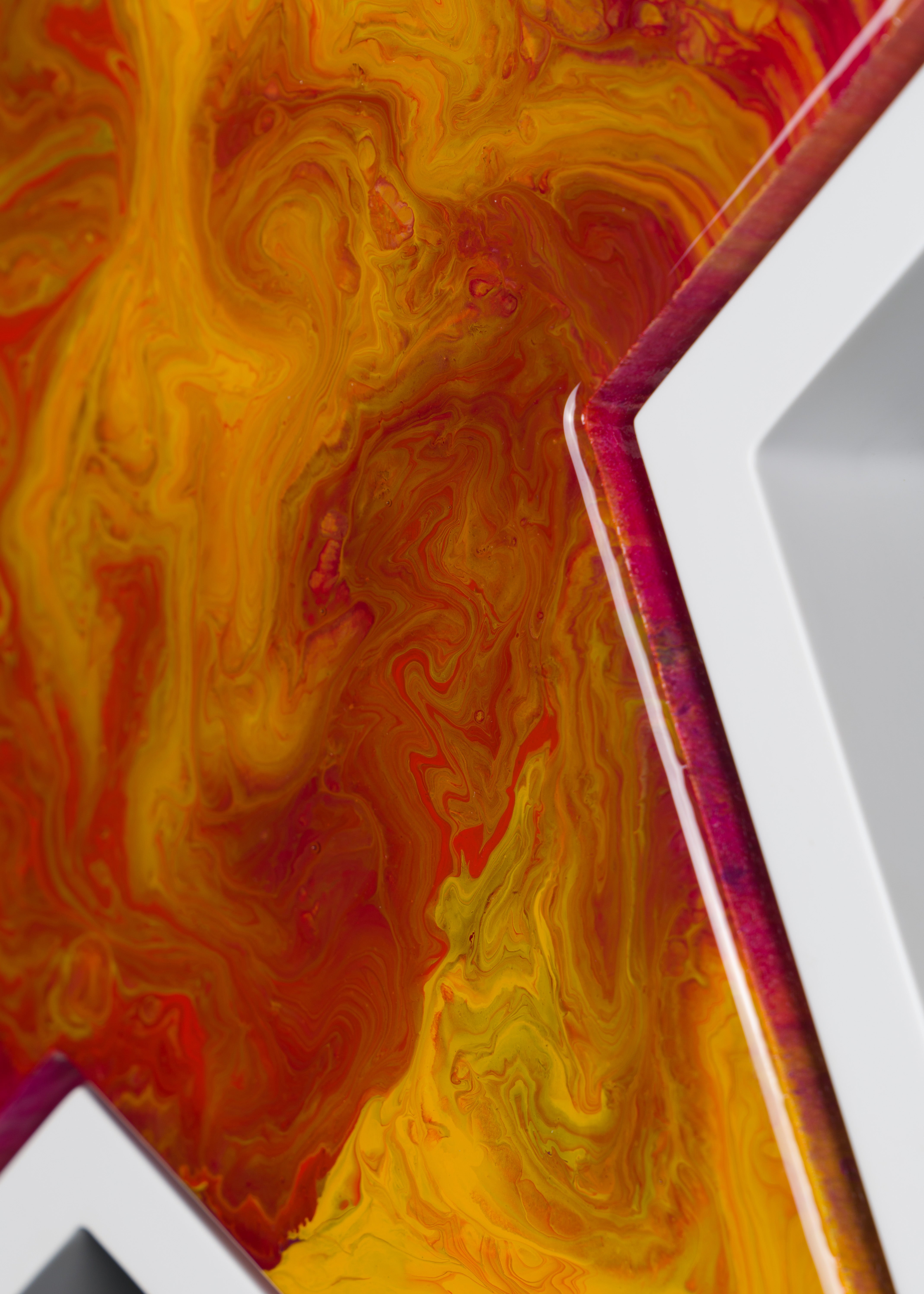 The vibrancy and softness of Turner and structure of Rothko are evident in his work, with the mix of resin and matt finish allowing the viewer to explore the intricate process beneath.