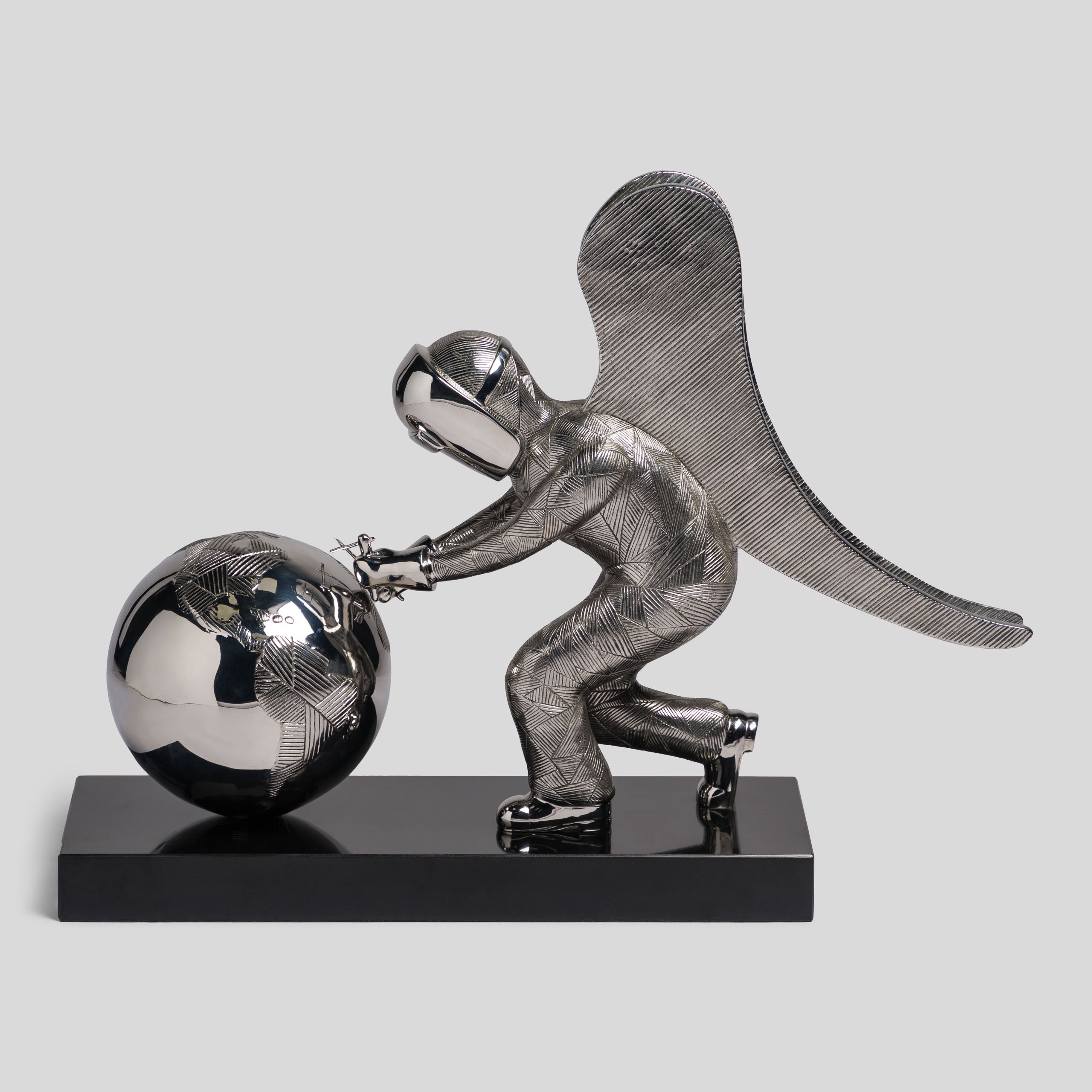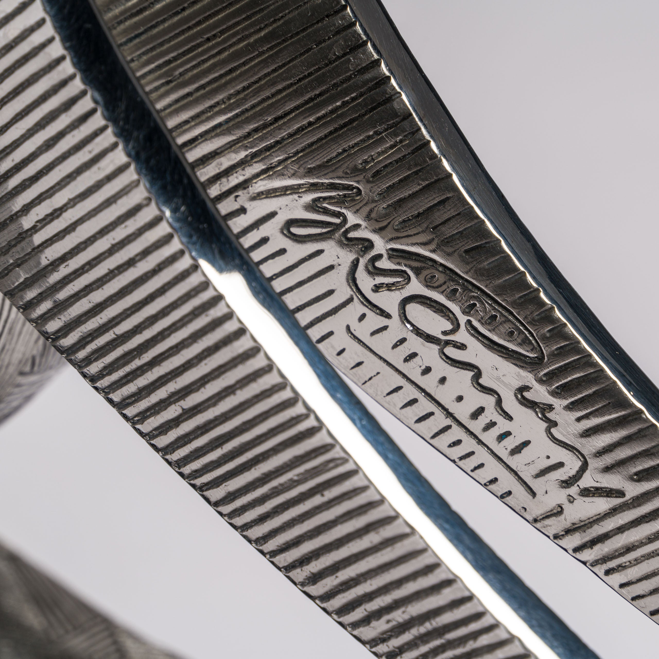 The artist's signature is engraved in the sculpture. The details shine through on the durable stainless-steel sculpture.