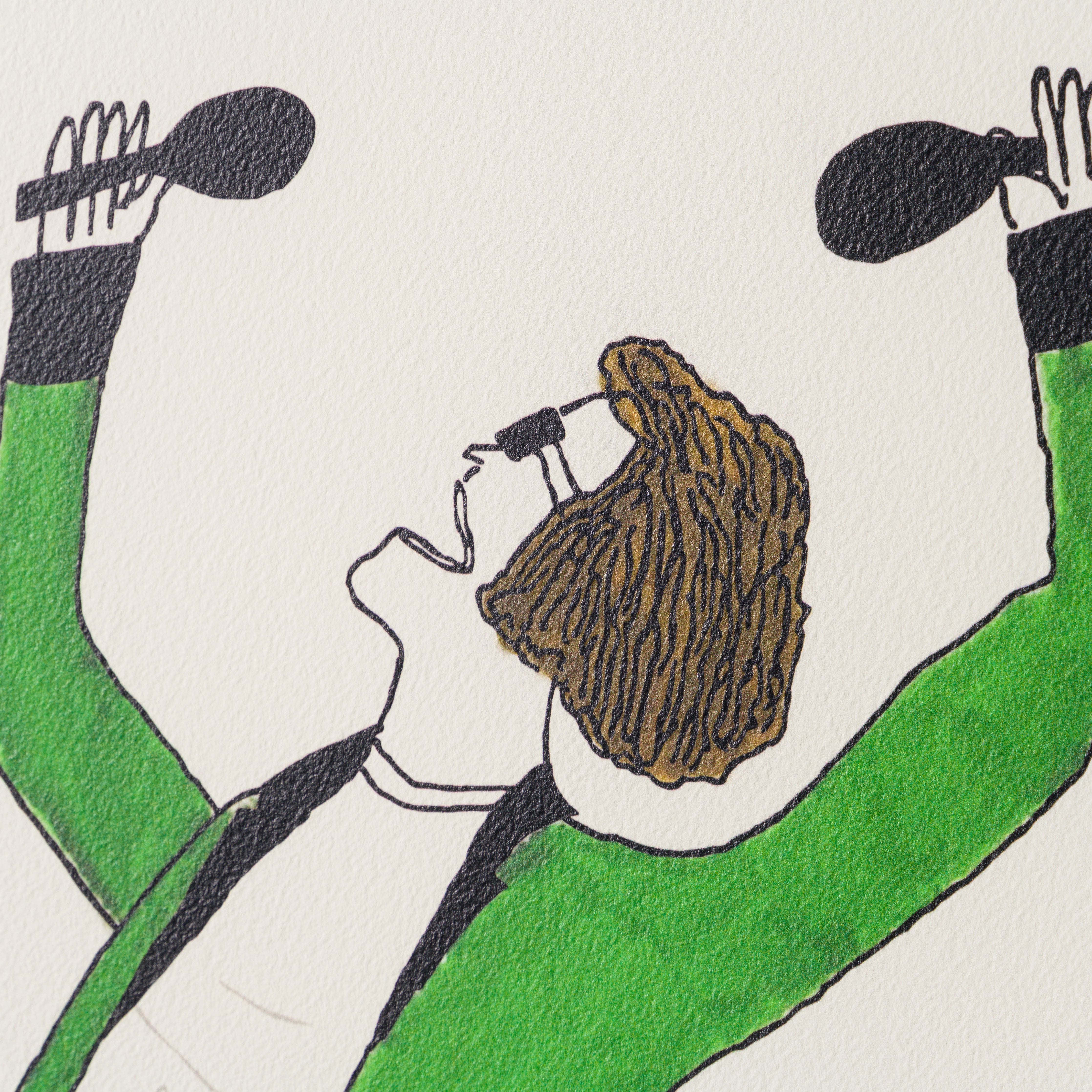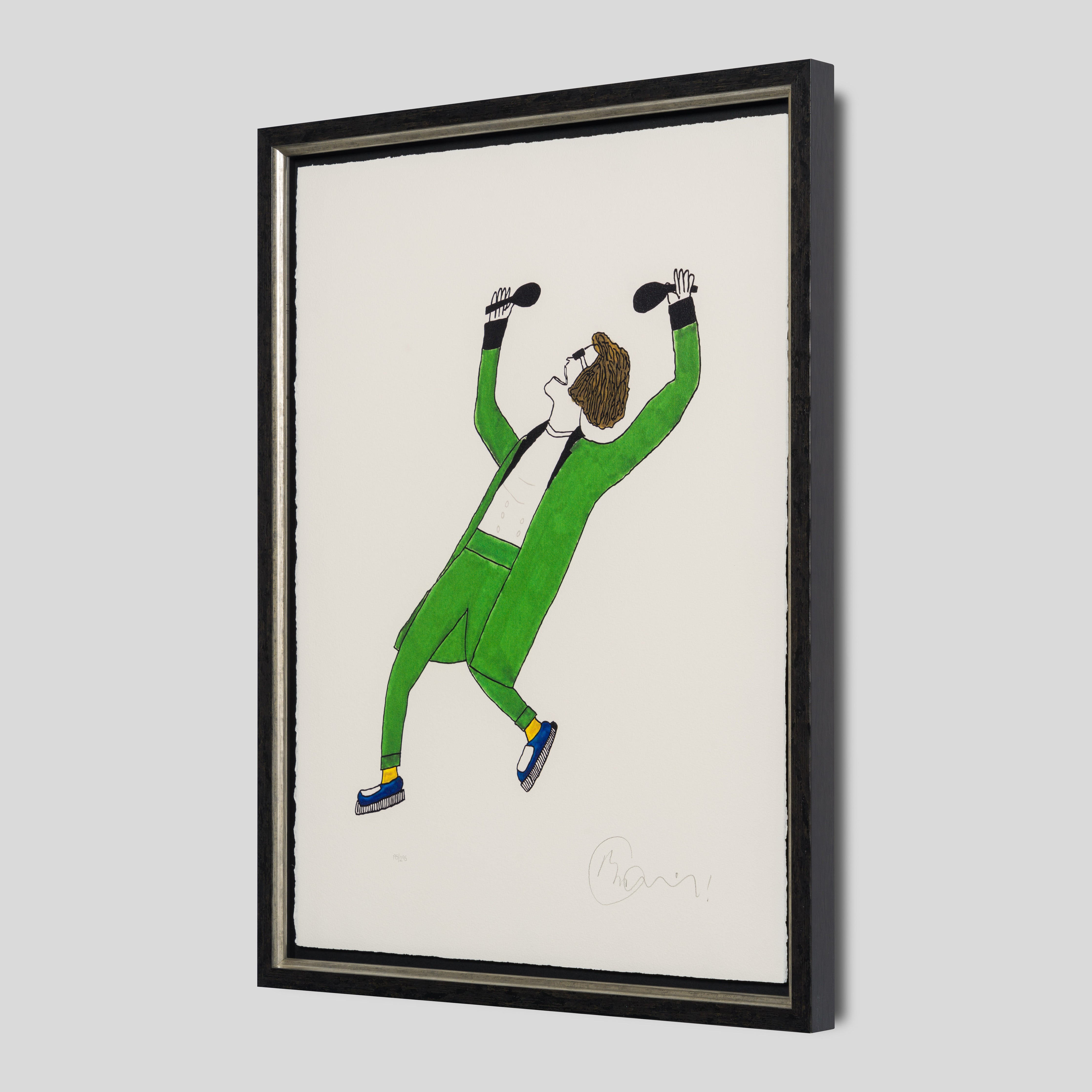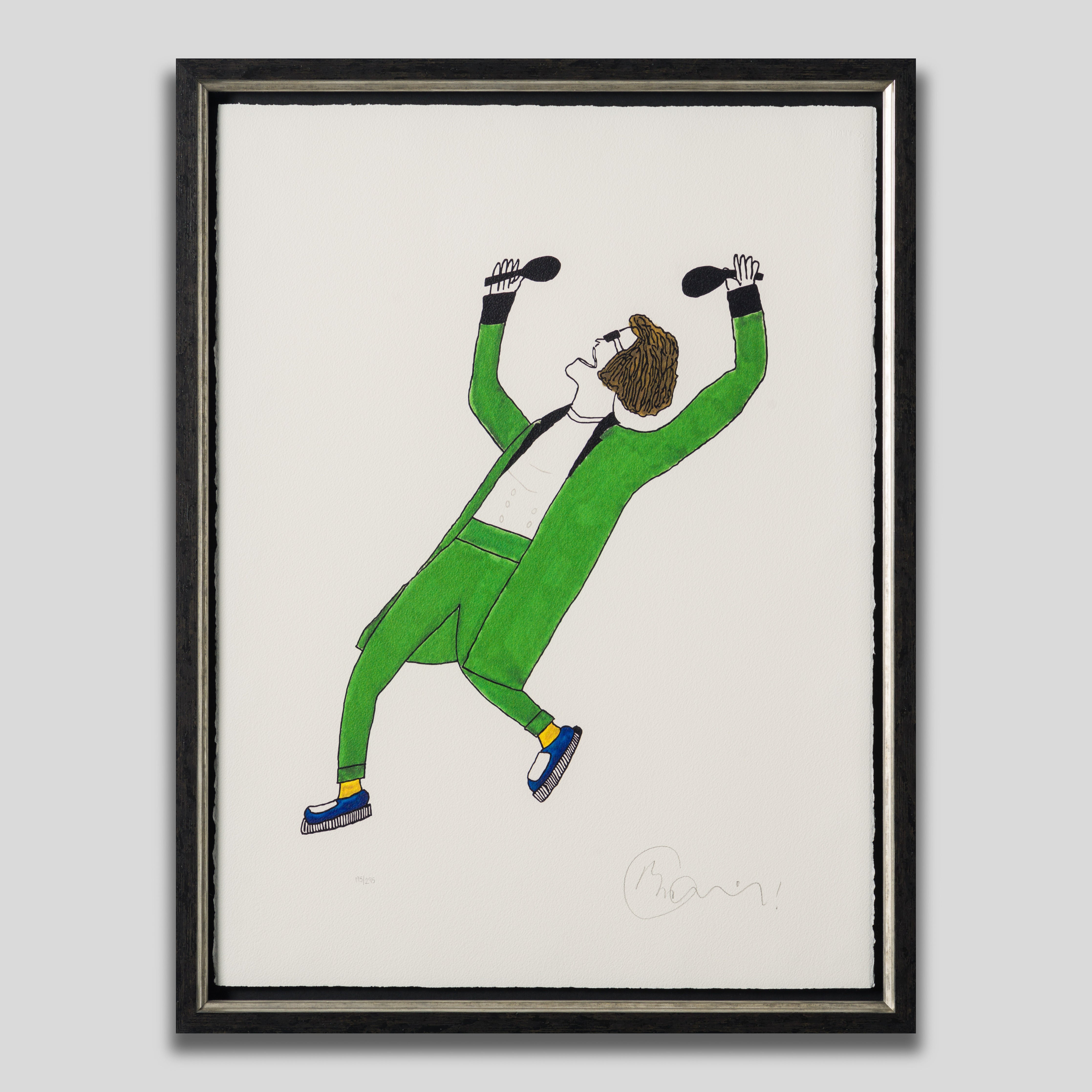 This incredible piece of artwork from world-renowned Scottish comedian and musician Billy Connolly, marks a new collection entitled Windswept and Interesting. Accompanying three other vibrant colour-ways, this bold and bright green edition features a drawing that inspired the illustration of his upcoming autobiography of the same name; released in September 2021.