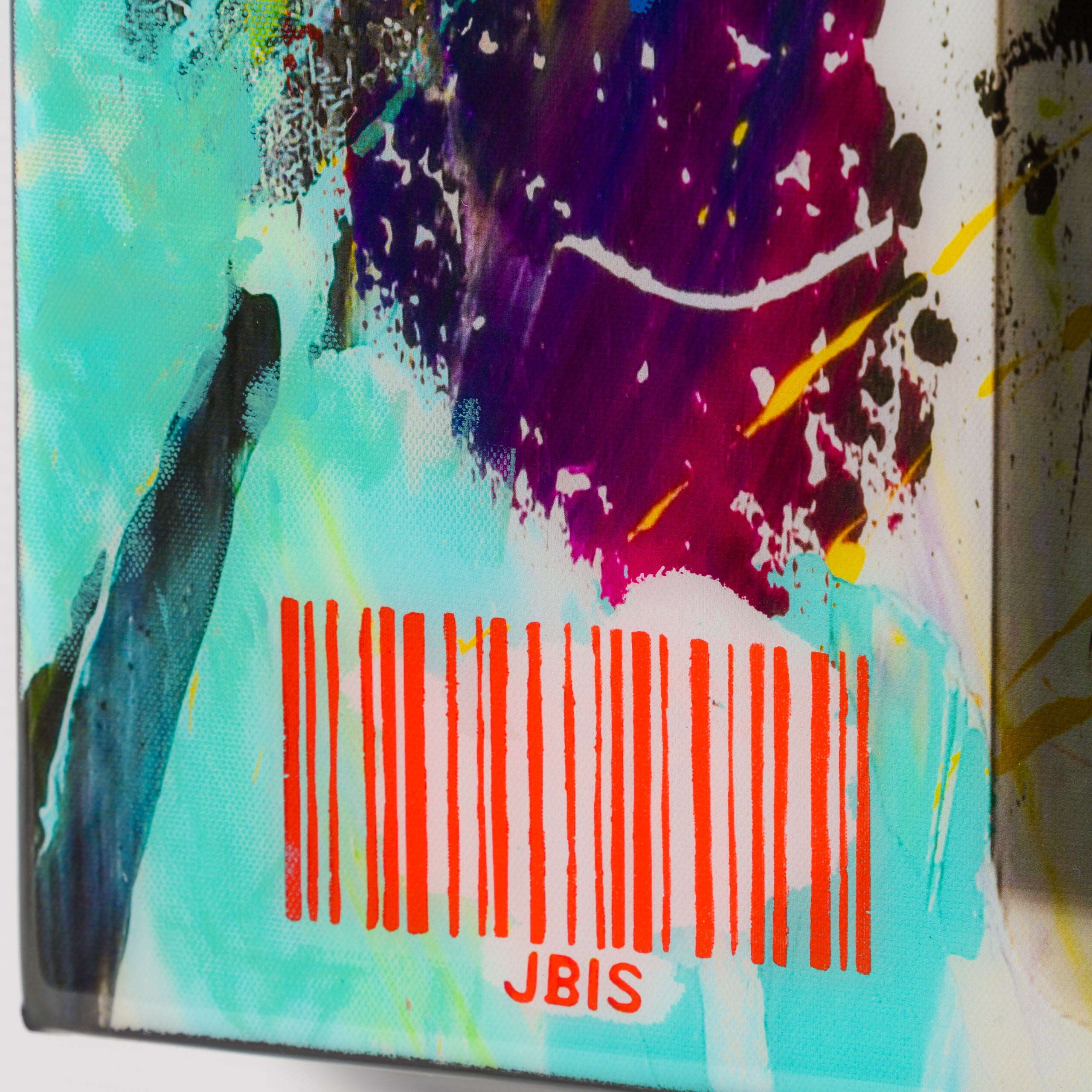 This artwork is hand-signed boxed canvas by the Bisaillon Brothers. Each piece has a red code distinctly defining the brother’s trademark but also hitting at the increasing commercialisation of most things. Part signature, part emblem, part symbol, the red code has become a signature for the artists alongside their unique trinary code that, once decoded, reveals a word specific to each piece.