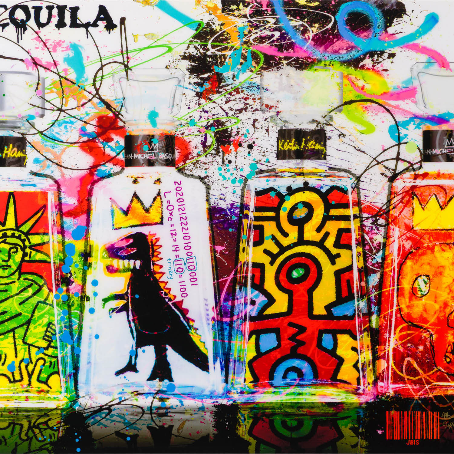 In ‘Urban Spirit | Tequila’ the artists feature both inspiration from Basquiat and Haring’s designs. While the Basquiat bottles feature expressive brushstrokes and neo-expressionist motifs with crowned skulls and primitive figures, the Keith Haring designs are vibrant and rhythmic, covered in his trademark bold lines and animated figures, capturing the immediacy and optimism of Haring’s public art.
