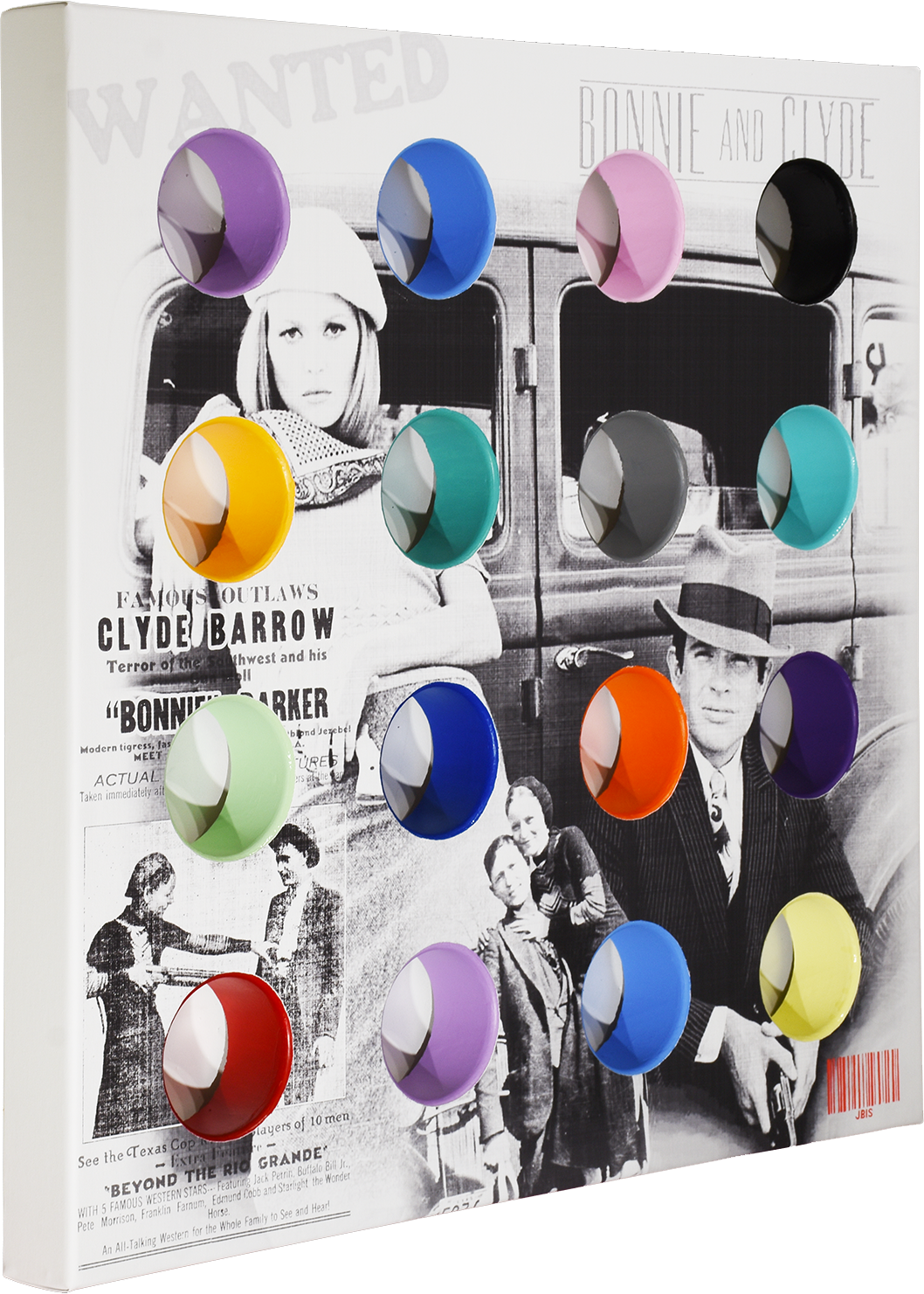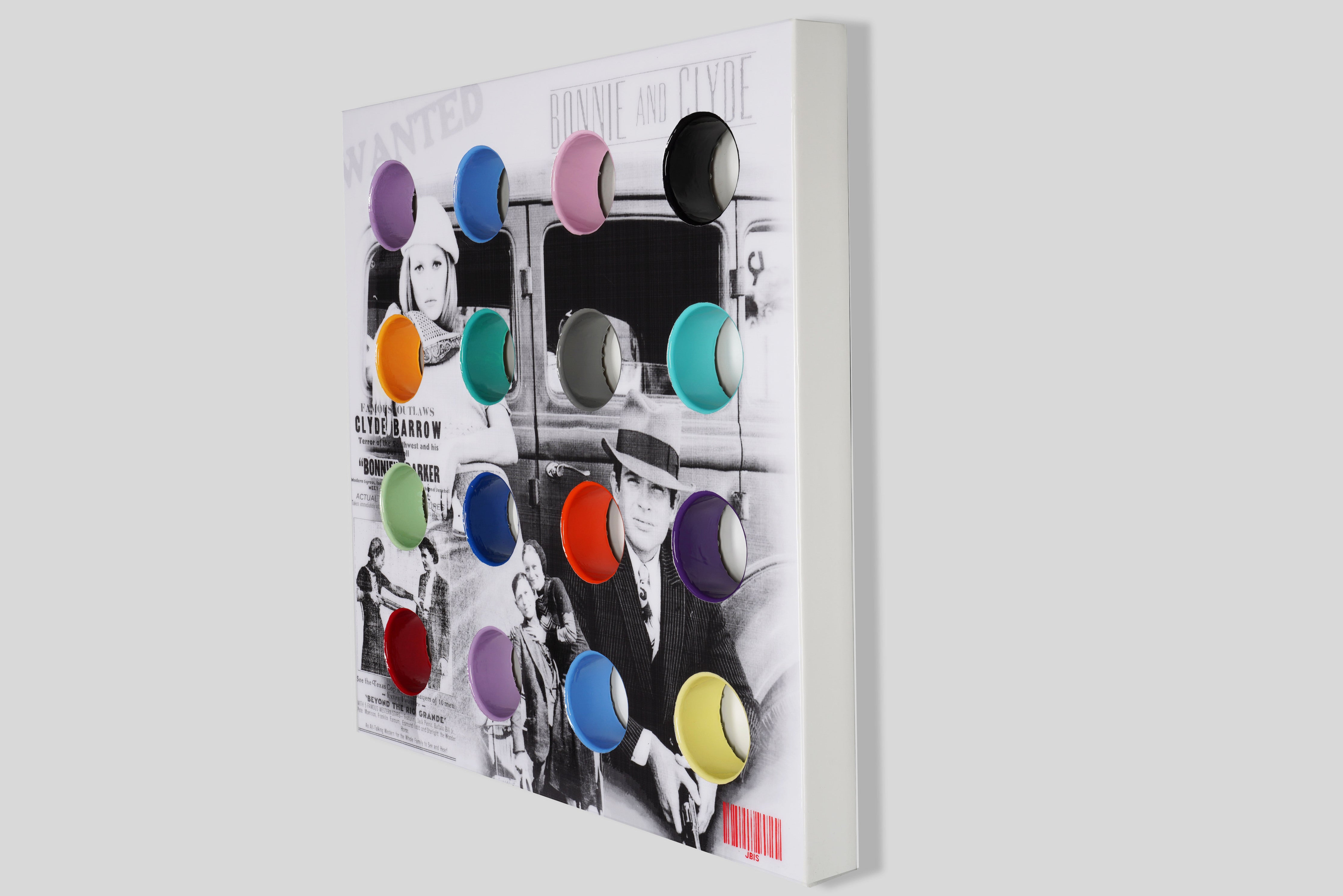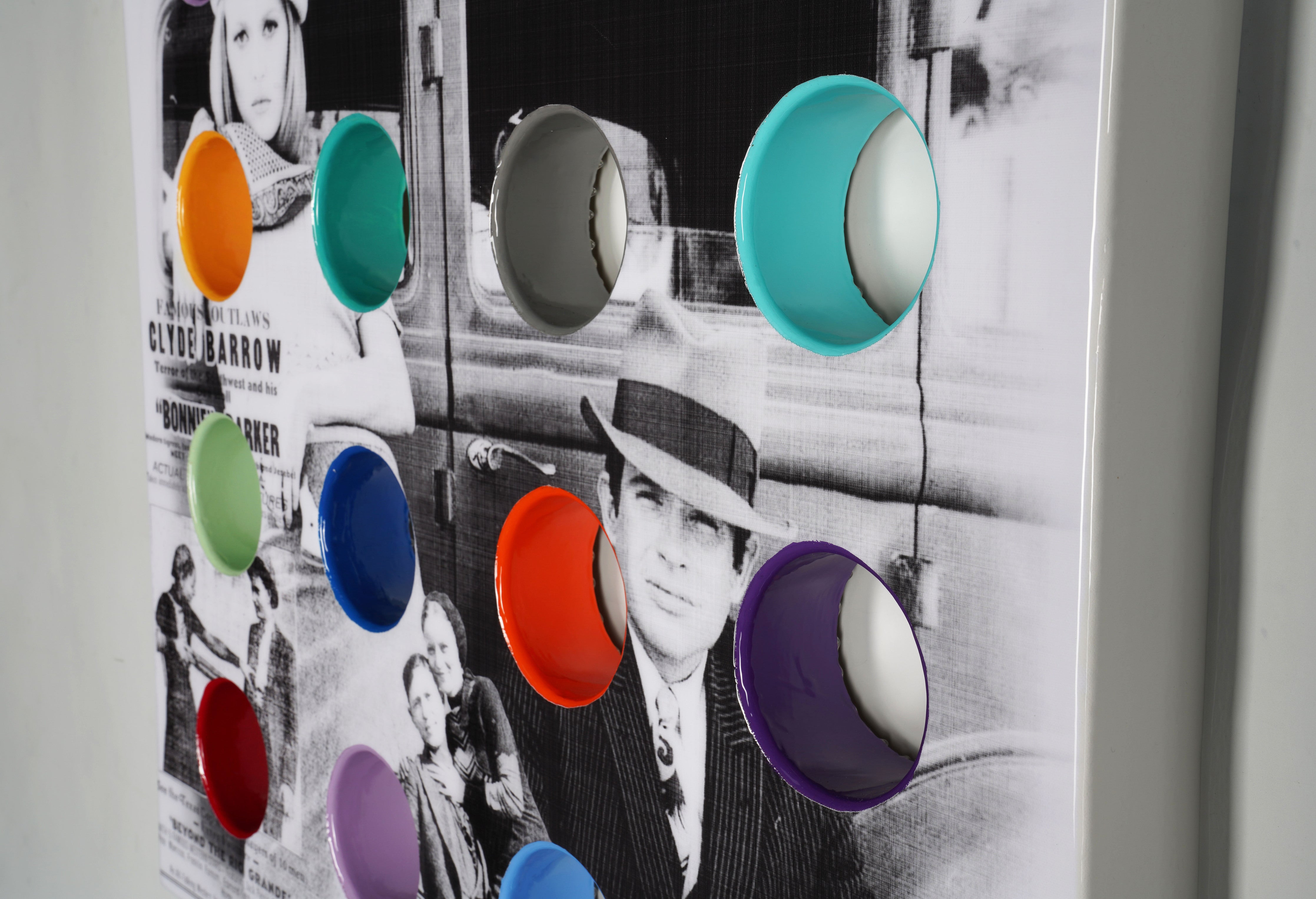 Depicting not only production photographs from the 1967 American crime film Bonnie and Clyde but also images of the real criminal couple, this extraordinary original artwork by the Bisaillon Brothers is a fascinating example of their Pop Simplicity series.