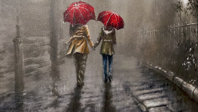 A casually dressed couple walking hand-in-hand down an empty street, sheltered from the rain by Barker’s beloved red heart umbrellas. The union between the pair is symbolised by Barker’s touching umbrella motif, which began after he started doodling umbrellas and noticed a heart shape taking form. Whilst the buildings are traditional to the Yorkshire mill towns of Barker’s youth, this romantic scene is timeless.