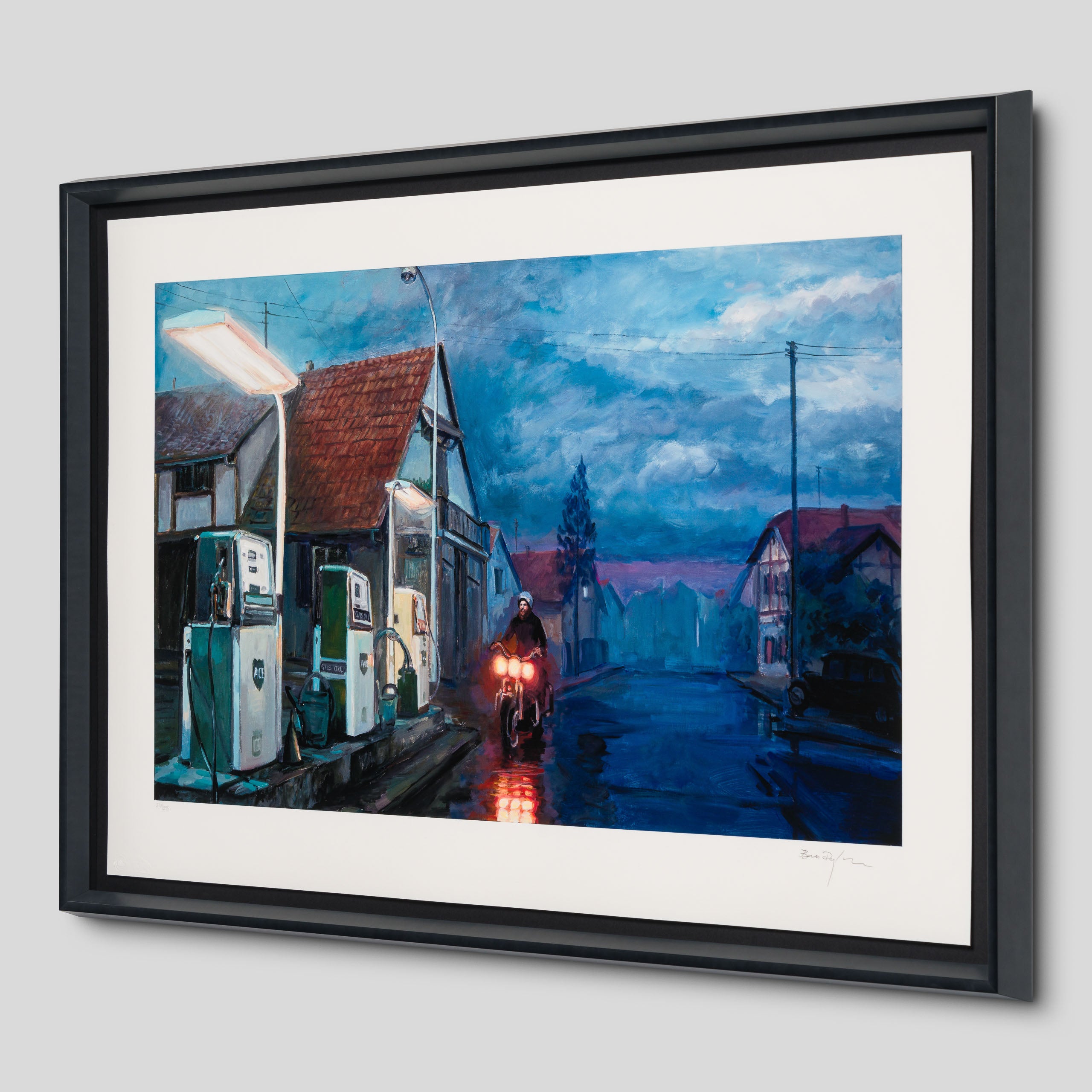 Dylan’s cinematic references result in evocative, often mysterious, compositions suspended between life and theatre, while conjuring a distinctly tangible pictorial experience. Although these new works prominently depict figures and portraits, much of the iconography that was featured in Dylan’s earlier series The Beaten Path is still recognisable – diners, motels, roadsides and city streets.