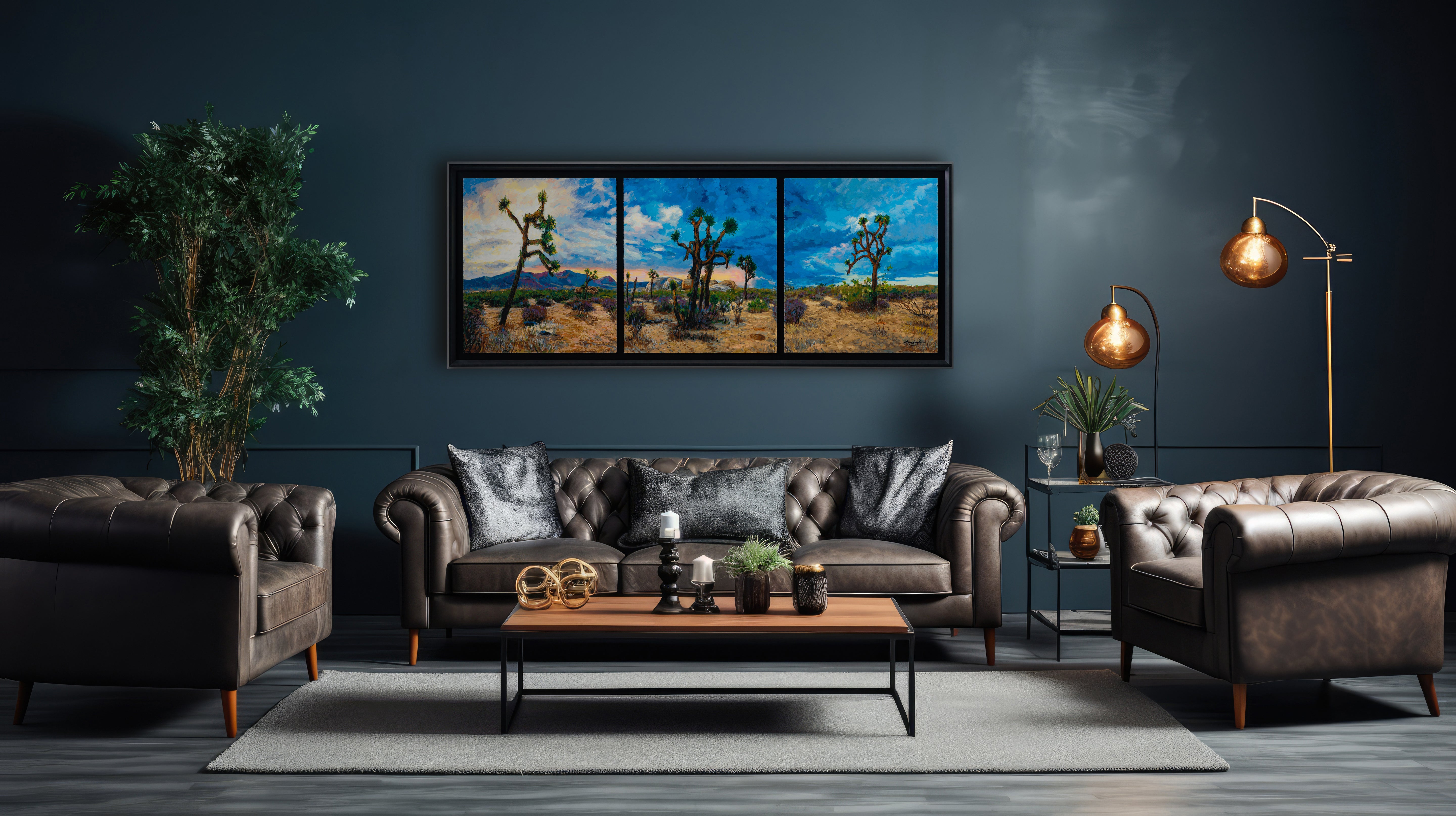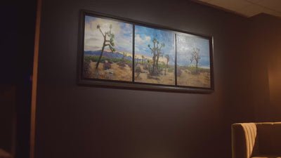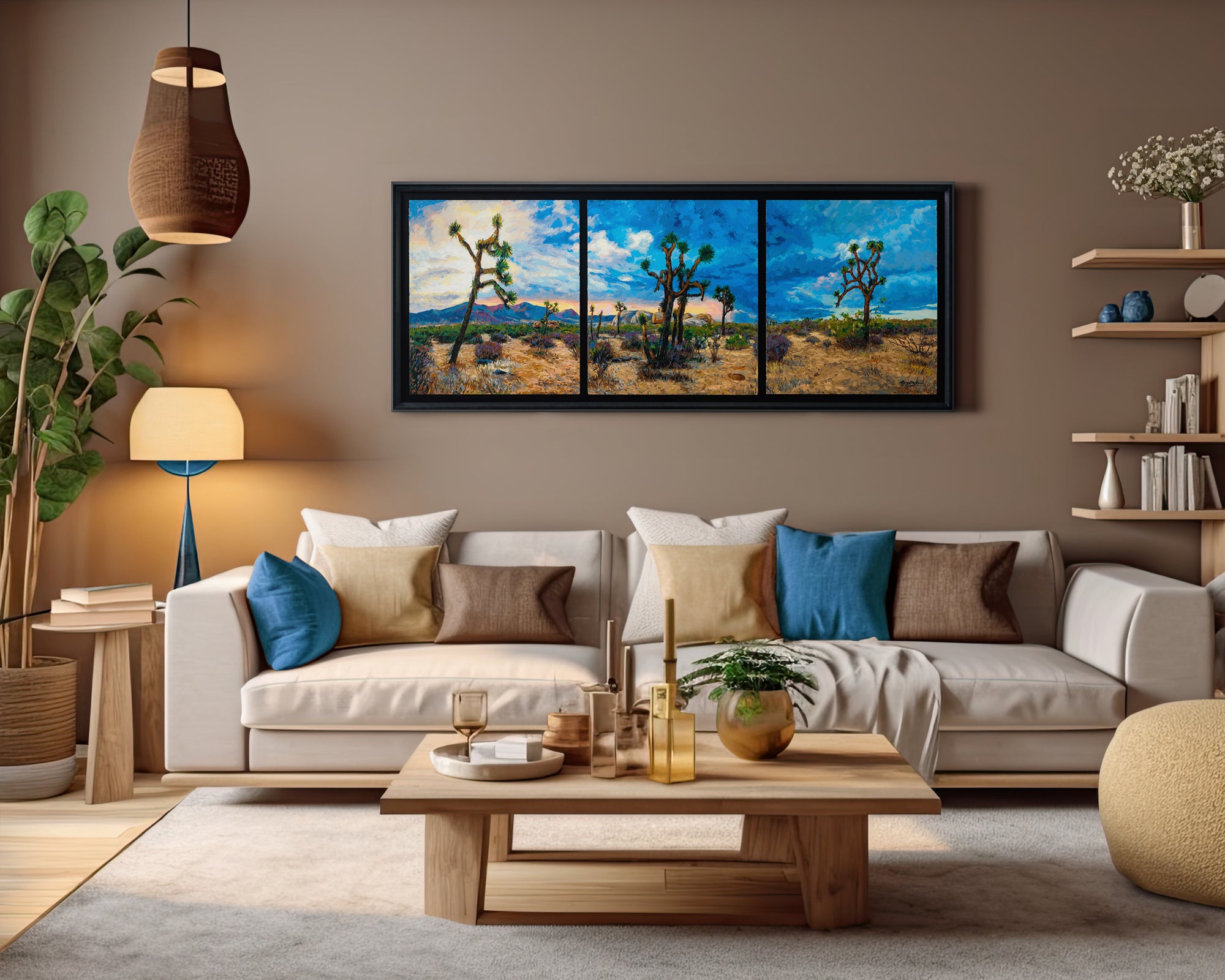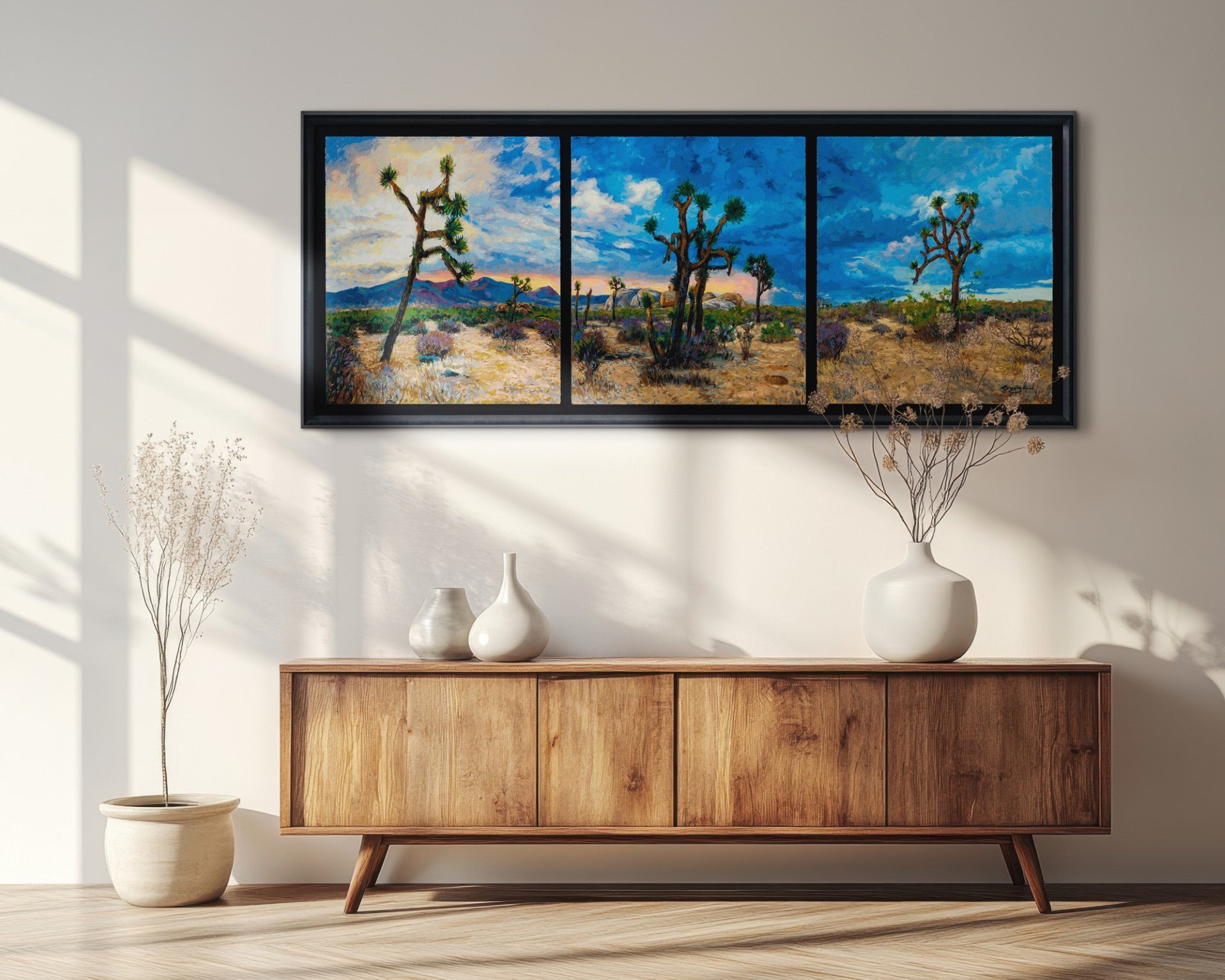 Depicting Joshua Tree National Park in California, this triptych reflects Dylan’s fascination with untouched landscapes – where nature speaks without interruption. This portrayal of the Mojave Desert reveals its raw, understated beauty. It offers a suspended moment of stillness beneath a sky in quiet transformation, evoking a harmonious balance between landscape, light and atmosphere.