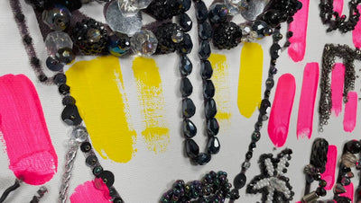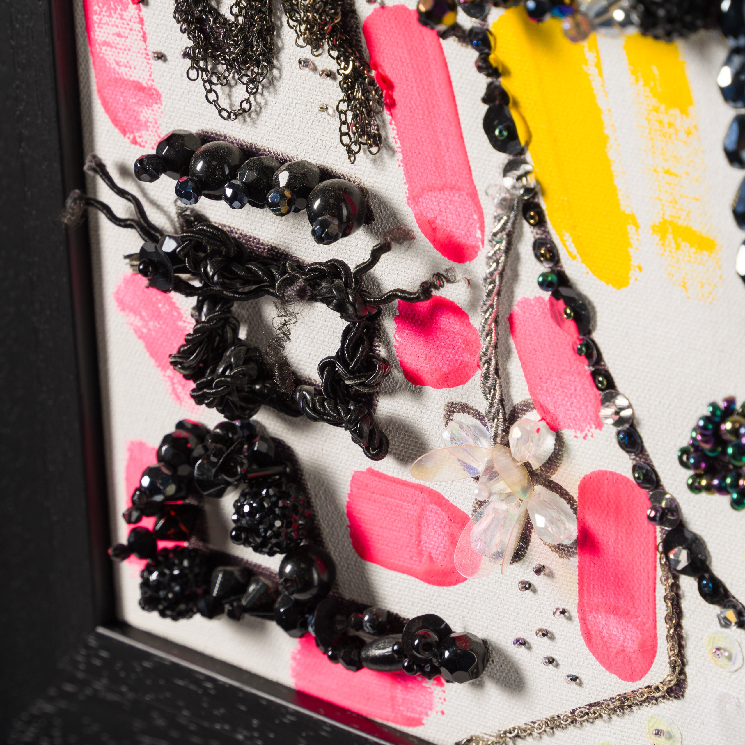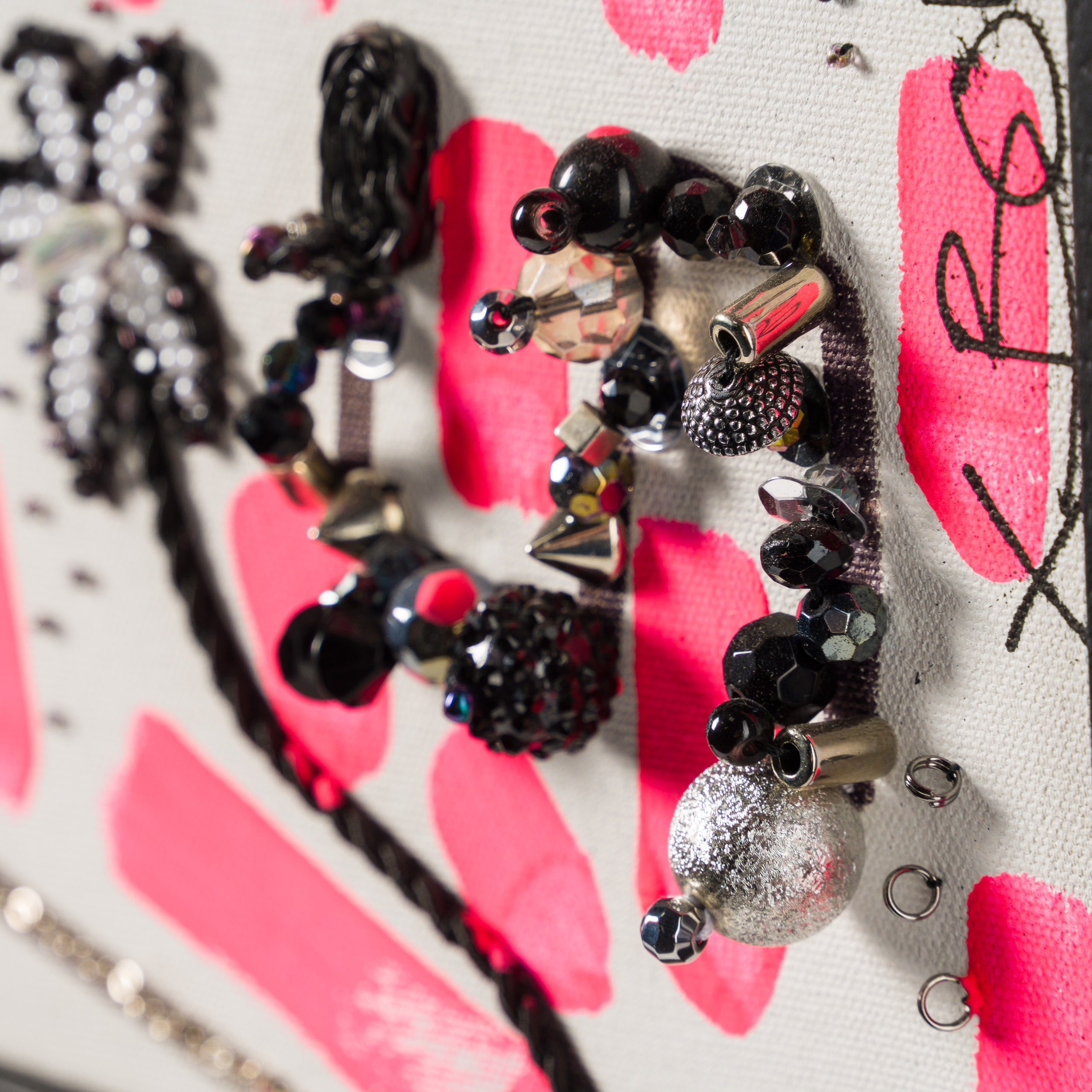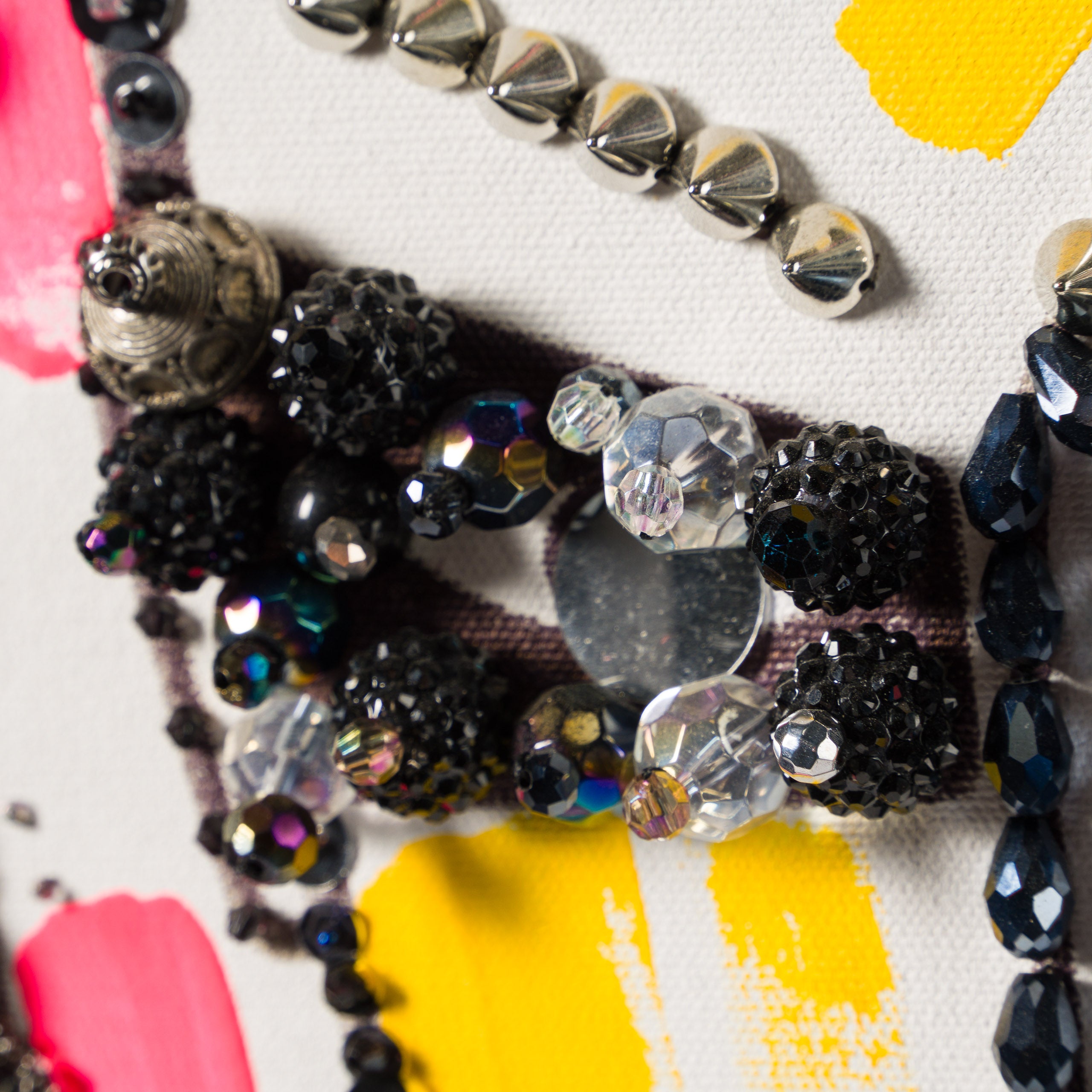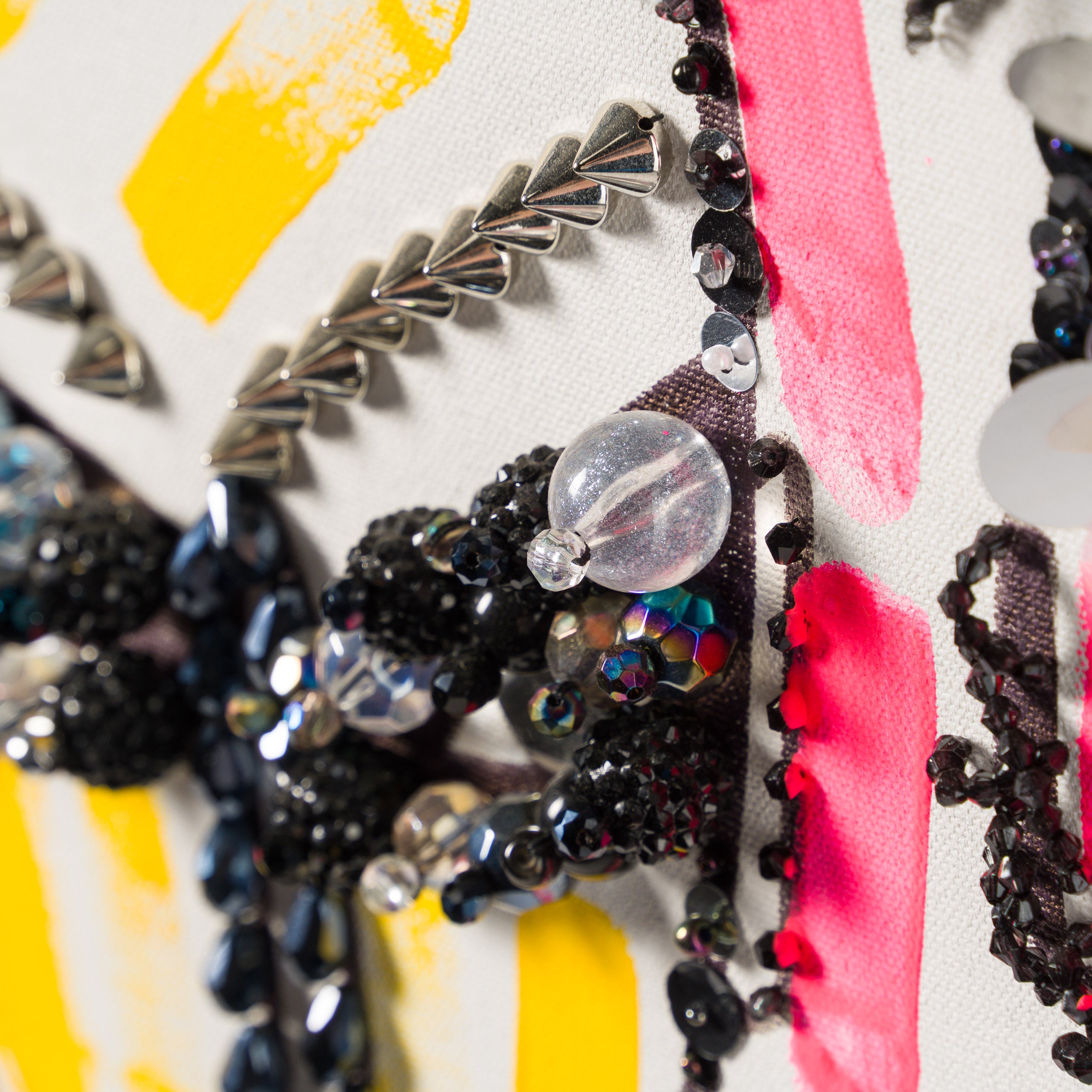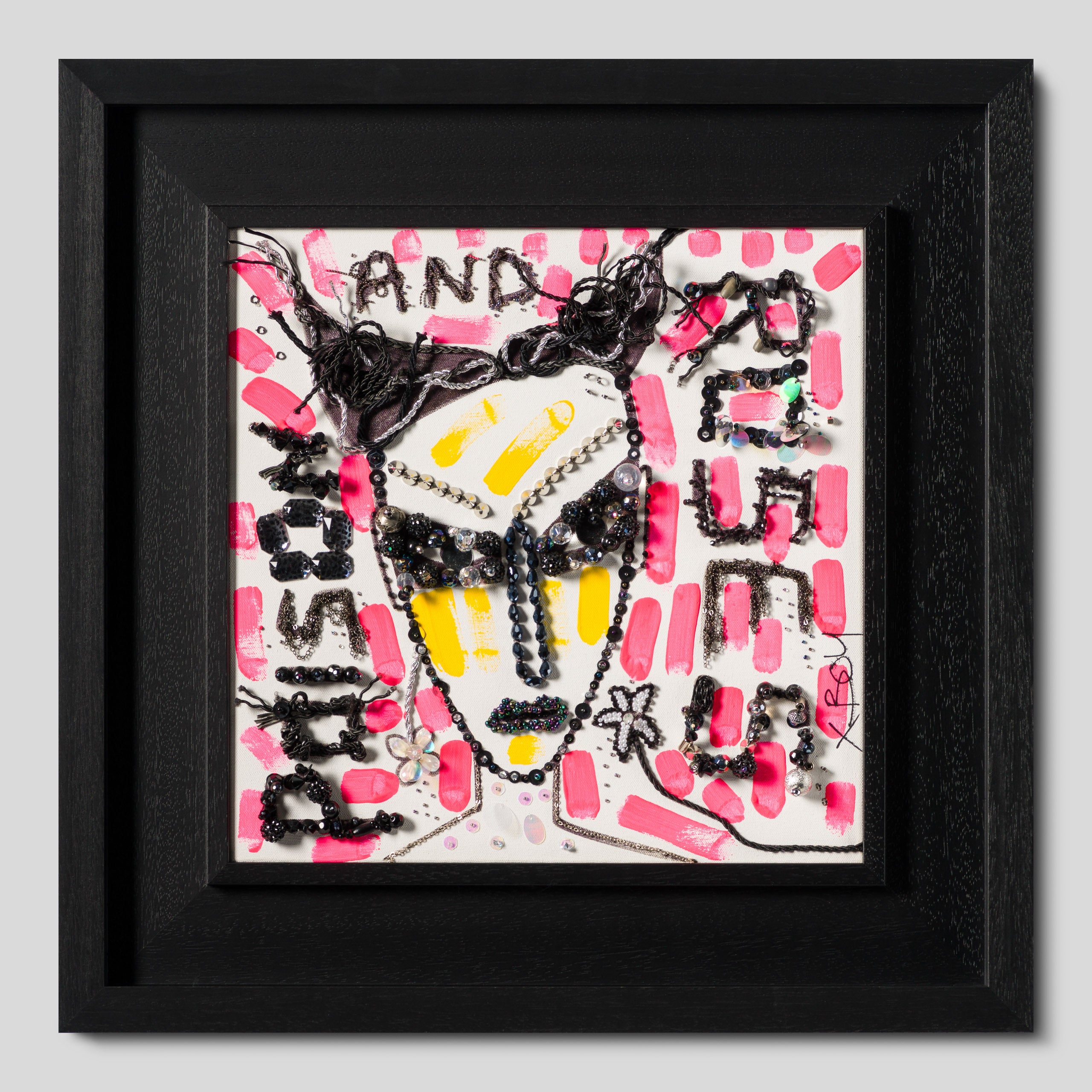 Taken from the title of his 2022 track ‘Poison and Roses’, in this piece Boy George reflects on his long-term friendship with legendary London club promoter Philip Sallon – a figure that often appears in his art and music. Emphasising Sallon’s memorable ‘horned’ hairstyle, the artwork features delicate beading, tangled string and imperfectly placed pearls and sequins, revealing the ‘punk opulence’ of Sallon’s style.