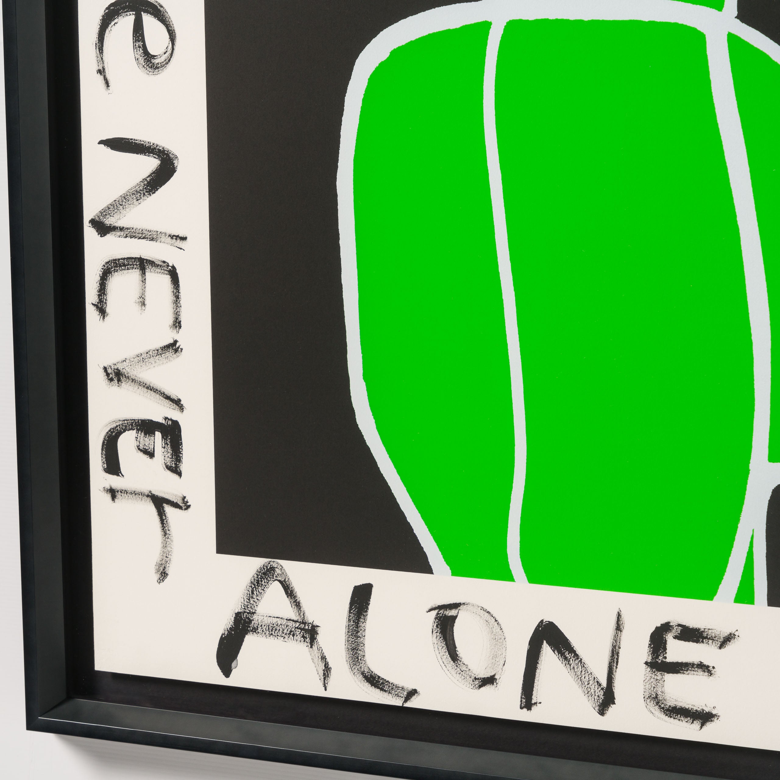 Stripping away any adornments and accessories, we see a powerful image of Boy George’s signature scarman figure, looking wild with scowling brows and a sweet smile. These added facial features represent the characterisation of Boy George and the iconic image the public has come to expect. Featuring the words ‘WE ARE NEVER ALONE’ hand-written in the border, the scarman represents us all, healing the scars of our own emotional wounds and tough experiences. The title is taken from a lyric in Bowie’s track ‘The Jean Genie’, an homage to America’s finest creatives.