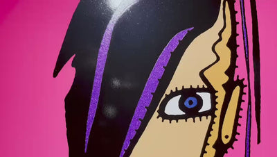 Firstly, depending on the prints requirements, an initial print pass using archival pigments is used to map out the design (this has been used on “Colour By Numbers” and “Purple Reign” which then have silkscreen overlays). Two of the works, “Madame X” and “Yamamoto” are predominantly silkscreen. Next, sections are picked out using “glitter gloss”; a process which involves screening inks containing fine glitter suspended within. Further embellishment is then added to finish the works; this being a silkscreen varnish to pick out George’s black line work and silver leaf (silver leaf is used on “Madame X” and “Purple Reign)