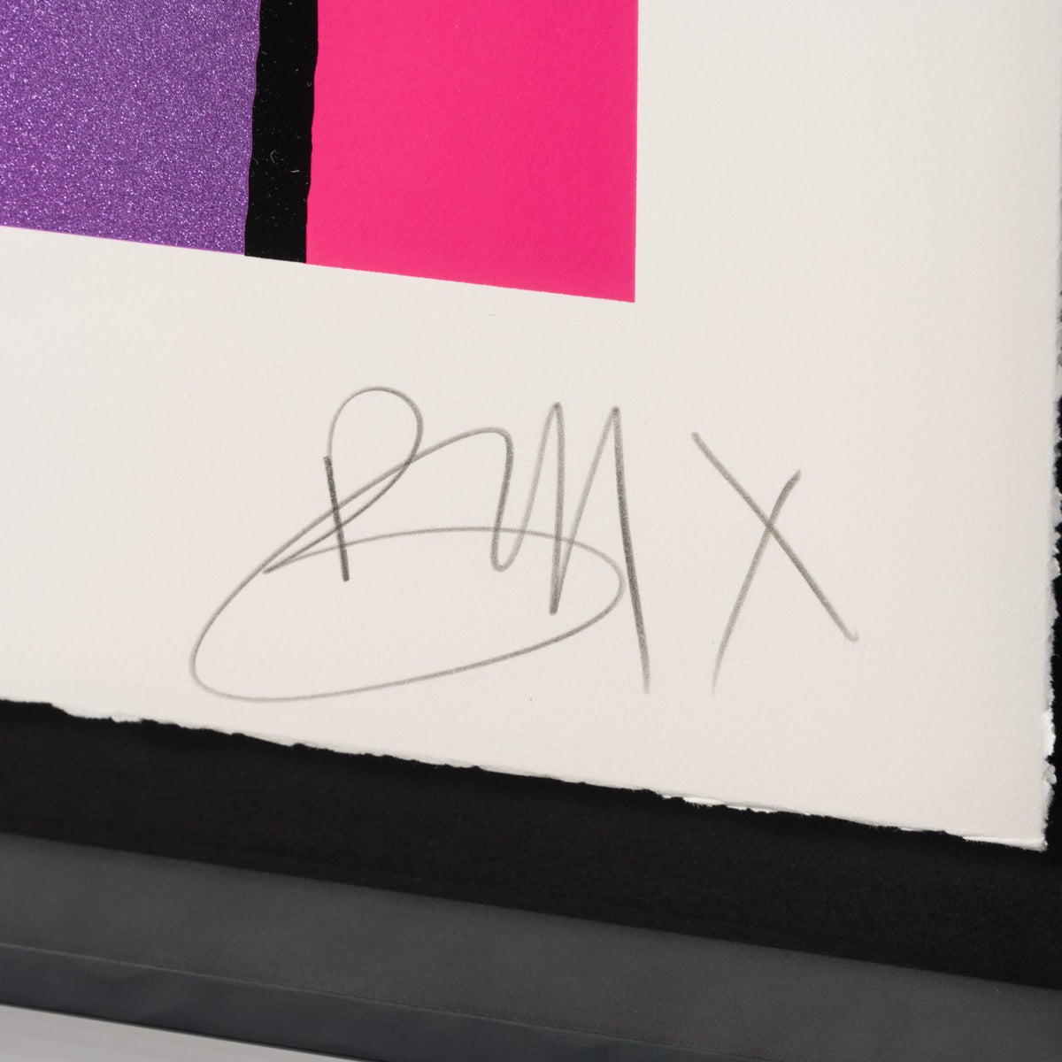 Firstly, depending on the prints requirements, an initial print pass using archival pigments is used to map out the design (this has been used on “Colour By Numbers” and “Purple Reign” which then have silkscreen overlays). Two of the works, “Madame X” and “Yamamoto” are predominantly silkscreen. Next, sections are picked out using “glitter gloss”; a process which involves screening inks containing fine glitter suspended within. Further embellishment is then added to finish the works; this being a silkscreen varnish to pick out George’s black line work and silver leaf (silver leaf is used on “Madame X” and “Purple Reign)