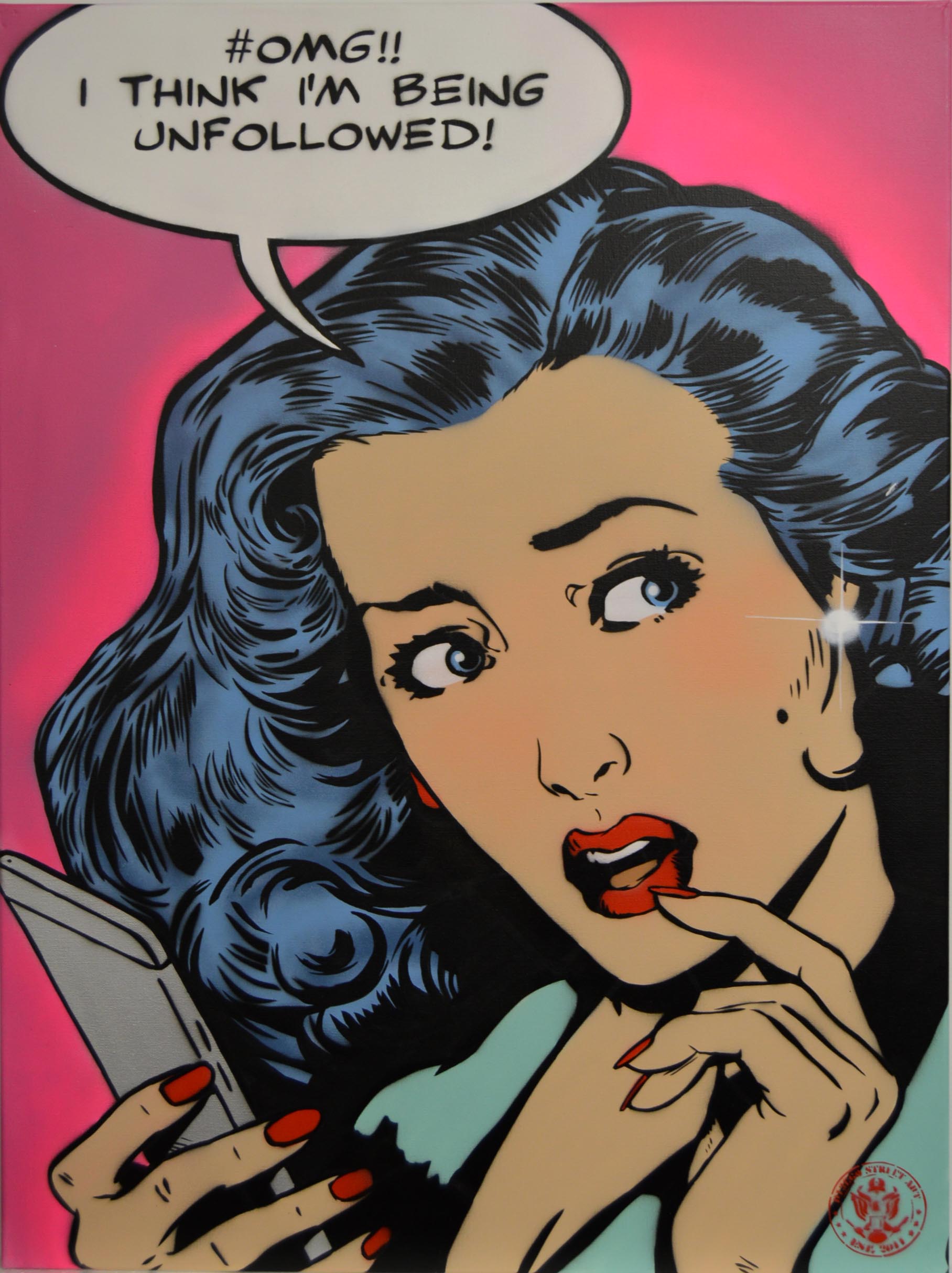 Italian-born painter D13ego is based in London. His comic book inspired paintings combine pop art and street art aesthetics while commenting on the commercialism of Western culture.