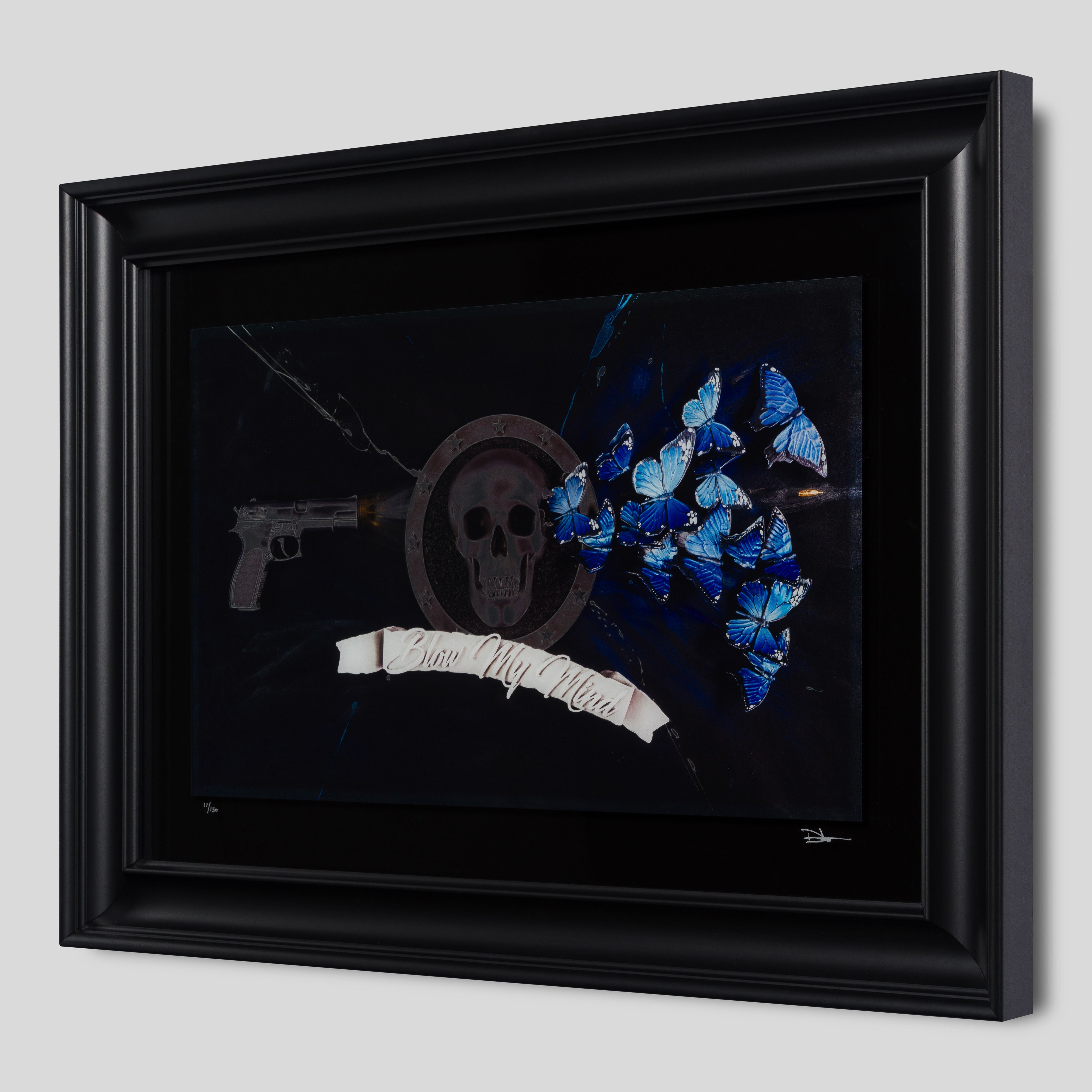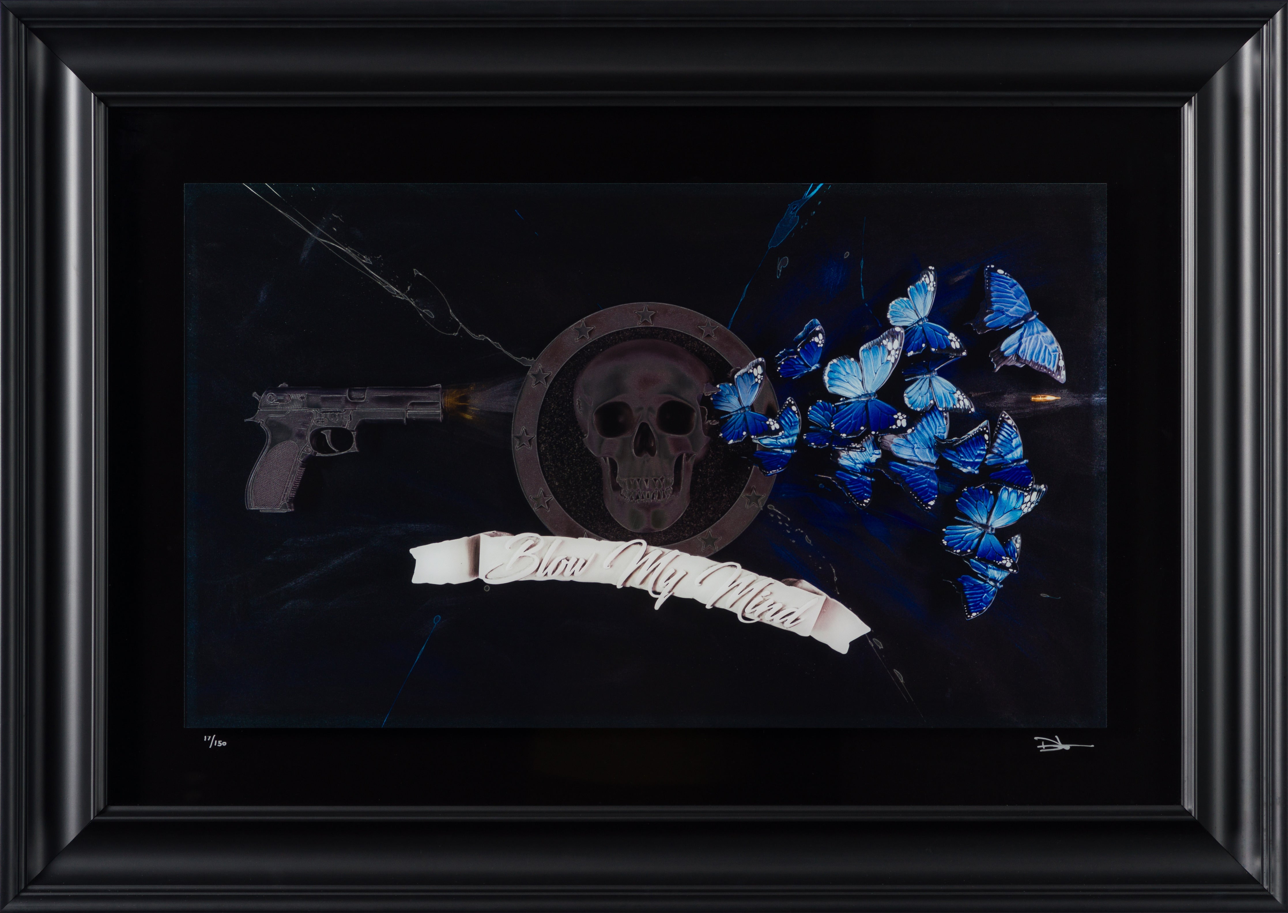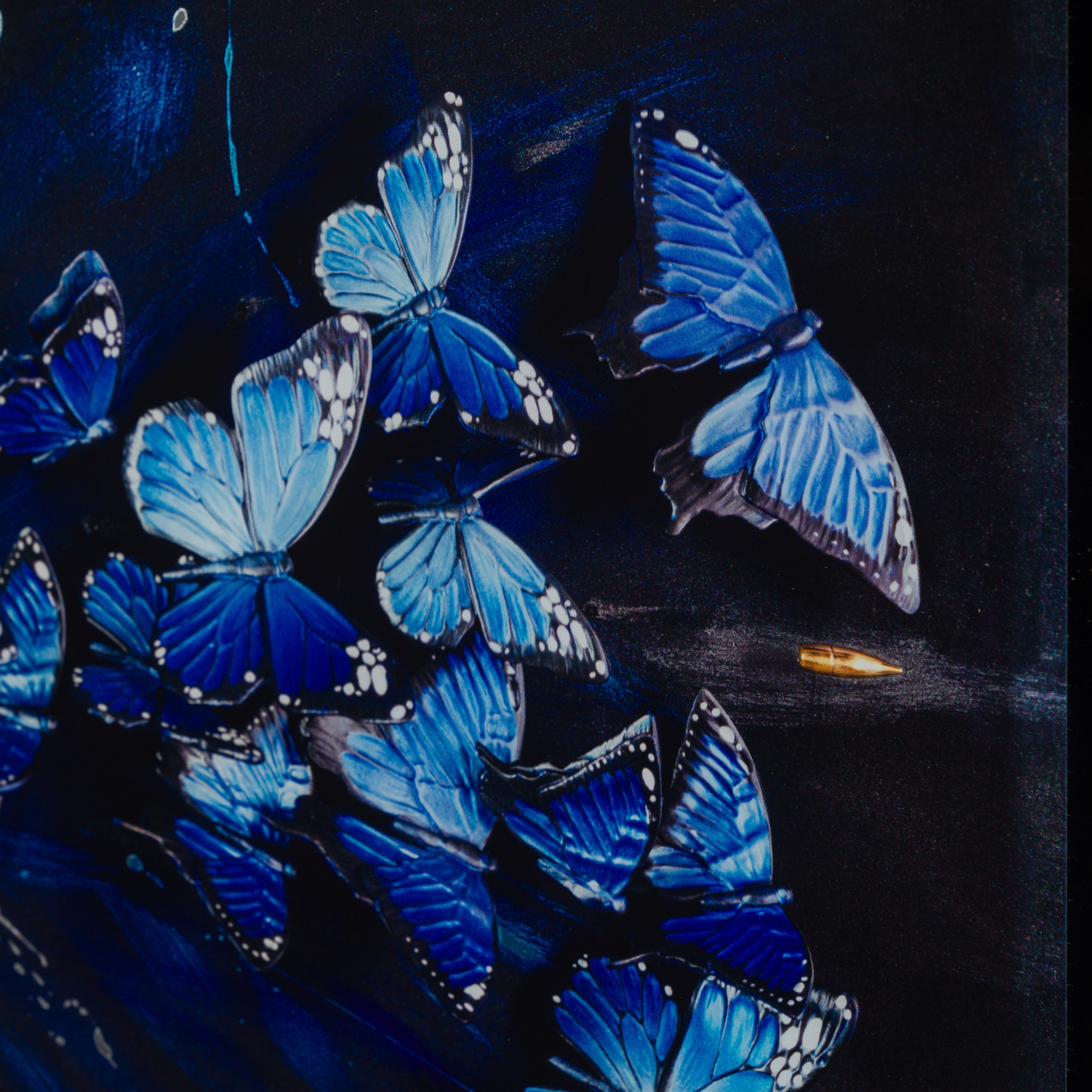 Bursting into life in an almost 3D effect, the eye-catching butterflies represent the best of humanity and nature, whilst the gun and bullet symbolise the dark side of life. The metallic elements and glass finish complement the razor-sharp detail, which was originally created by a process of giclée-printing on the back of toughened glass before adding a chrome foil to give an amazing highlight effect.