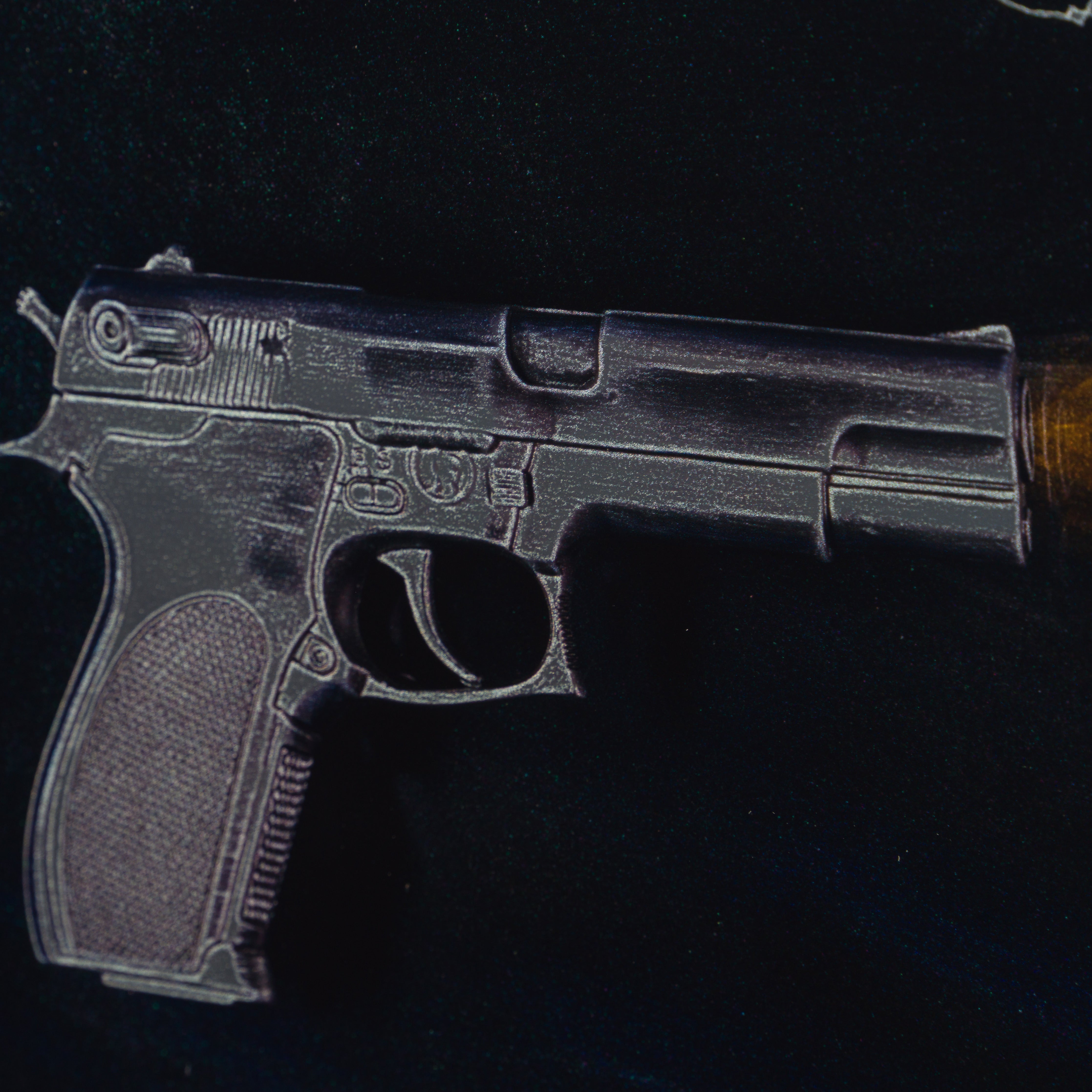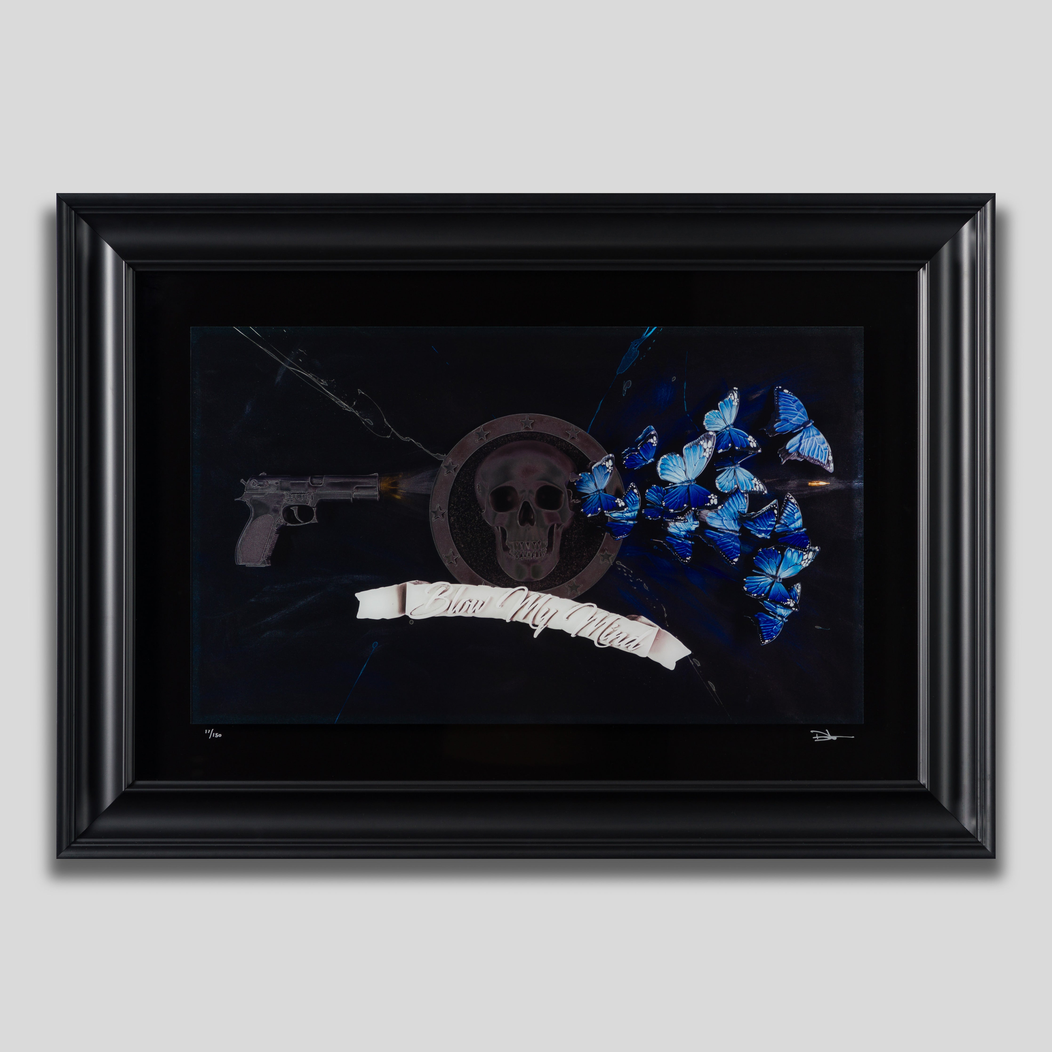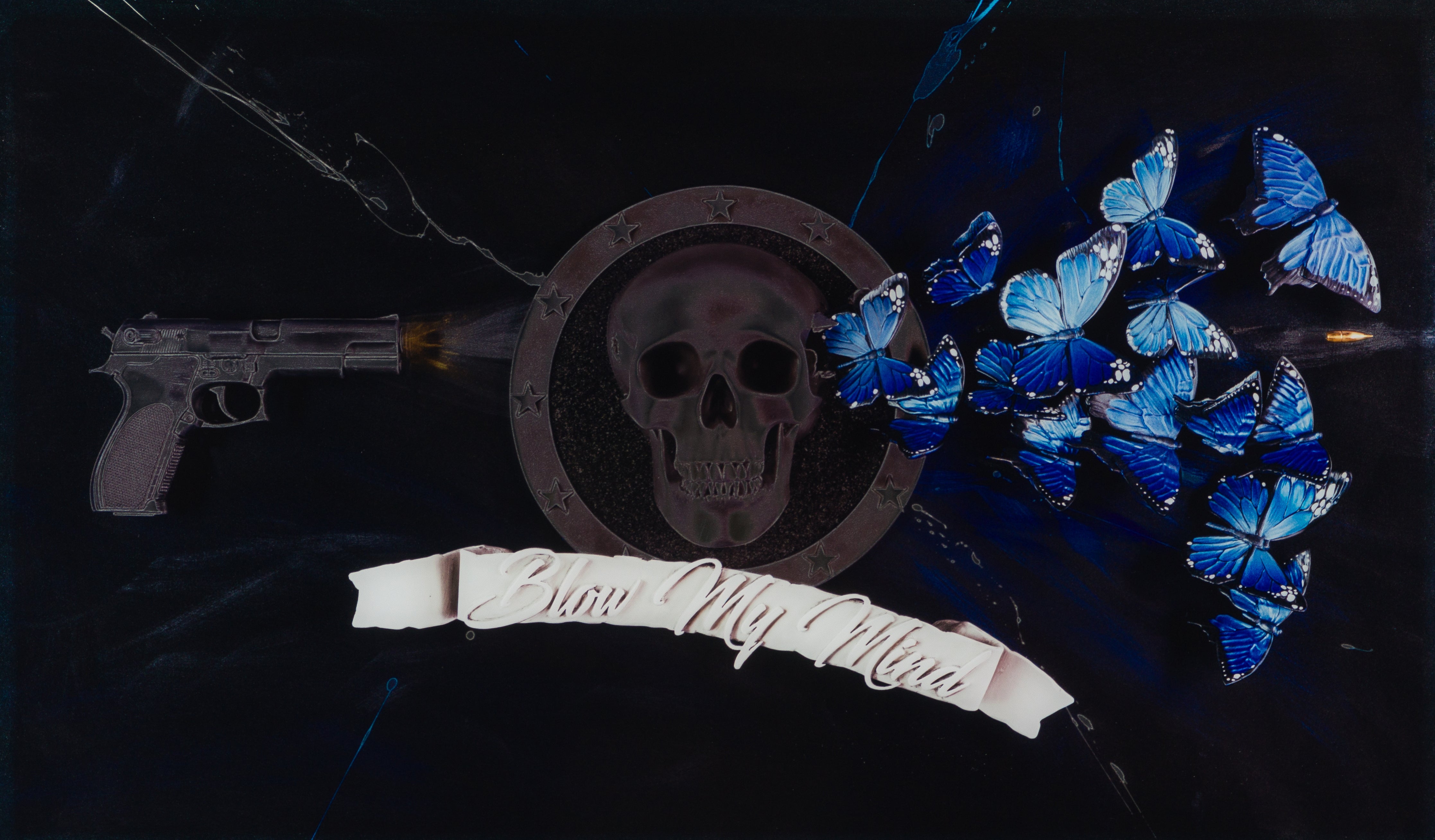 Bursting into life in an almost 3D effect, the eye-catching butterflies represent the best of humanity and nature, whilst the gun and bullet symbolise the dark side of life. The metallic elements and glass finish complement the razor-sharp detail, which was originally created by a process of giclée-printing on the back of toughened glass before adding a chrome foil to give an amazing highlight effect.