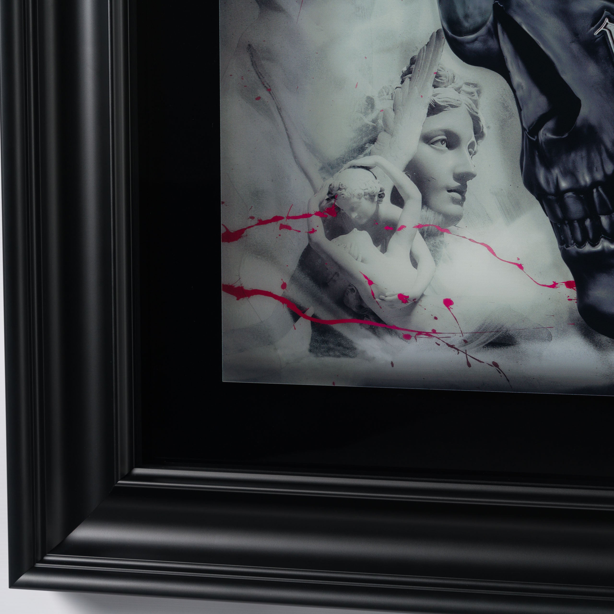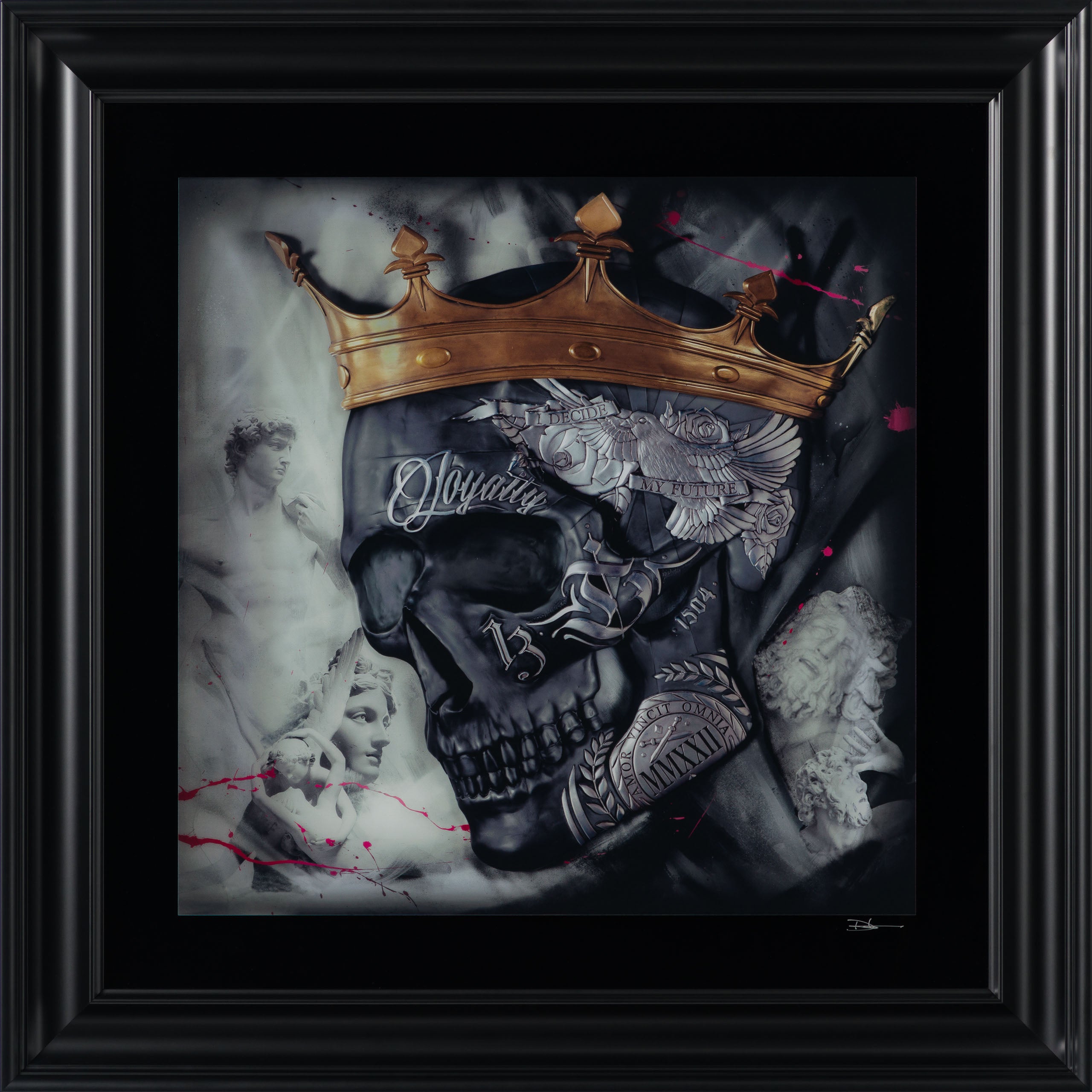 Elegantly portrayed on glass, in this bold and luxurious limited edition, Dan Lane revisits some of his beloved themes from his earlier work. In “Heavy Is The Head That Wears The Crown”, the artist fuses his classical baroque sculpture style and the drama they convey with his own style and its iconic elements. Whilst the Iron and Silver Leaf piece is bold and dramatic, the title evokes an element of humbleness and simplicity.