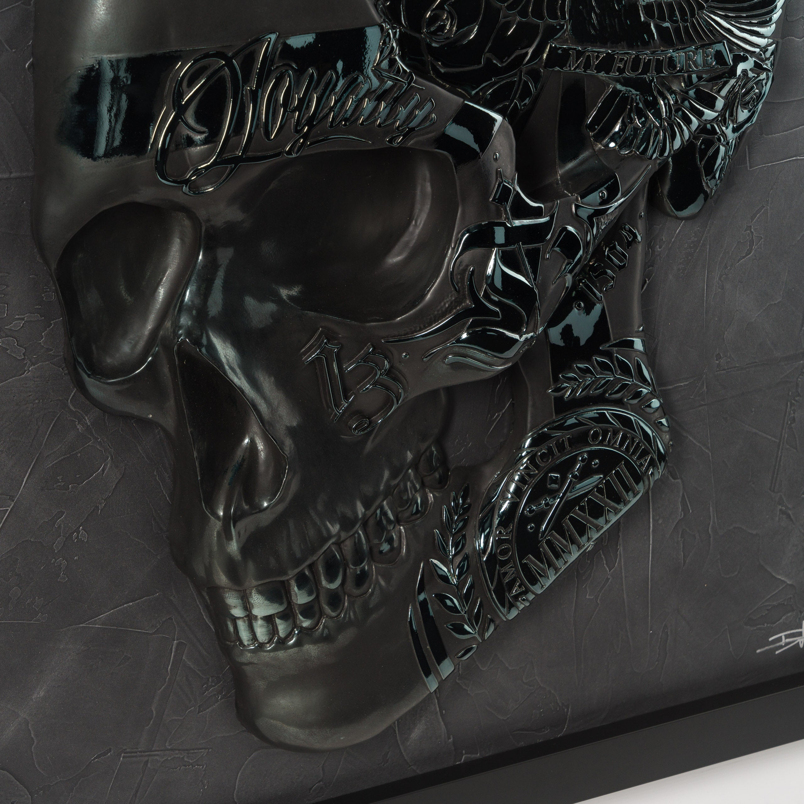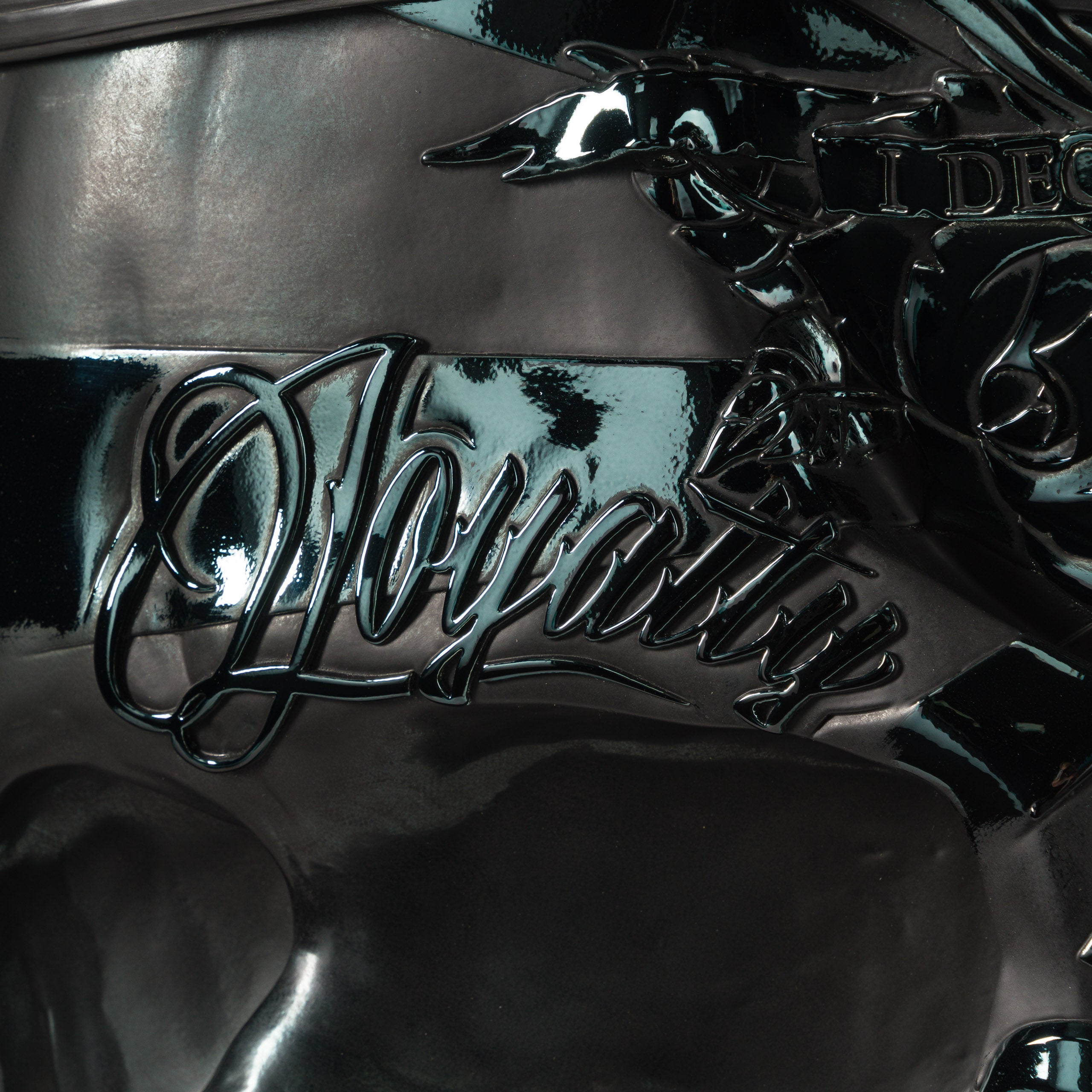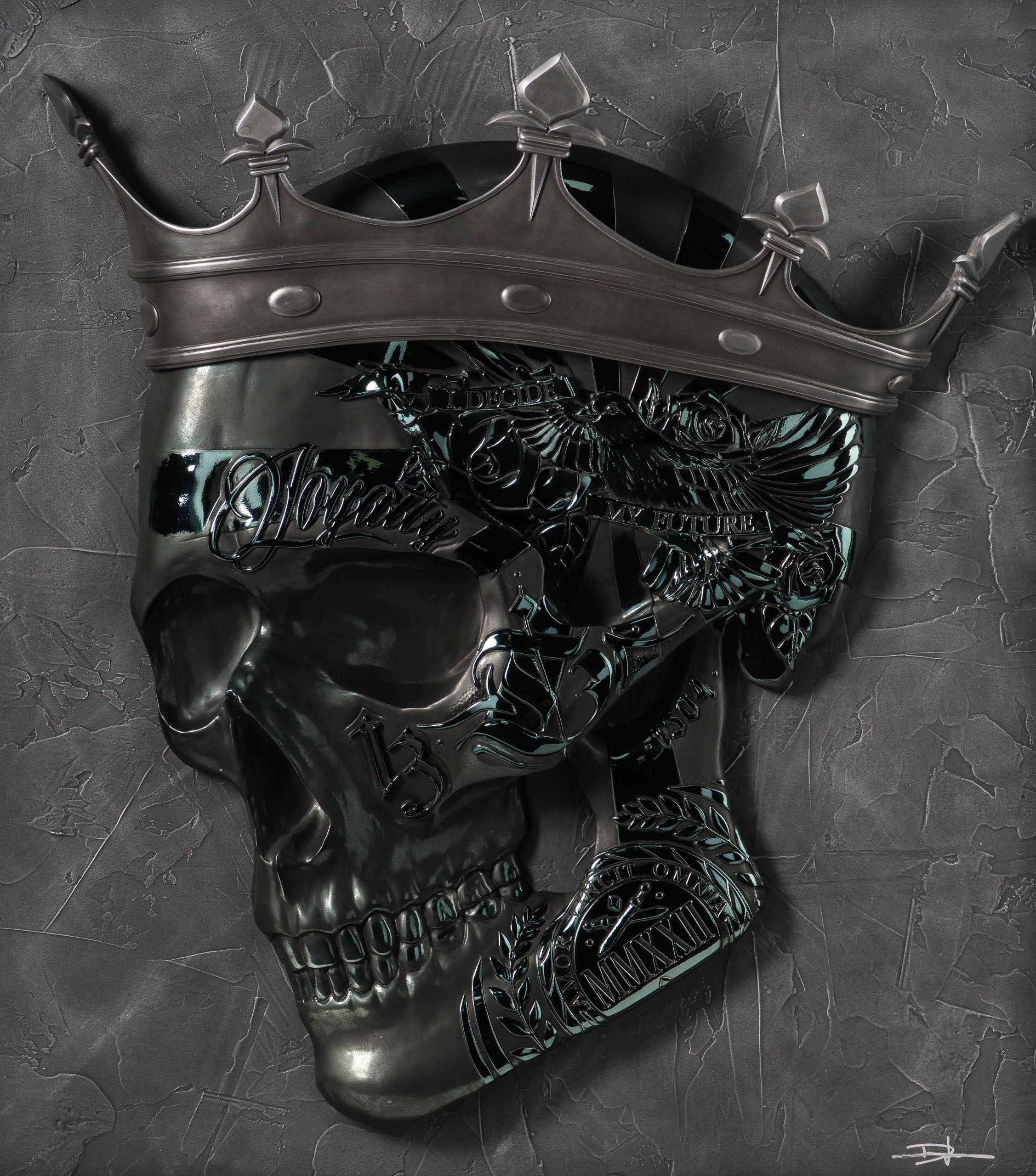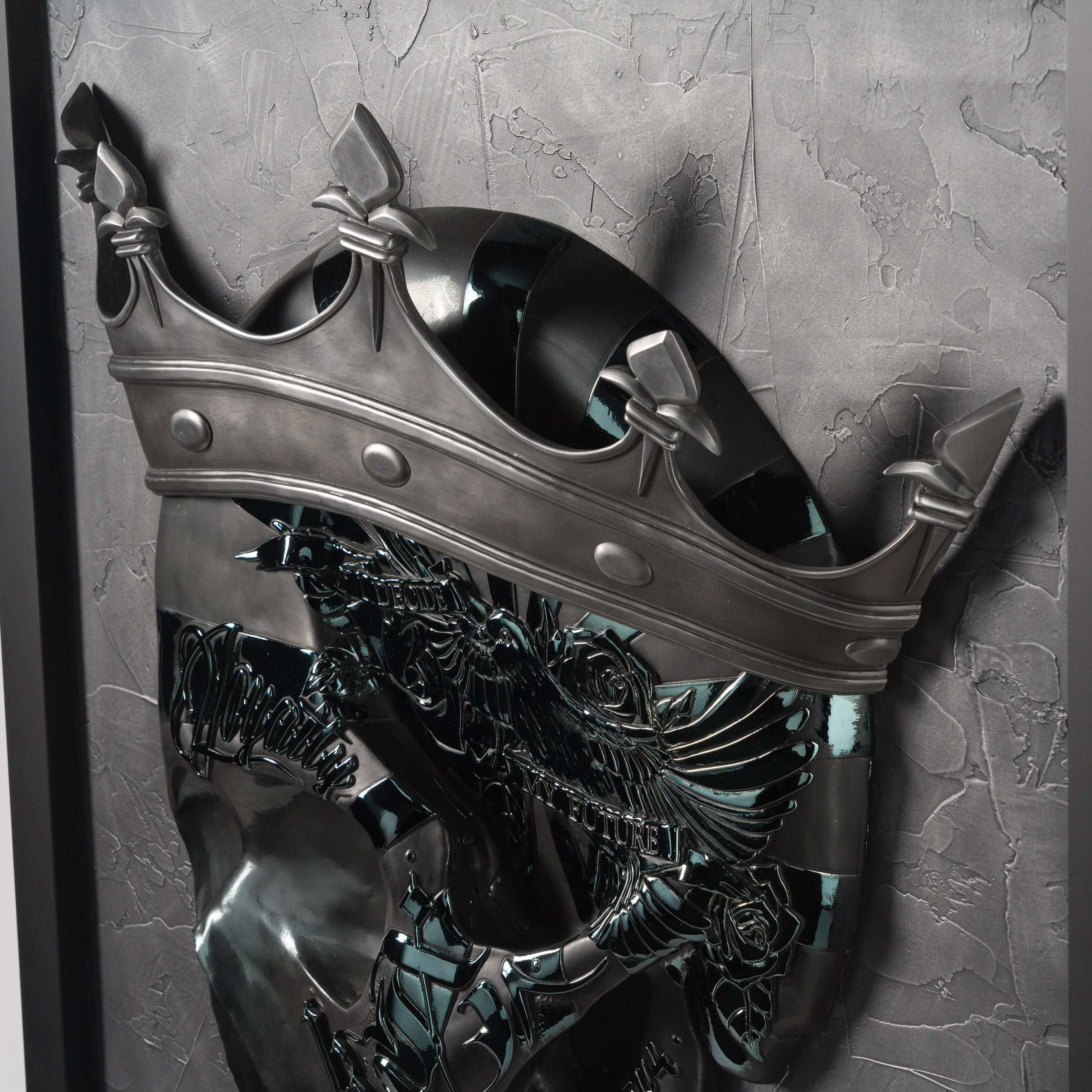 Elegantly portrayed on glass, in this bold and luxurious limited edition, Dan Lane revisits some of his beloved themes from his earlier work. In “Heavy Is The Head That Wears The Crown”, the artist fuses his classical baroque sculpture style and the drama they convey with his own style and its iconic elements. Whilst this original piece is bold and dramatic, the title evokes an element of humbleness and simplicity.