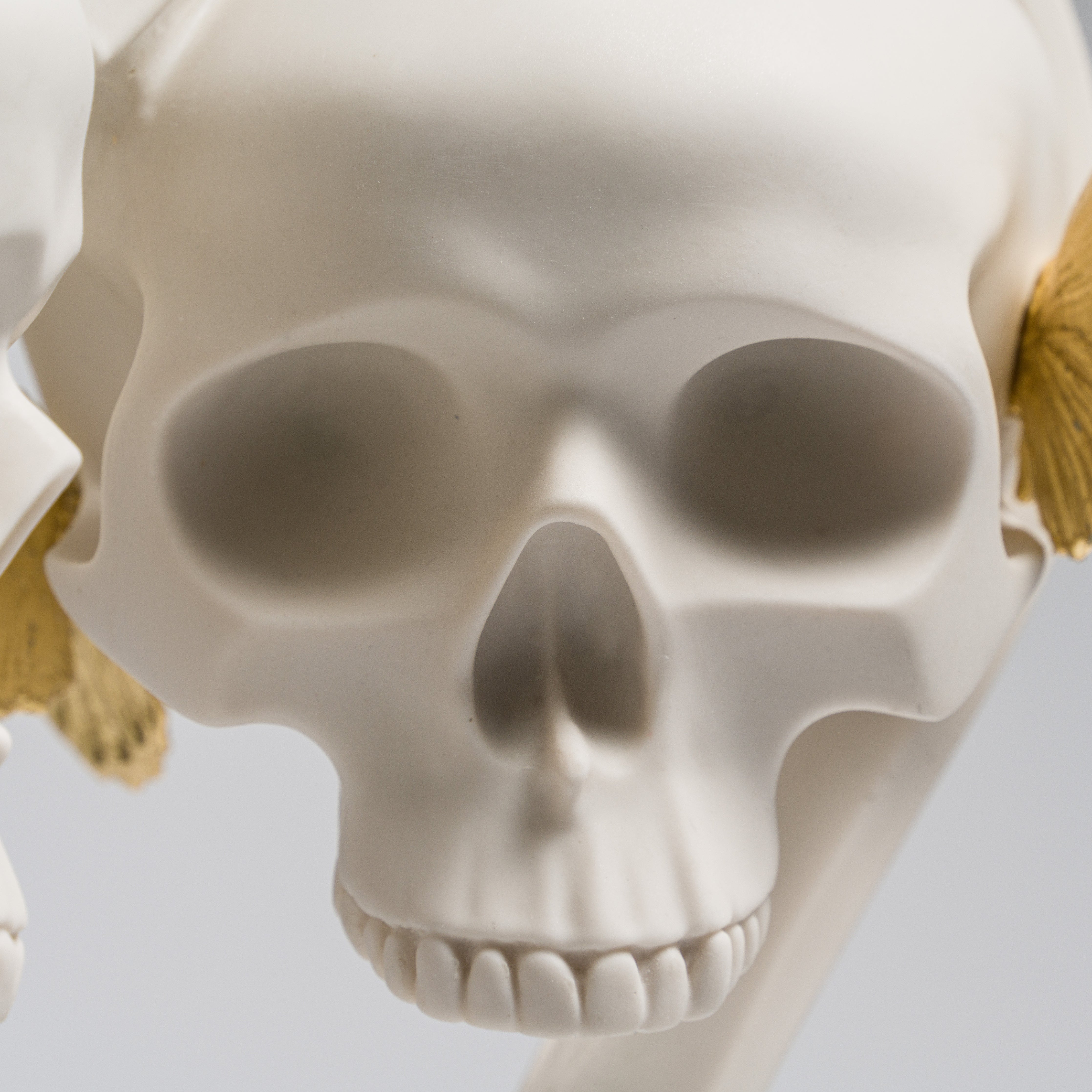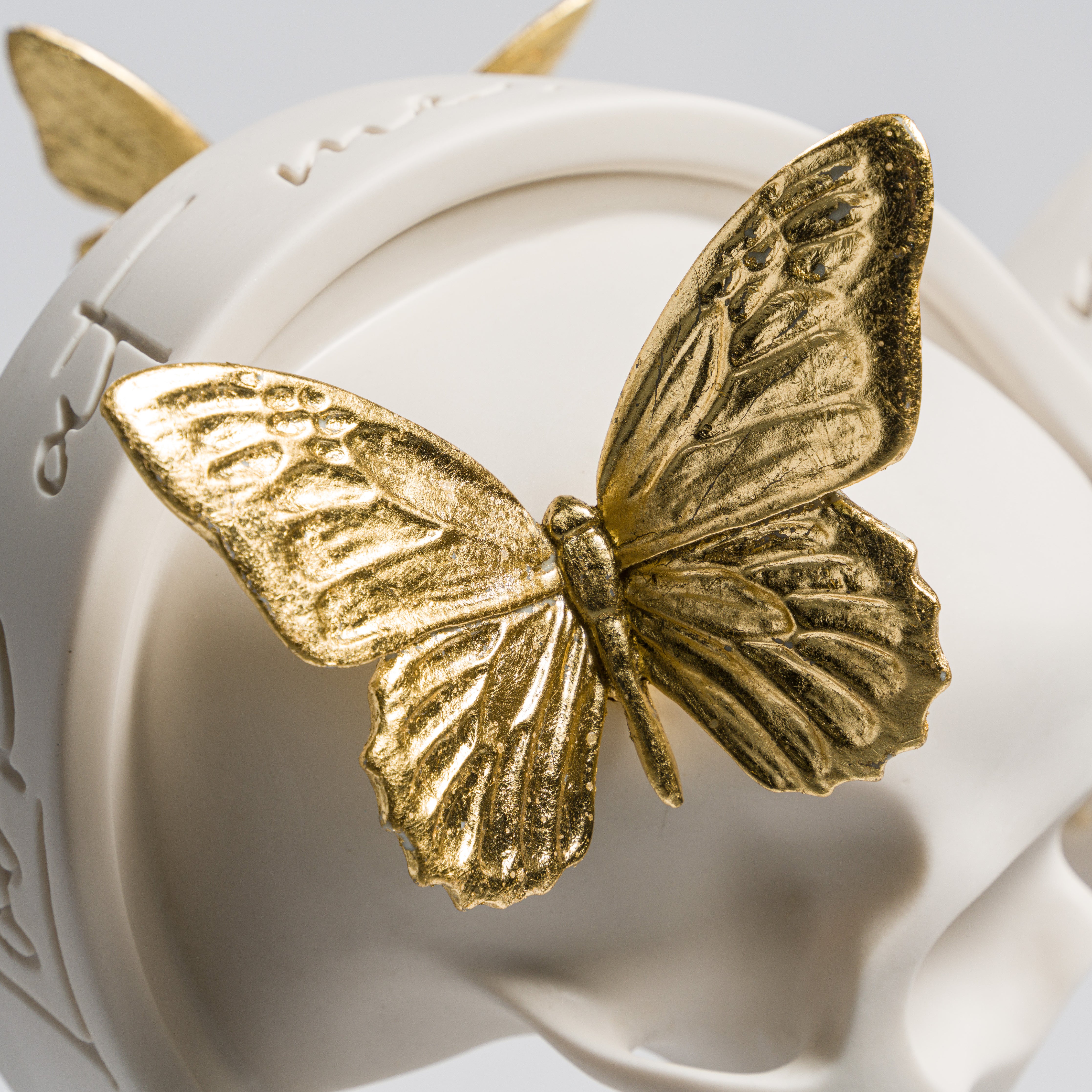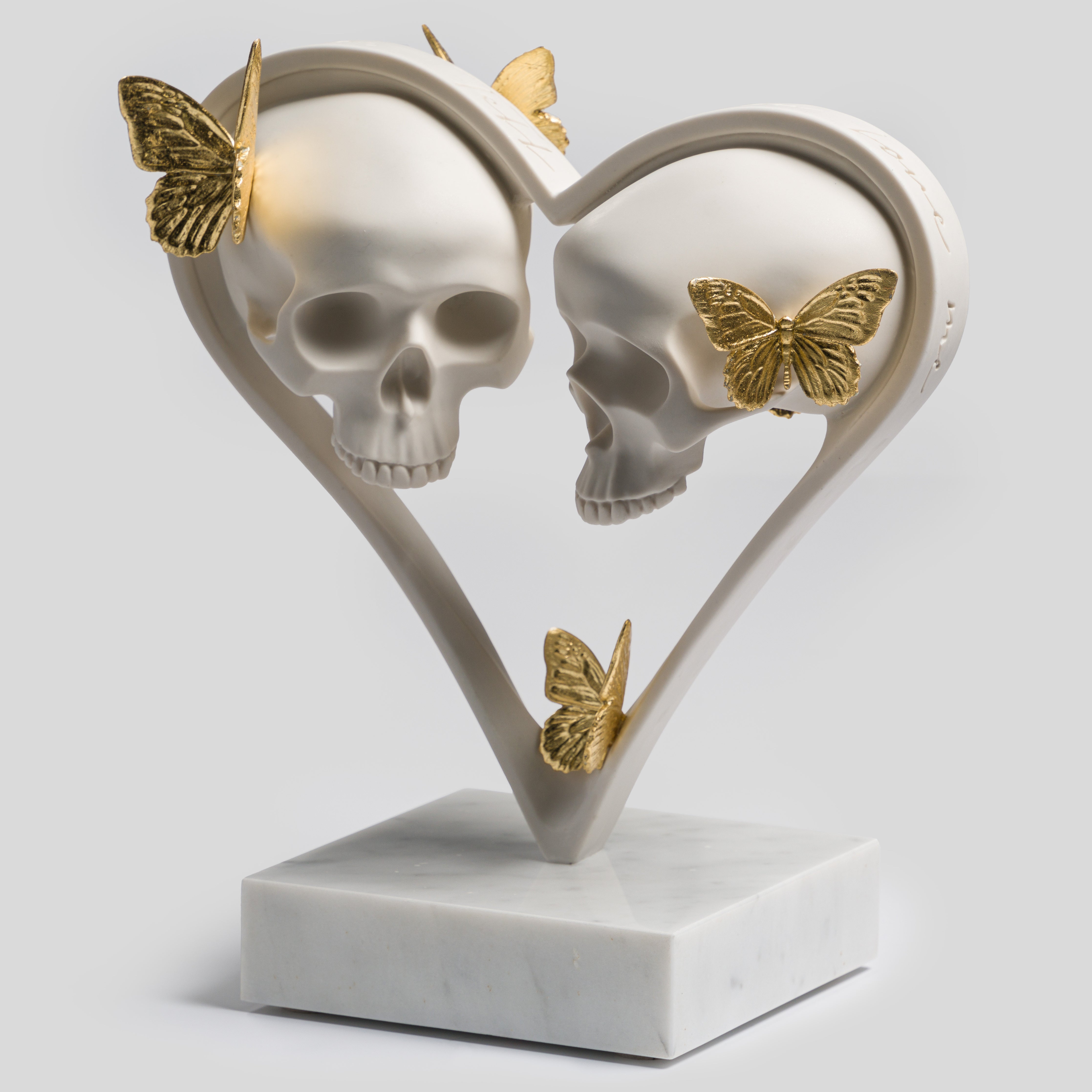 This delicate and meticulous sculpture is for those who celebrate love in all its shades. ‘Look at Me, Tell Me You Love Me’ features a pair of skulls in the centre of a heart, surrounded by golden butterflies, all atop a marble base. The title of the sculpture is carved on top of the heart, echoing Dan’s desire to make his pieces exciting to view from all angles.