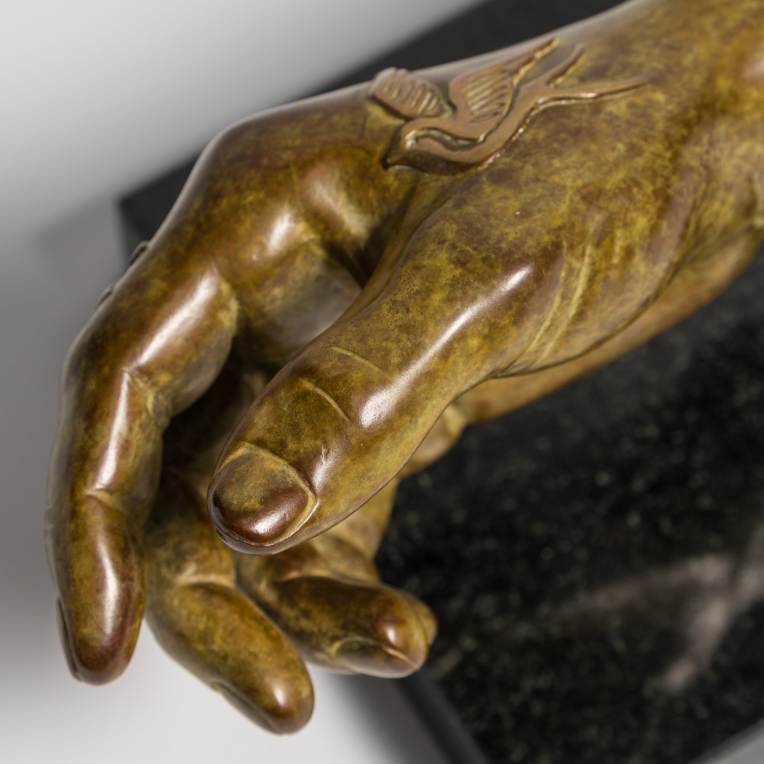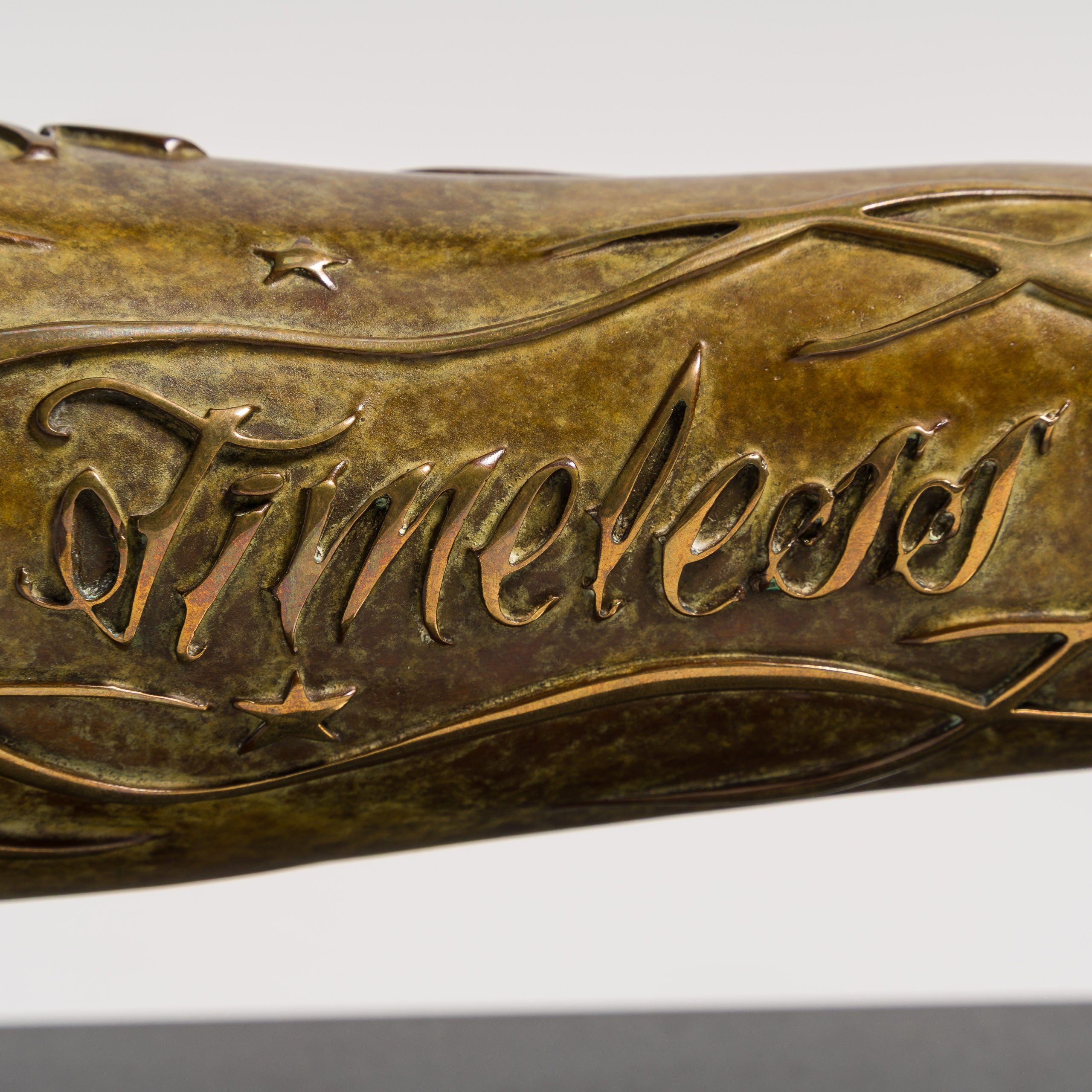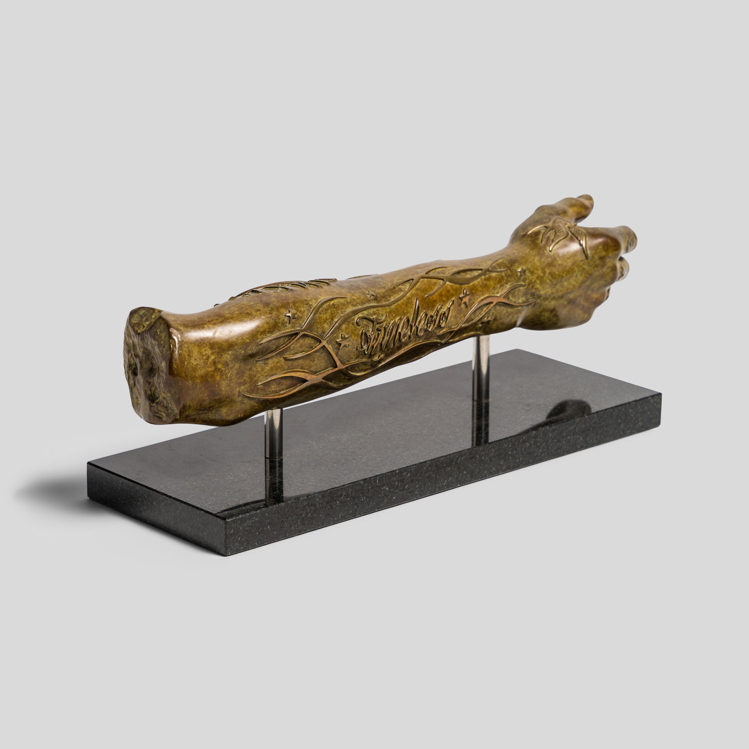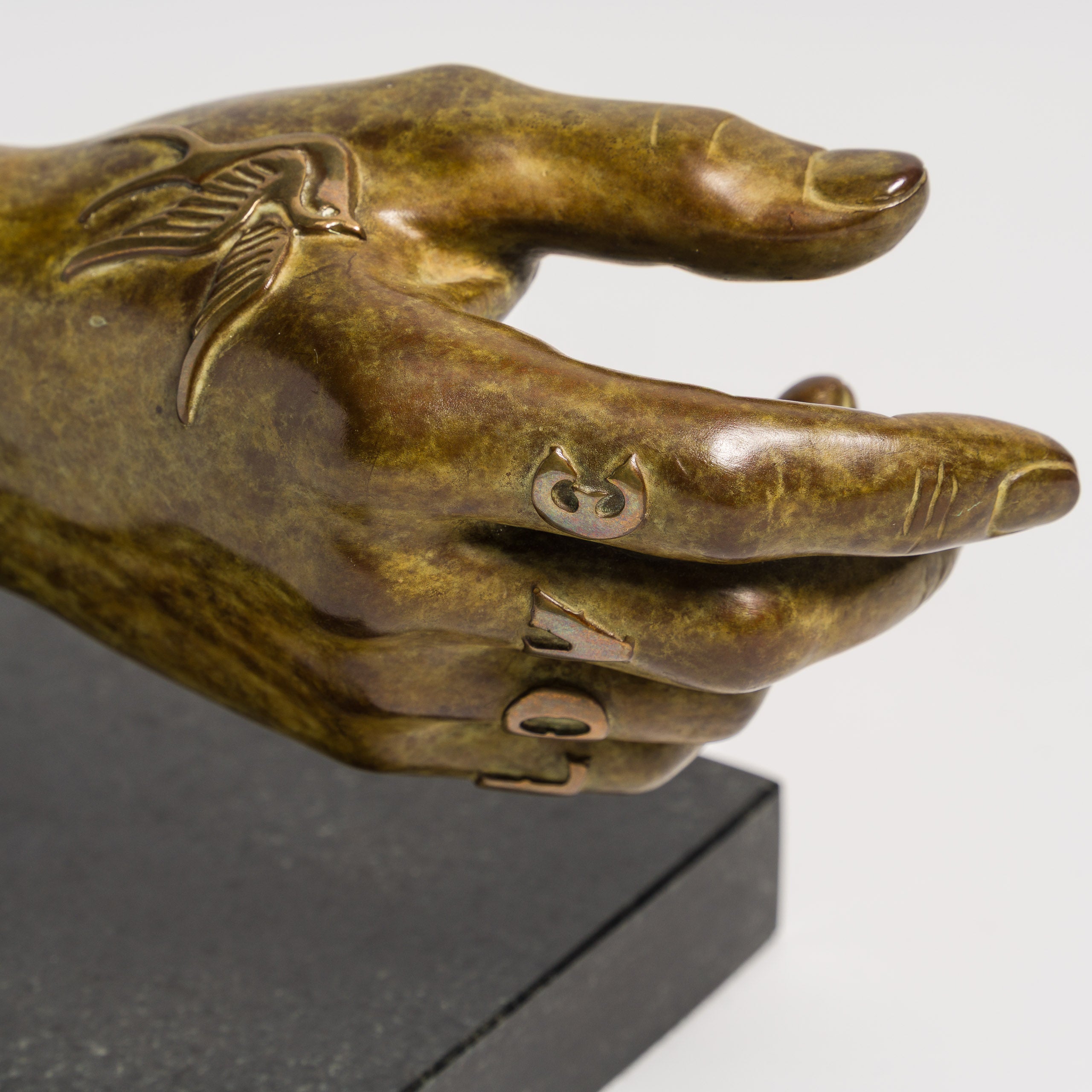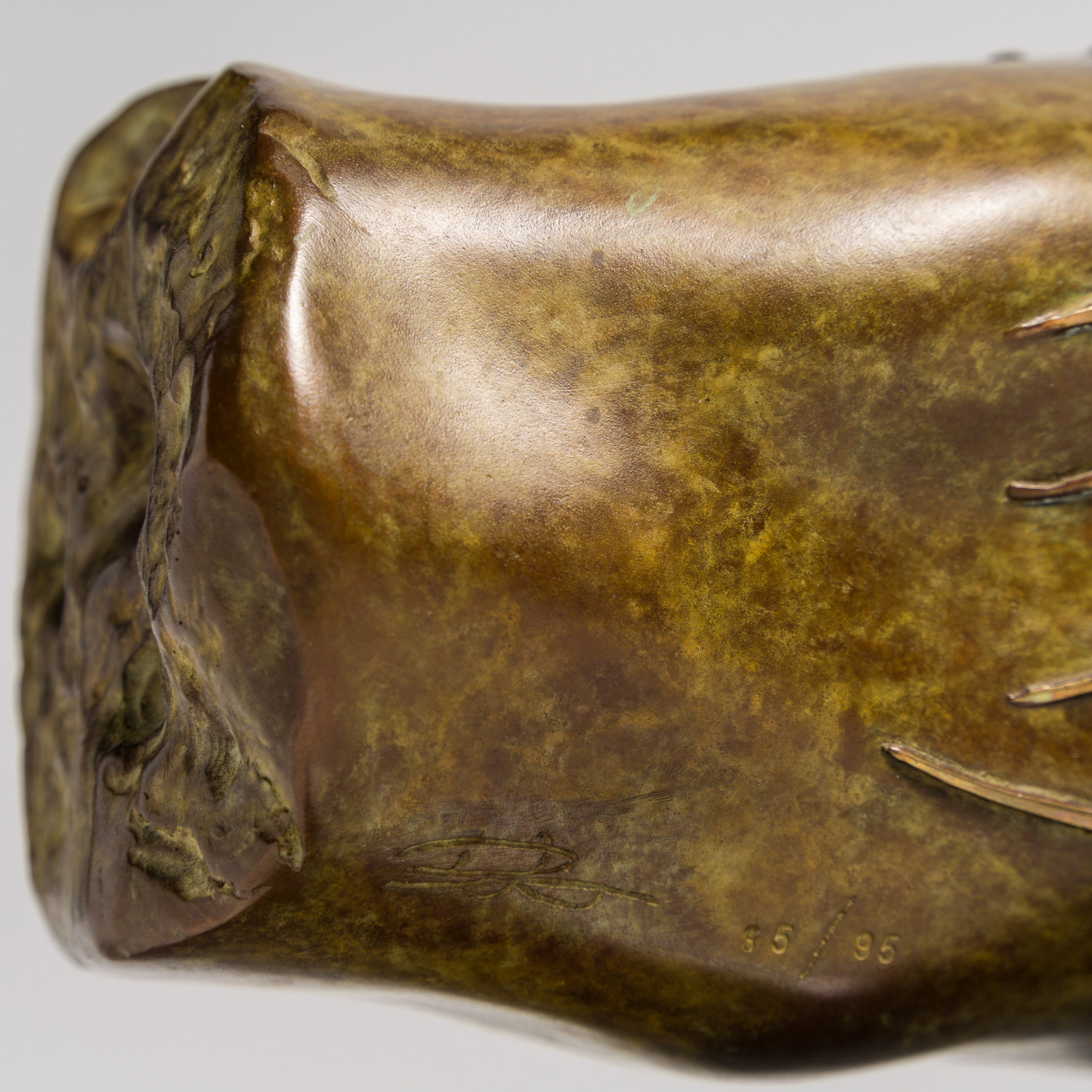 Cast in bronze, the sculptures feature an incredible patina on the skin surface. The aging process involved using chemicals to produce a natural Verdigris (a bluish-green colour). The carved tattoos are raised and have a highly polished finish.
