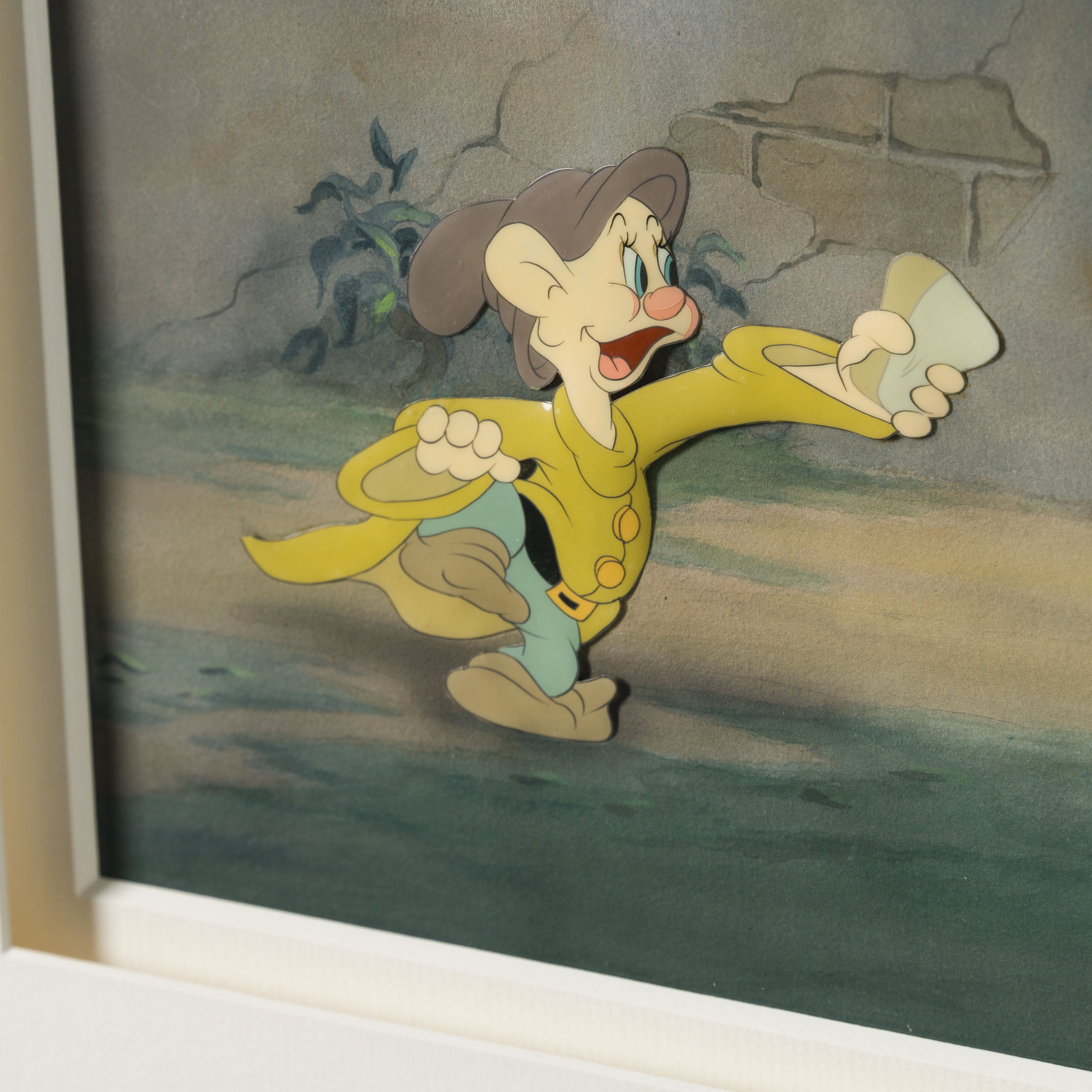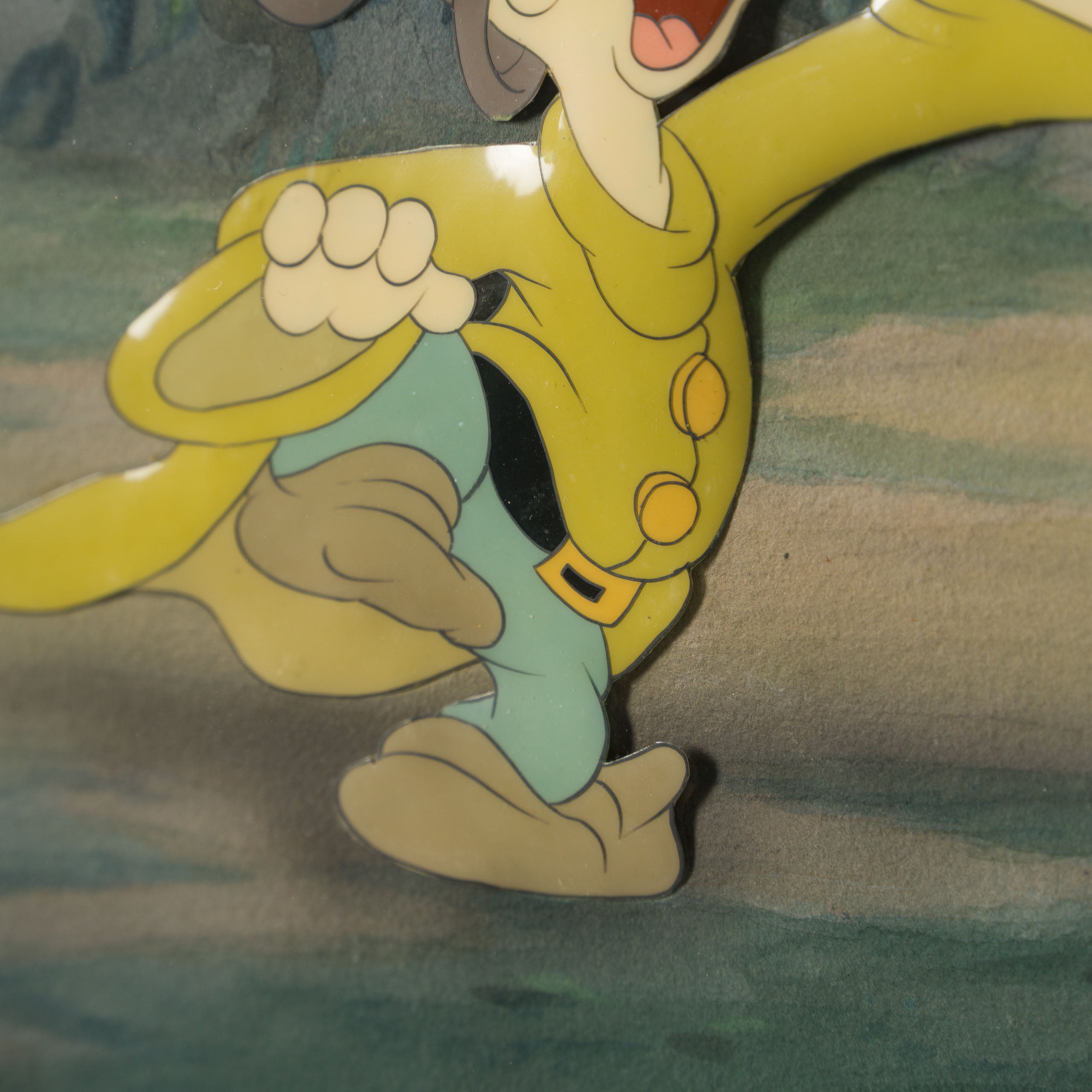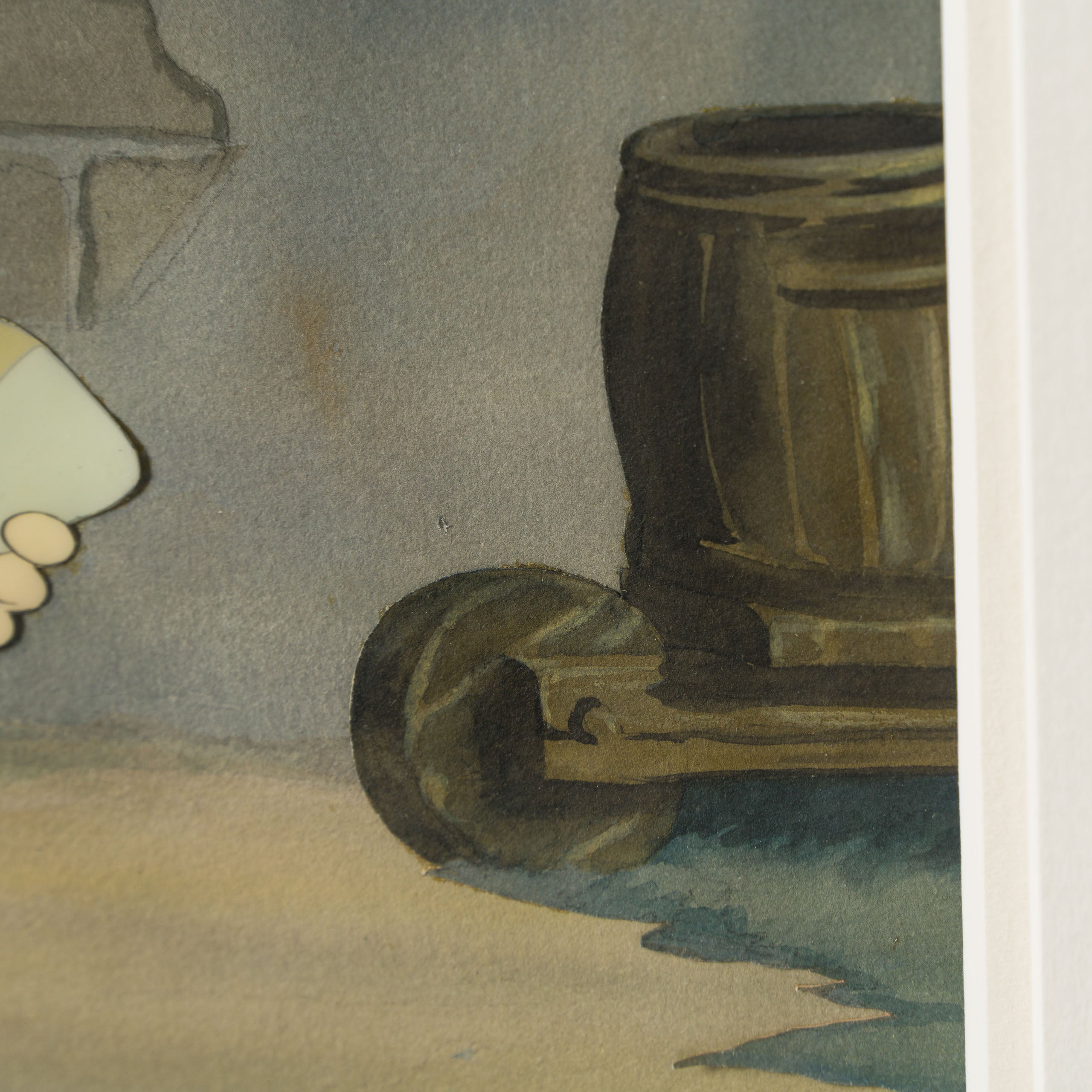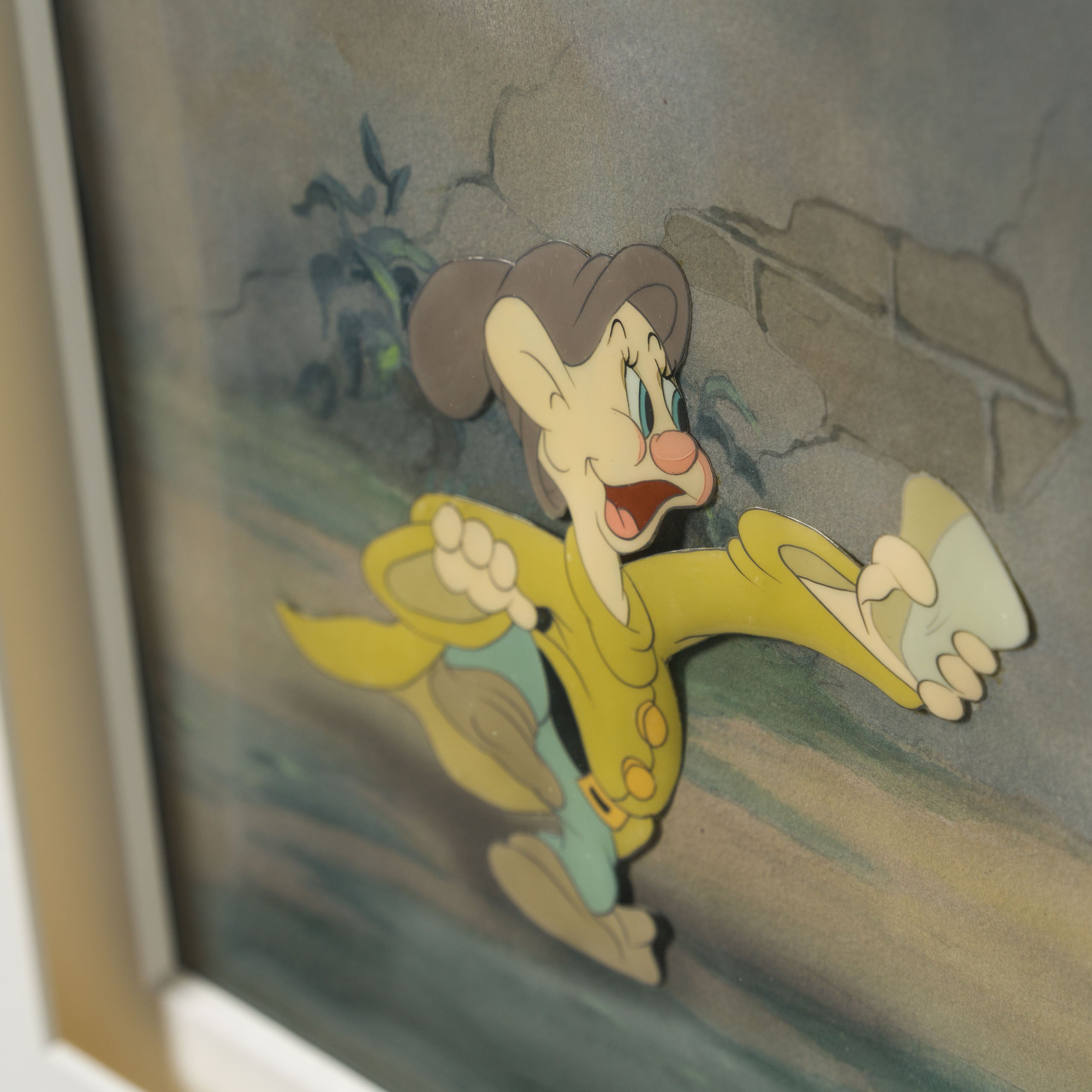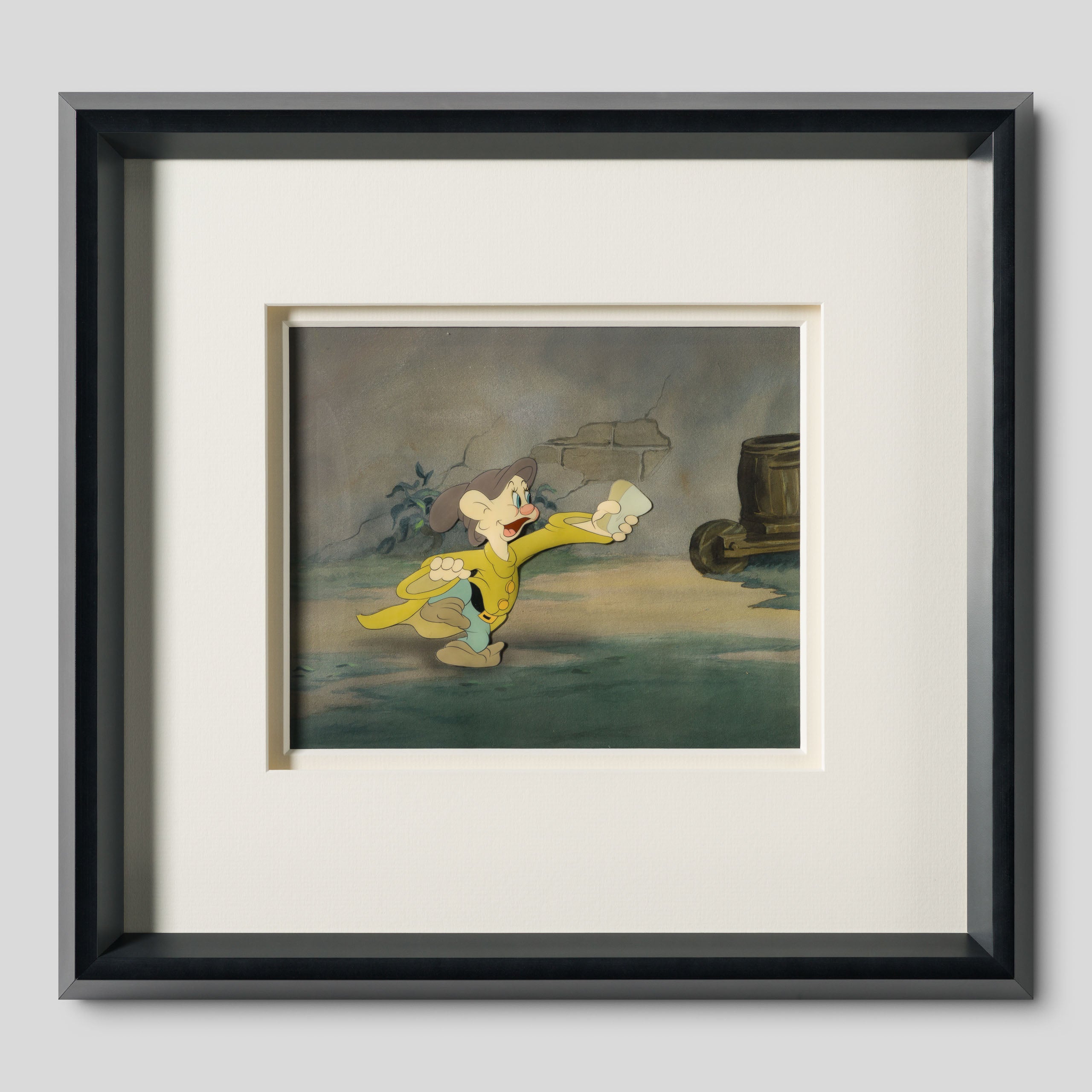 This original production 'cel' or celluloid would have been used in the original production process after an animators' original drawing was traced onto a sheet of transparent plastic and hand-painted in colour. It would have then been projected in front of a hand-painted background via a multiplane camera to create a minute yet crucial movement in the final film. Now mounted and framed, this piece is the perfect way to add a sophisticated and muted touch of Disney magic to your home. Match with another drawing from our Vintage Disney collection to create a perfect pair.