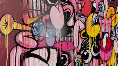 Described as Francis Bacon meets Disney', the series of artworks merged deep themes of human condition and humanistic anguish, whilst combining the light heartedness and comedic value of animation. The original paintings depicted distorted and anguished human figures conveying a sense of existential torment and psychological depth.