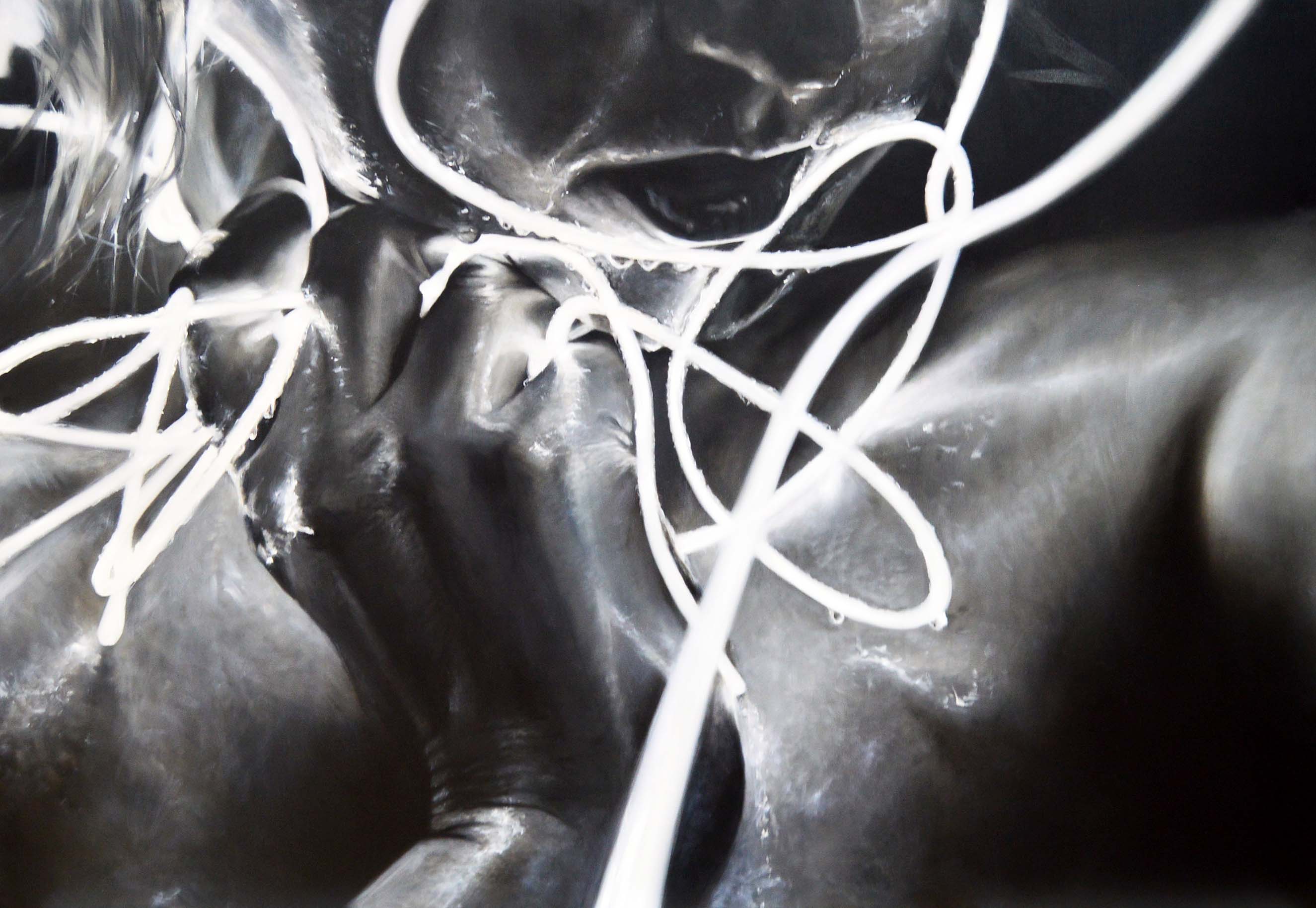 Spiralling across each of the large-scale works is a seemingly chaotic entanglement of neon wires, symbolising the complexity of our thoughts and the digital information we receive and process on a daily basis. To create her celestial pieces, Emma allows her subjects to interact organically with pliable lighting strips and neon wires before painting with a colour palette similar to that used for infrared photography.