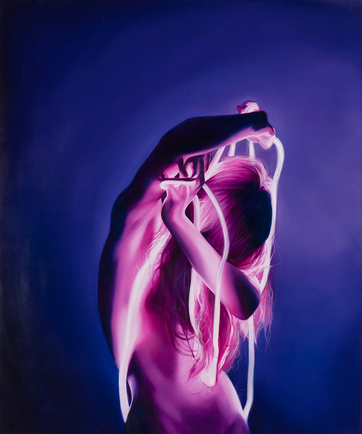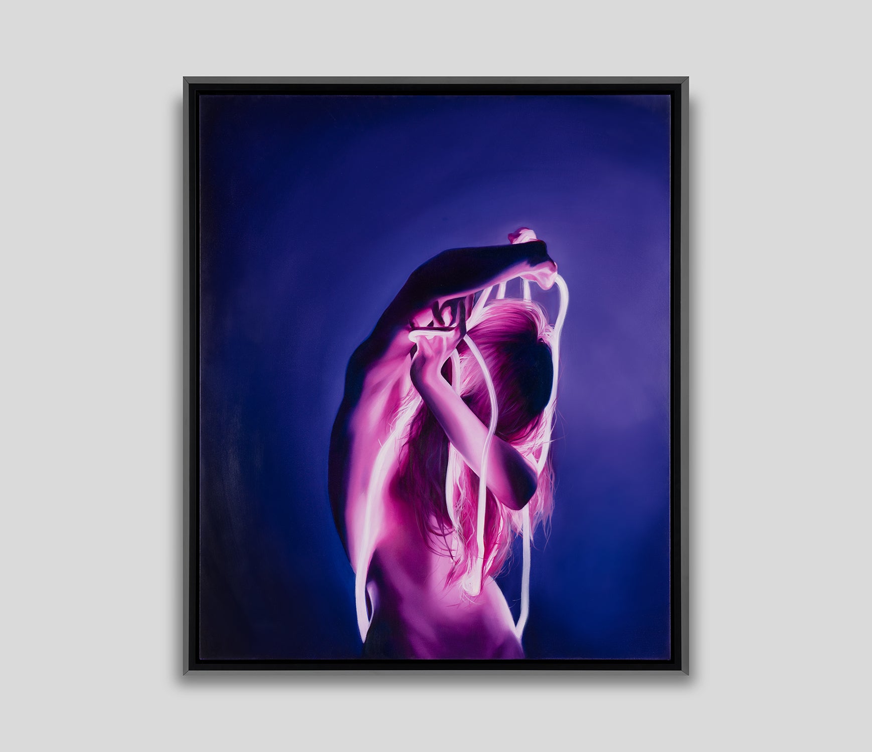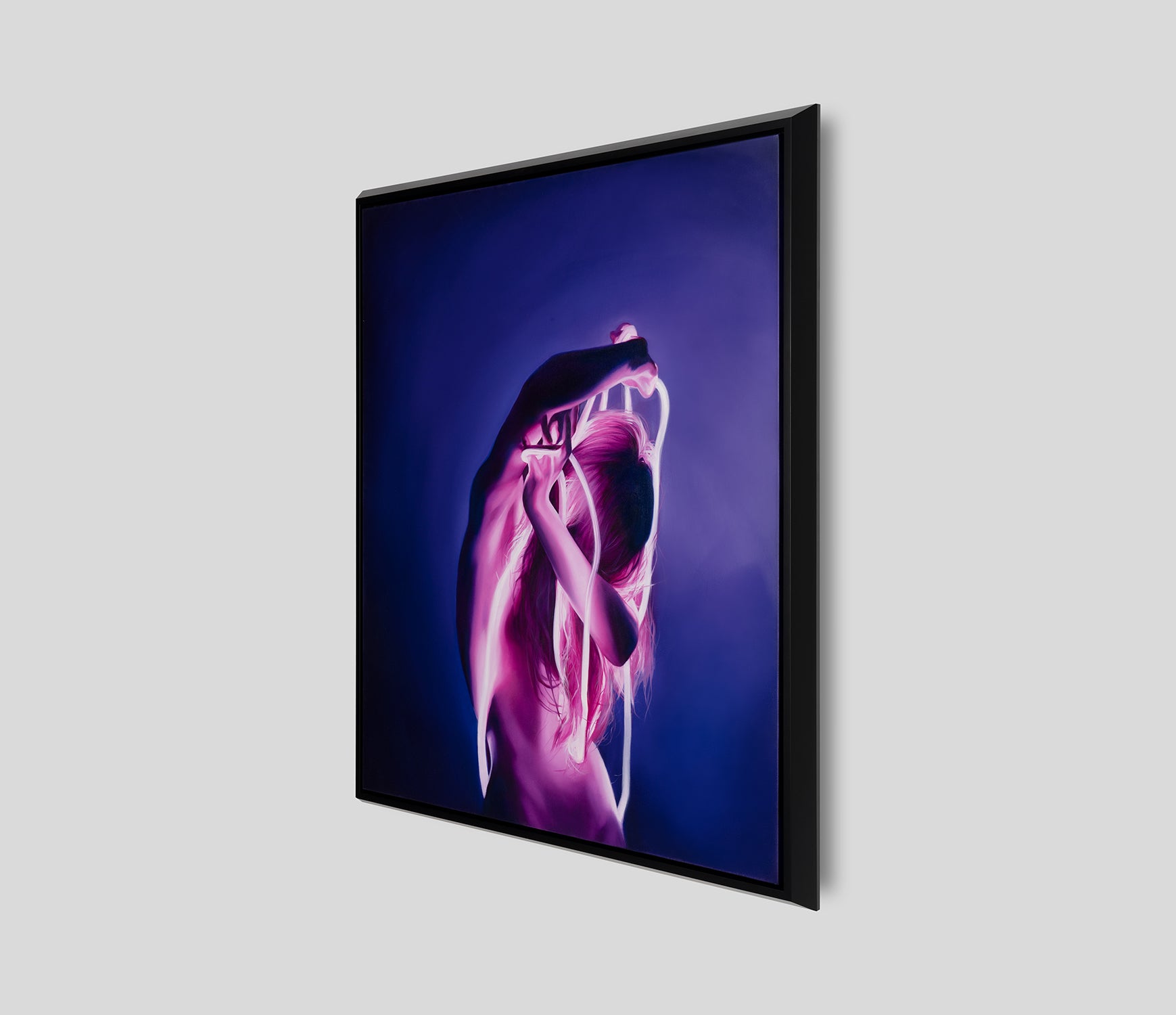 This iridescent original oil painting by Emma-Leone Palmer marks an evolution within her Afterglow collection. Displaying brighter colours across the composition and freer movements than her previous work, the artist describes that this painting reflects her feelings of elation and release as UK lockdown began to end. She remembers dancing in her studio with her eyes closed which she has captured here while using light as a symbolism of her inner energy.