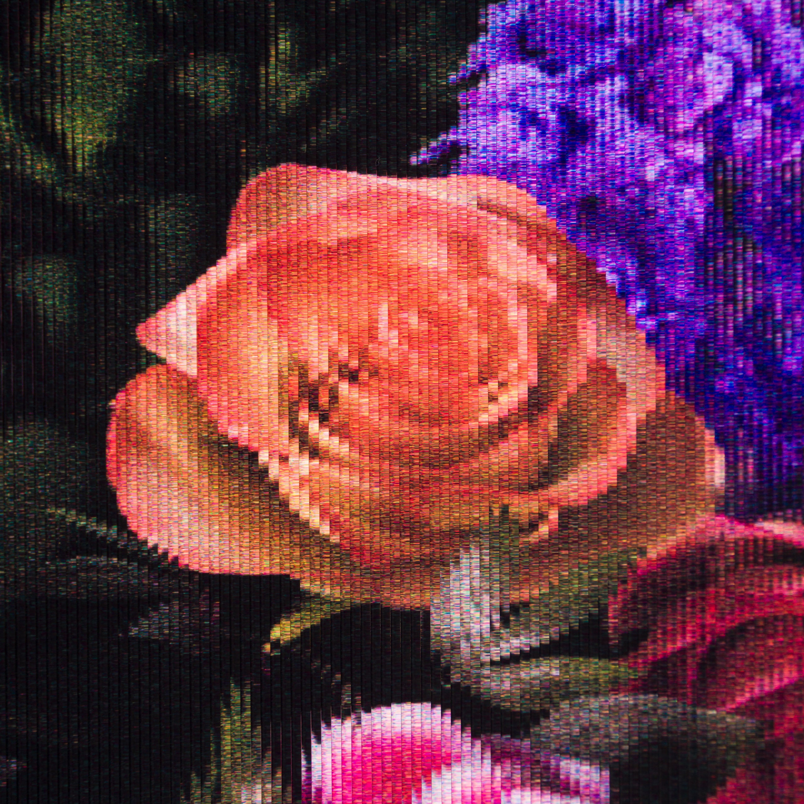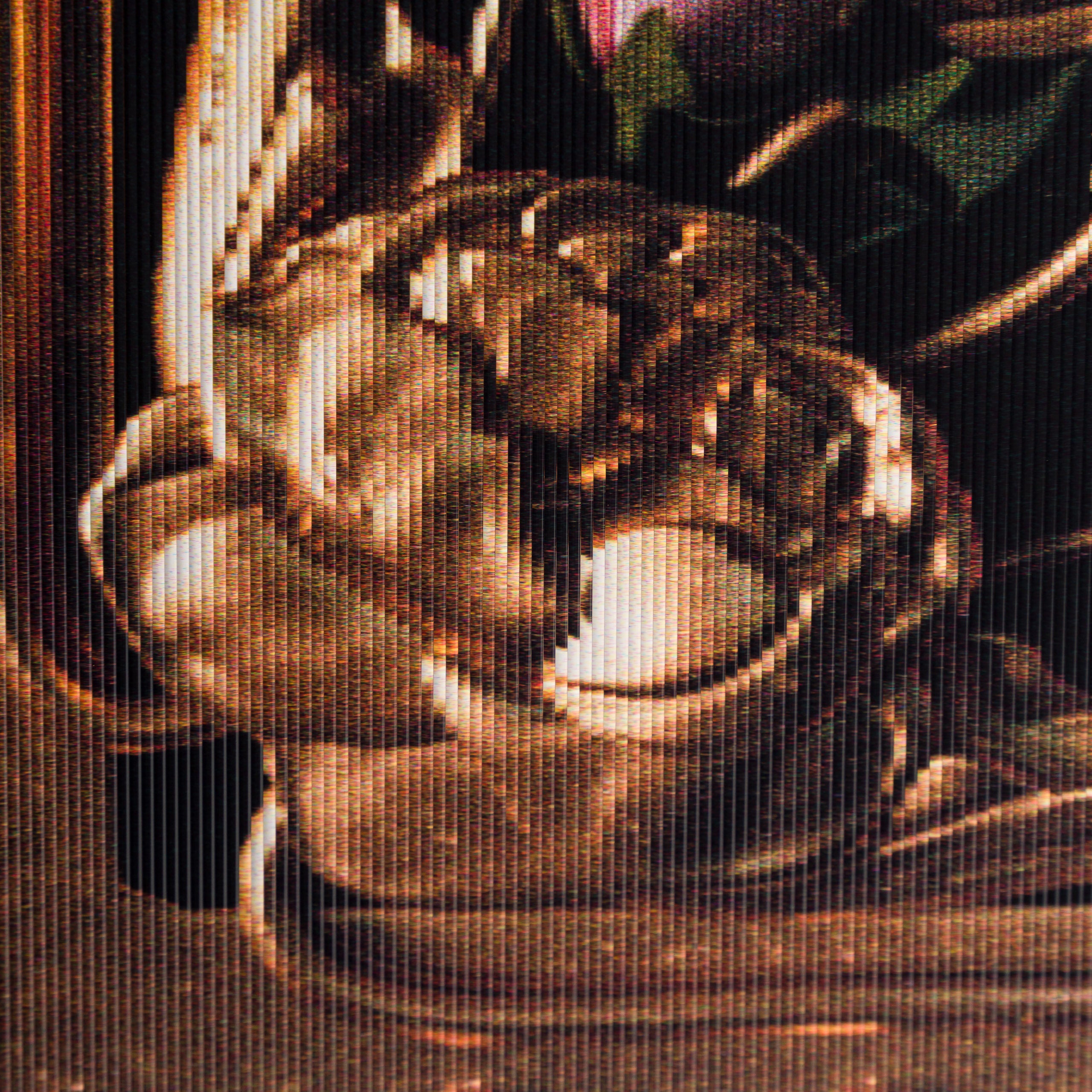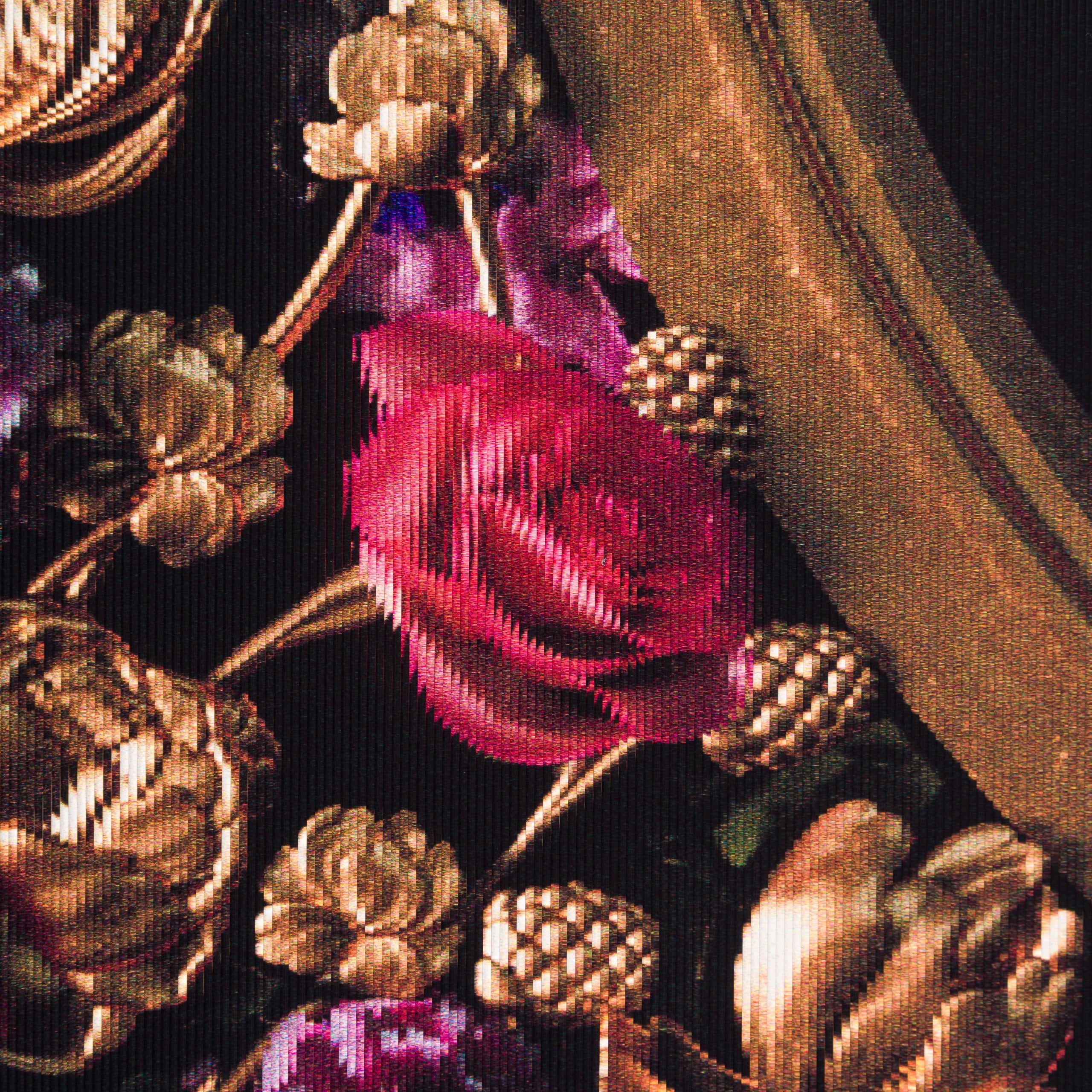 Featuring delicate florals and butterflies emerging from the darkness, this still life image subverts expectations of the genre. With a sense of gentle movement and captivating three-dimensional details, this lenticular centres a gold vase filled with vibrant flowers. An ornate gold frame forms part of the image, creating a sense of depth that makes this image seem tangible.