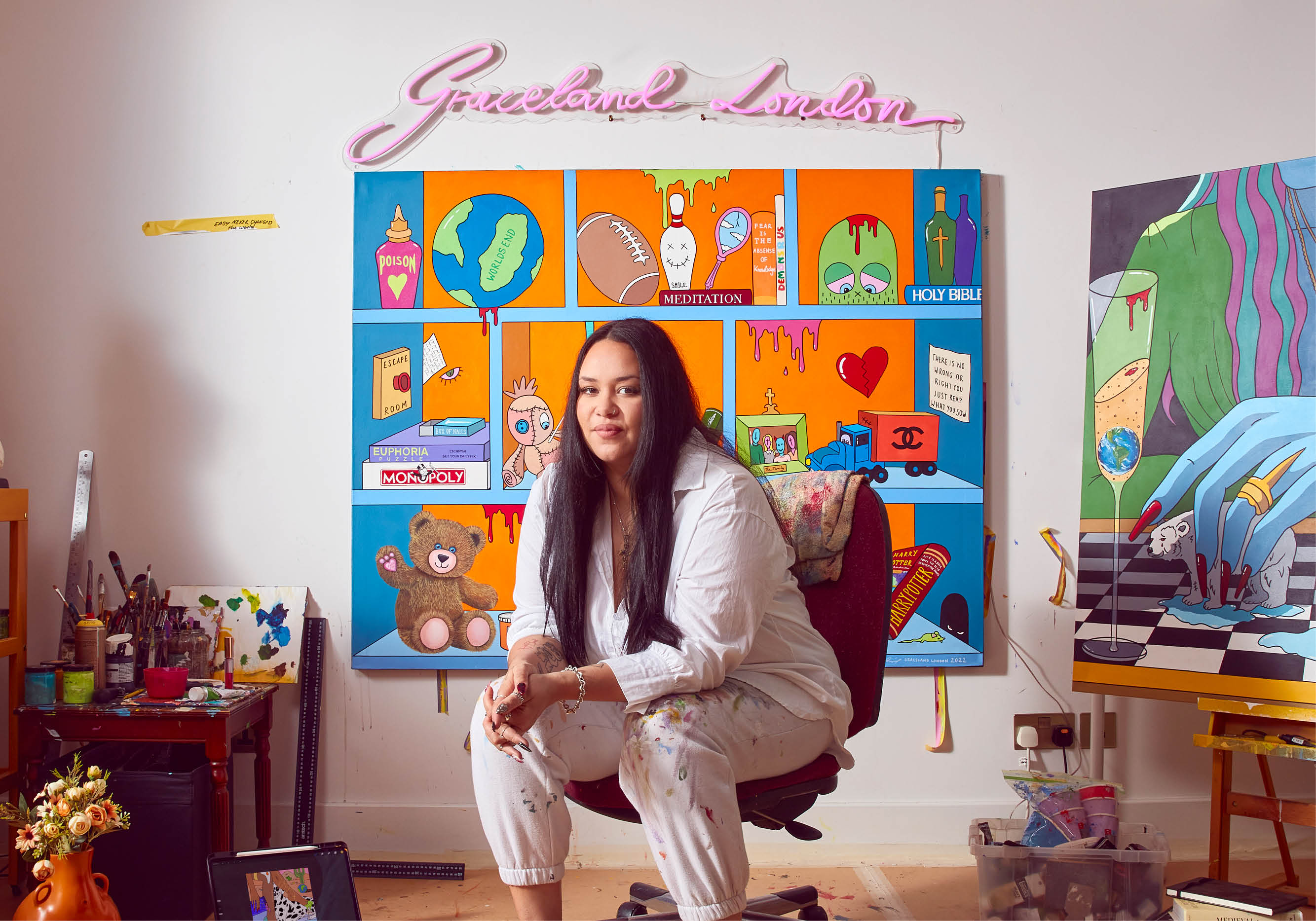 With an assorted melting pot of inspiration, Graceland London sees her paintings as faceless self-portraits, highlighting the strength, darker beauty and resilience of women, whilst tackling emotions and themes that everyone can connect with, no matter who they are.