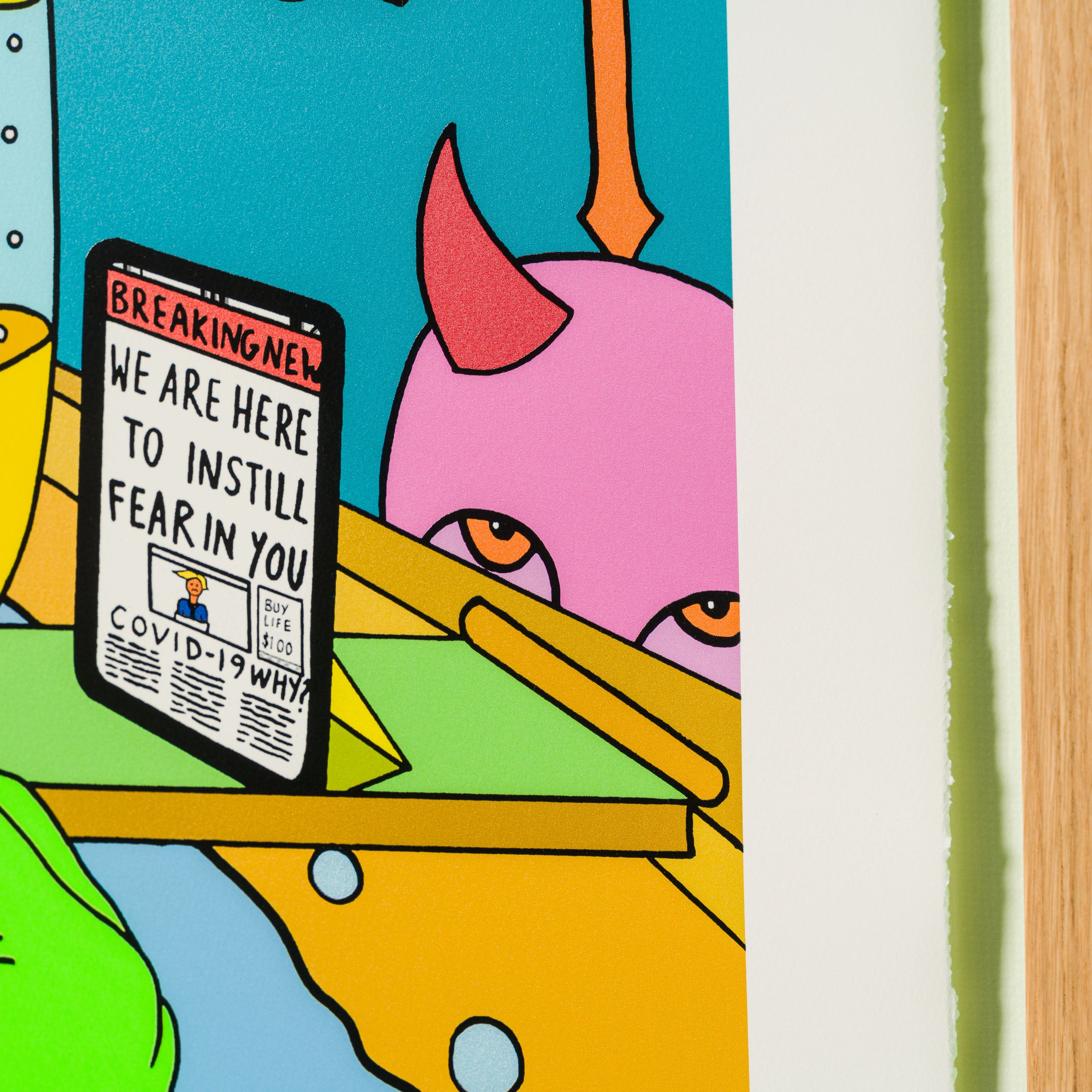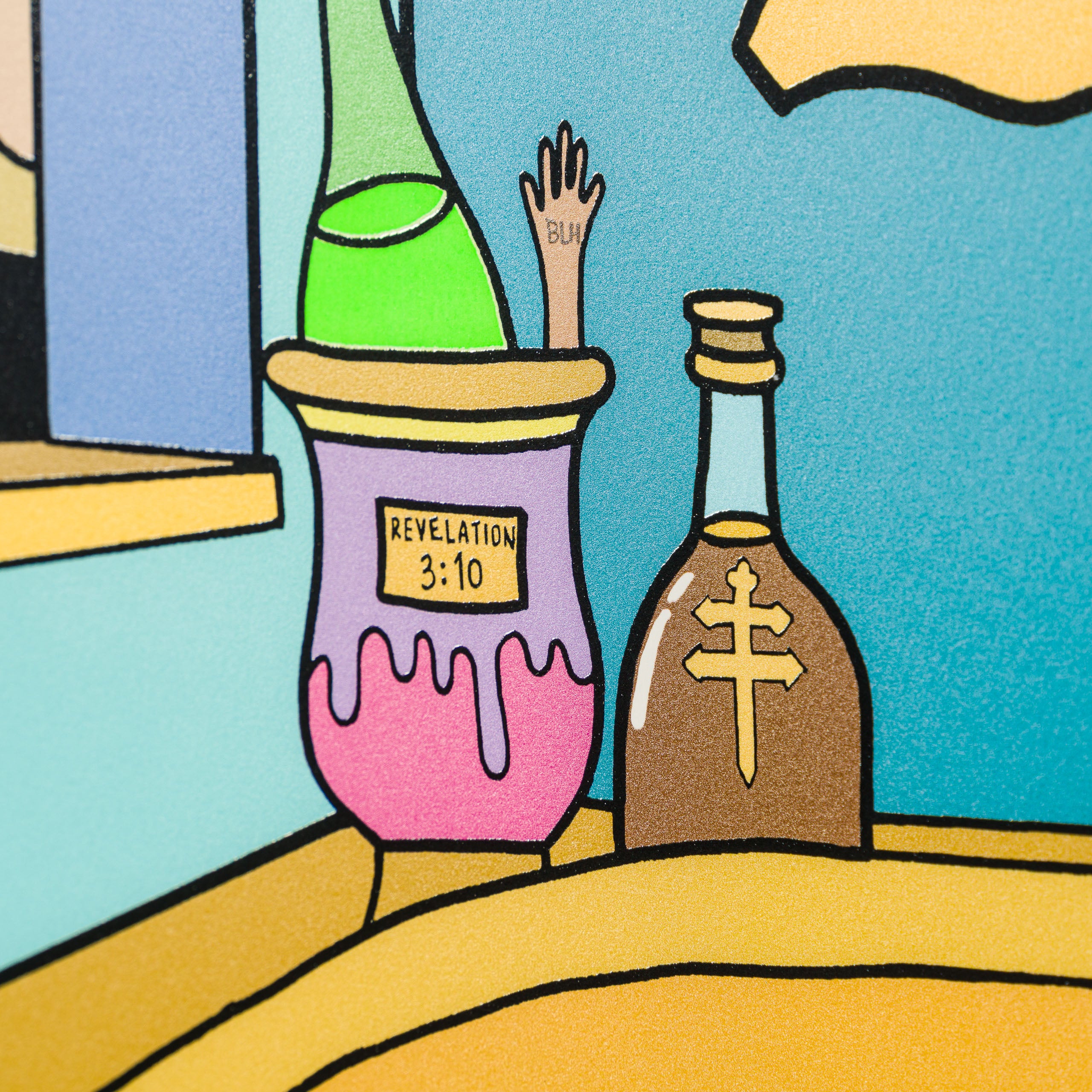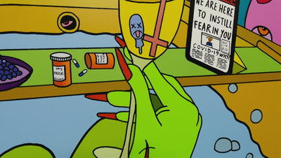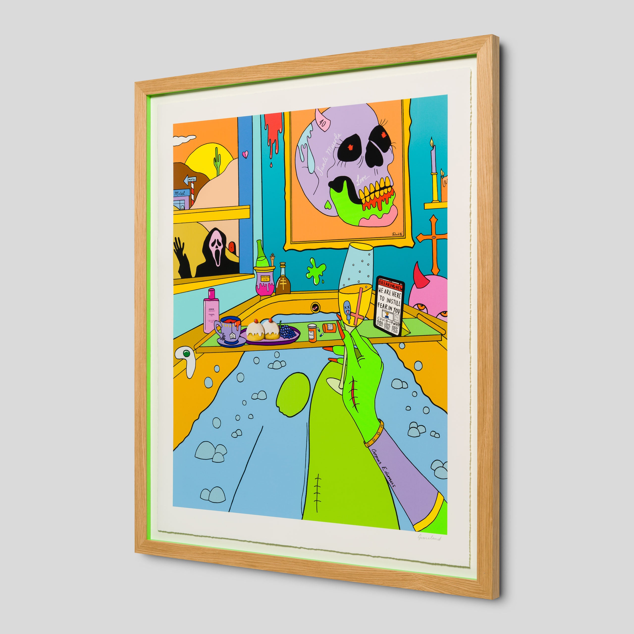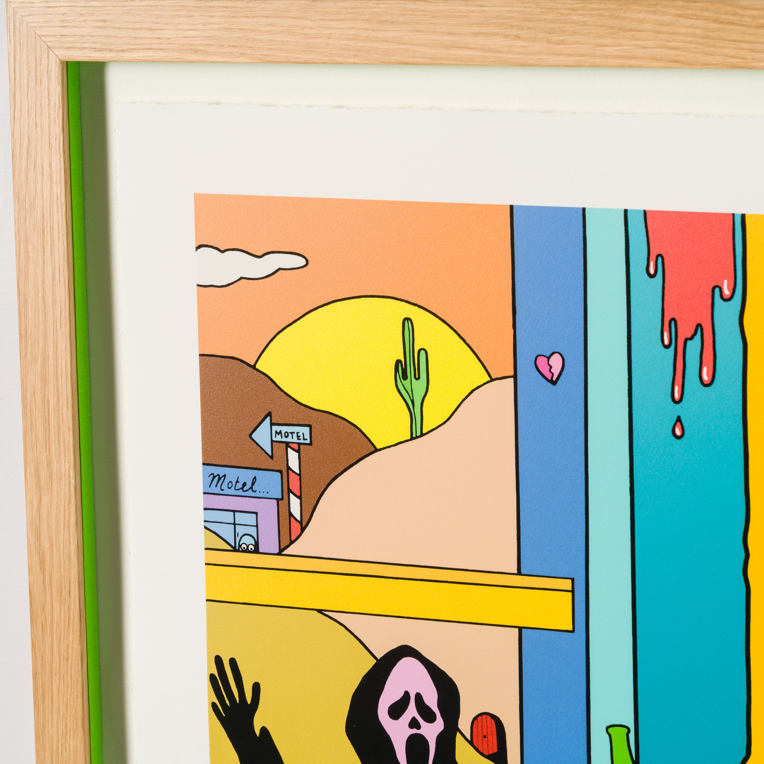 A reference to the COVID-19 pandemic, we see a figure alone in a bath whose only connection with the outside world is seemingly through the media. Although she does have one visitor… The Ghostface character appearing at her open window is a reminder of the risk people faced when leaving the house during periods of lockdown. Graceland London’s signature iconography and her trademark vibrant colour scheme masks a bracing and cynical worldview.