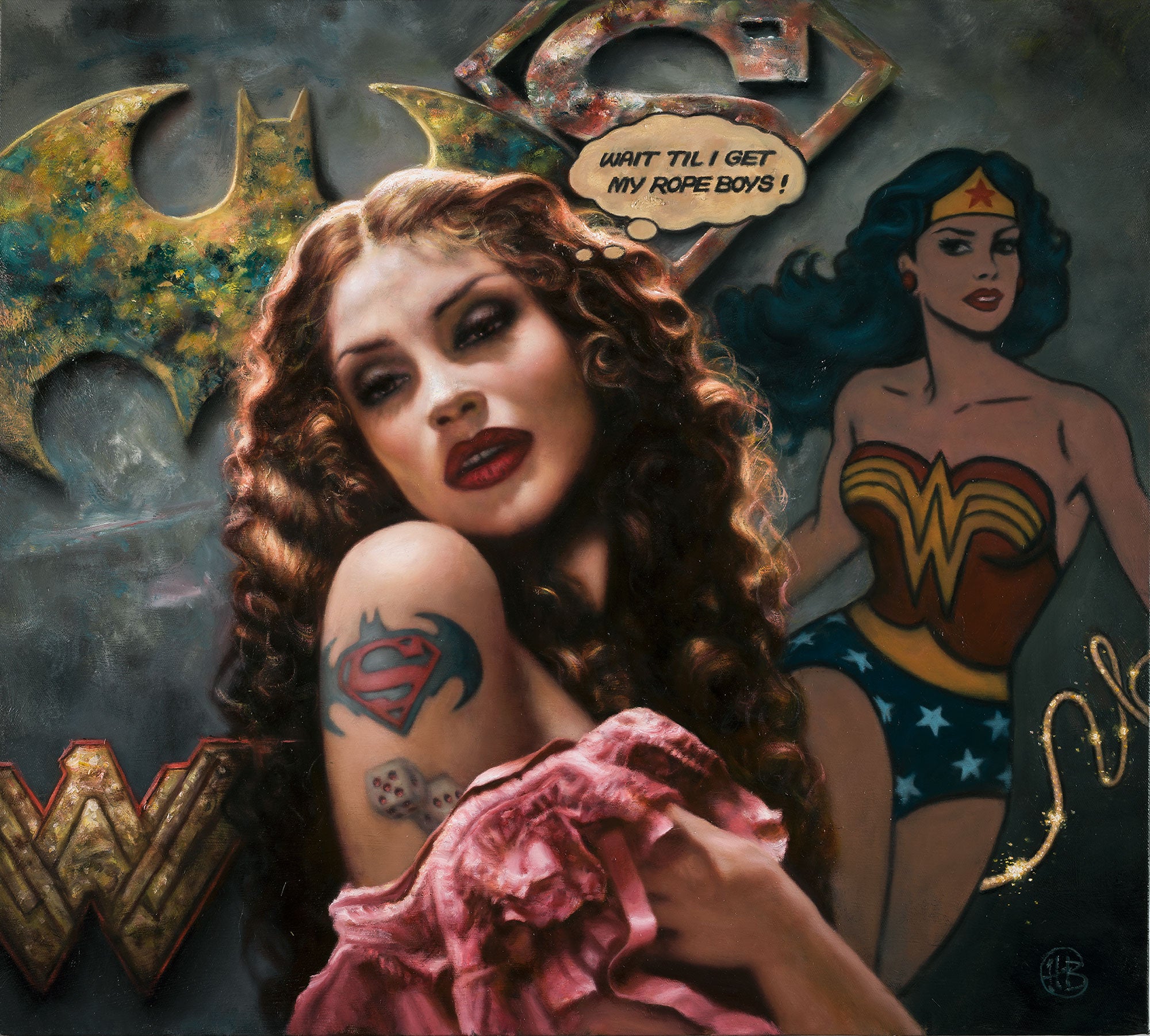 Continuing with Hamish's DC theme and celebrating the power of femininity, this piece depicts a beautiful woman in a pose echoing the lovestruck ecstasy of the girl in 'Love Crazy'. Viewers will identify the comic book rendering of Wonder Woman in the background, which is one of the first incarnations of her and reflects the nostalgic feel of this painting.