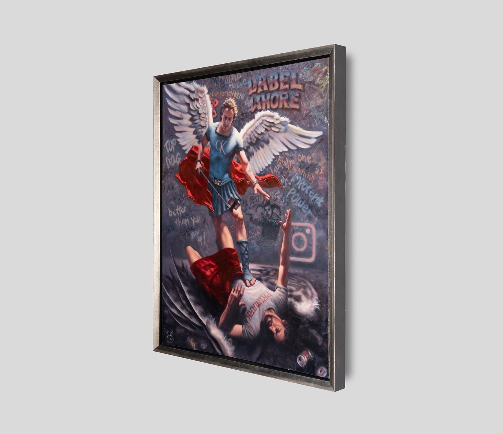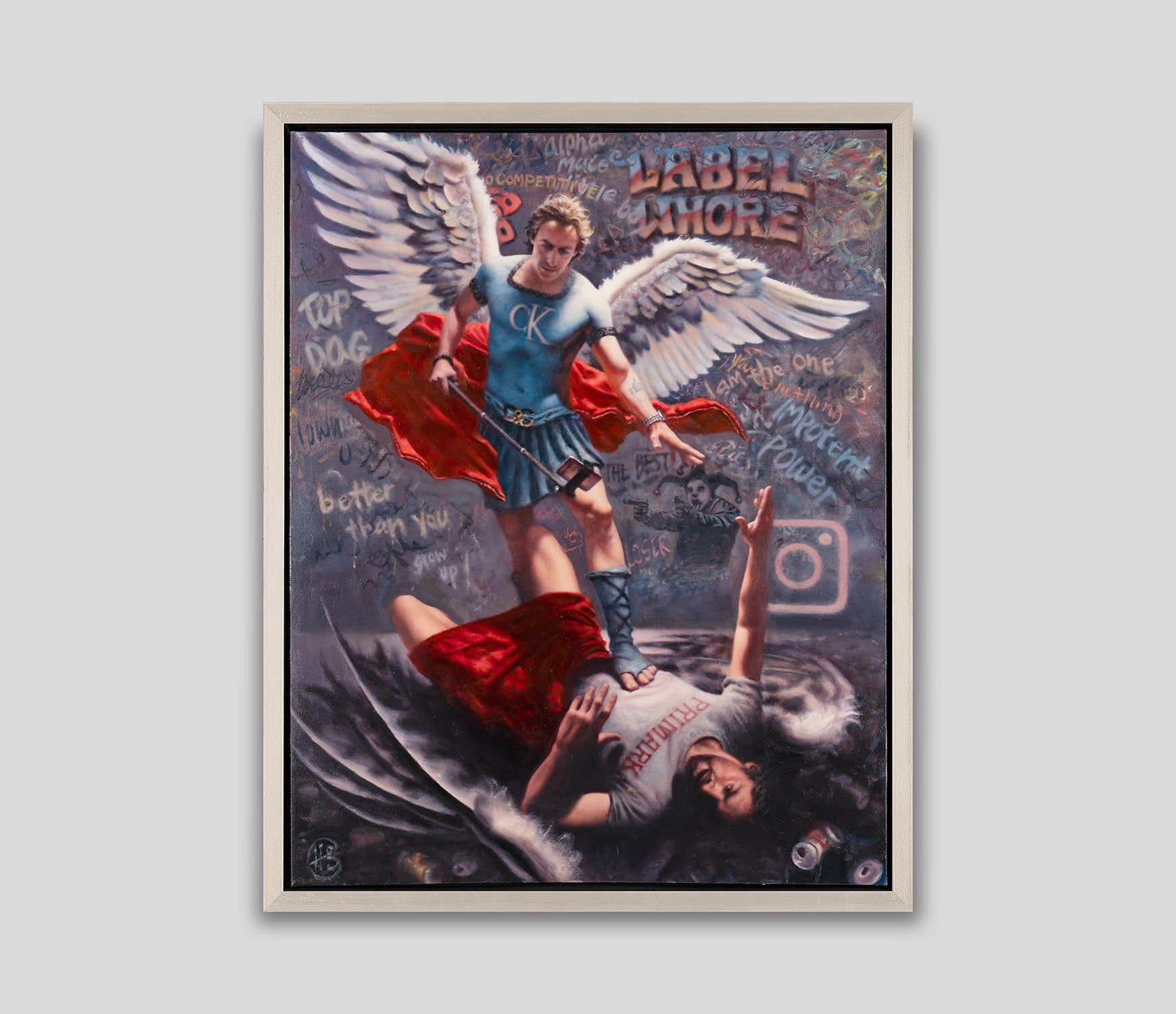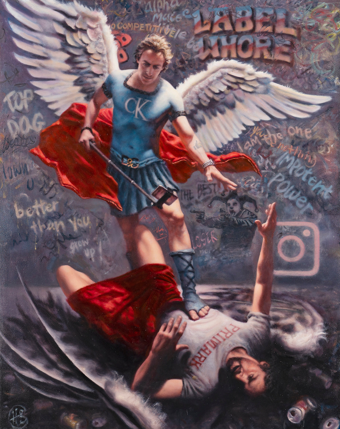 Hamish says: "I have taken the well-known, high renaissance image of St Michael defeating Satan and switched roles. St Narcissus, in his designer label, muscle hugging top is bullying the laid out, Primark wearing underdog. He is so indulgent in his need for superiority that he is taking selfies as he stamps on the chest of his modestly dressed opponent, the stick obviously replaces St Michael’s sword. Ultimately this is a painting about the futility of wanting power over others and the trappings of so called success. It is an ongoing condition with people and a subject that was a joy to paint! On a technical point, it is wonderful trying to capture the quality of these classic, biblical paintings while adding a contemporary flavour."