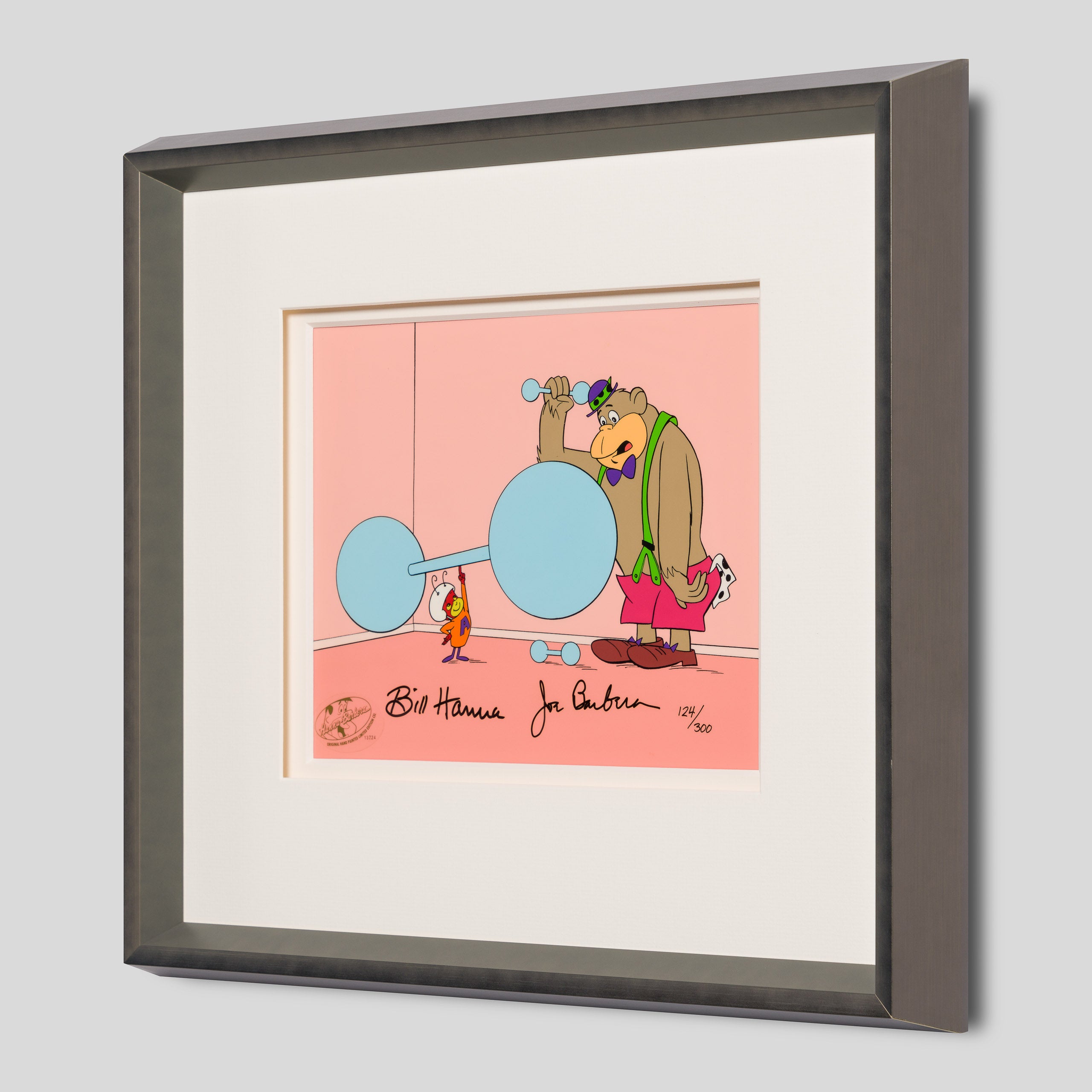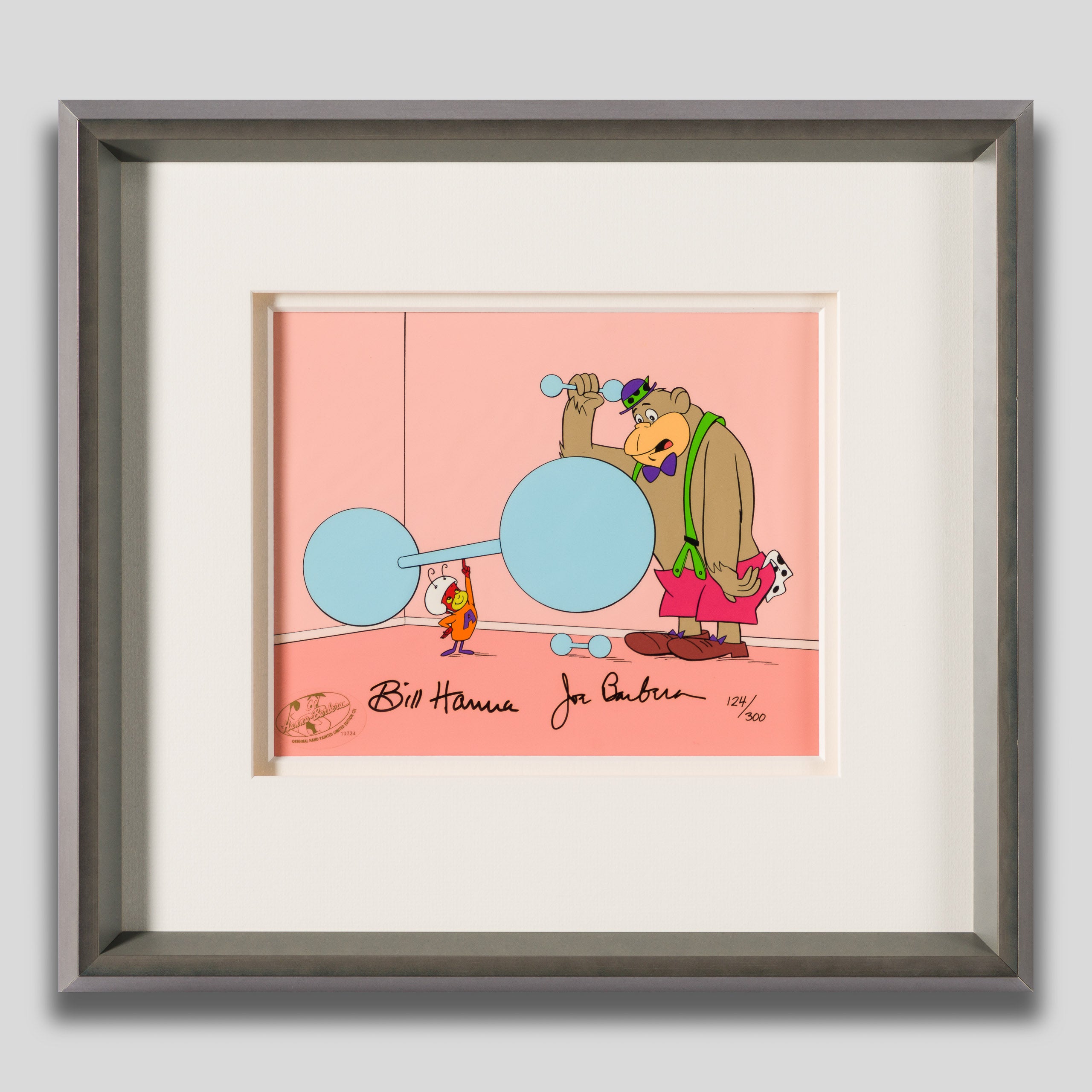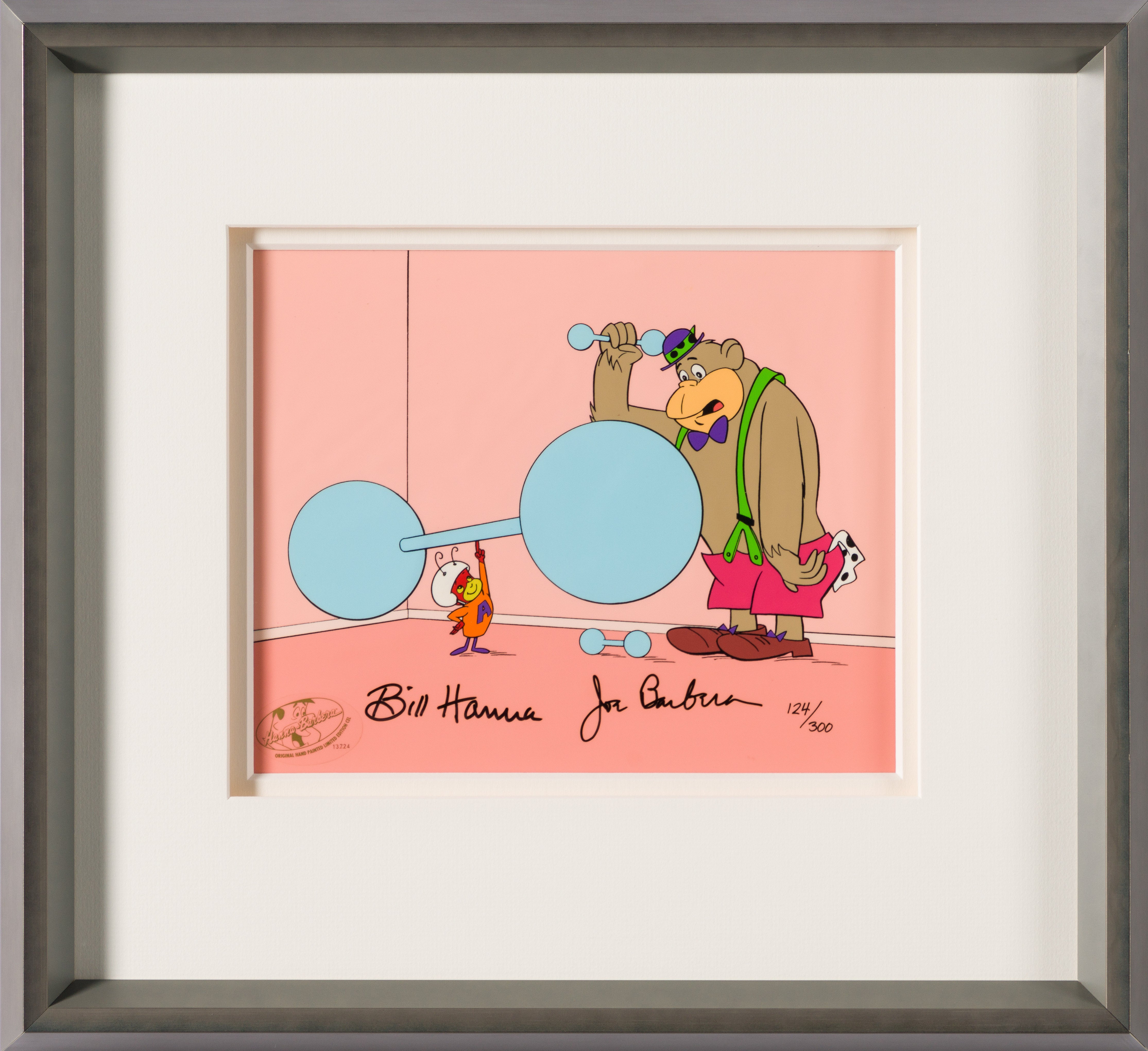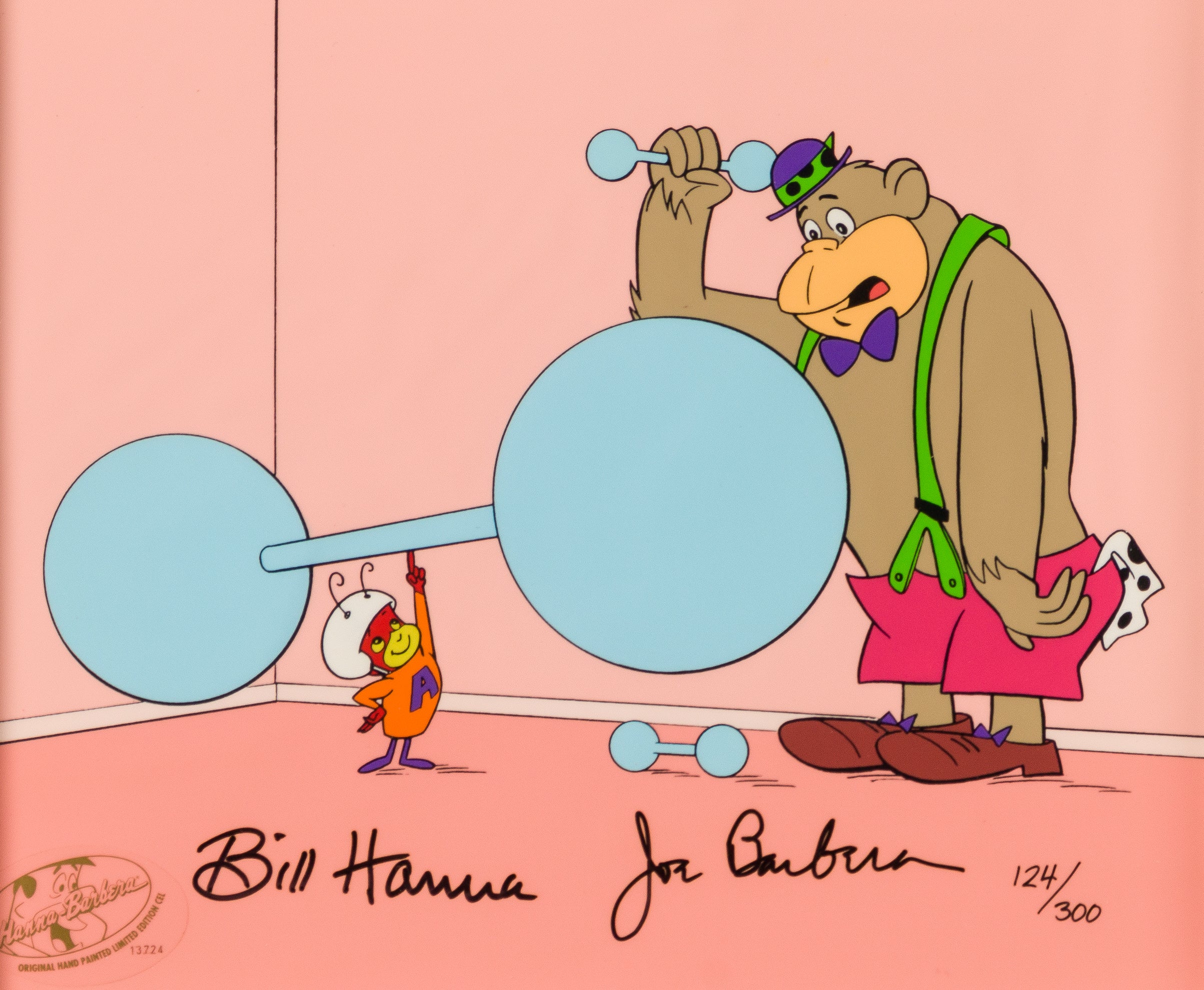 Two animated shows from Hanna-Barbera converge in this unique limited edition hand-painted cel. The Atom Ant Show and The Magilla Gorilla Show both originally aired in the 1960s before reruns on the late 1990s and early 2000s. While Atom was a superhero ant who fought crime out of an anthill in the countryside, Magilla was a pet-shop gorilla who spent his days eating bananas in the shop window after he was frequently being returned by customers who needed his help rob banks and other adventures.