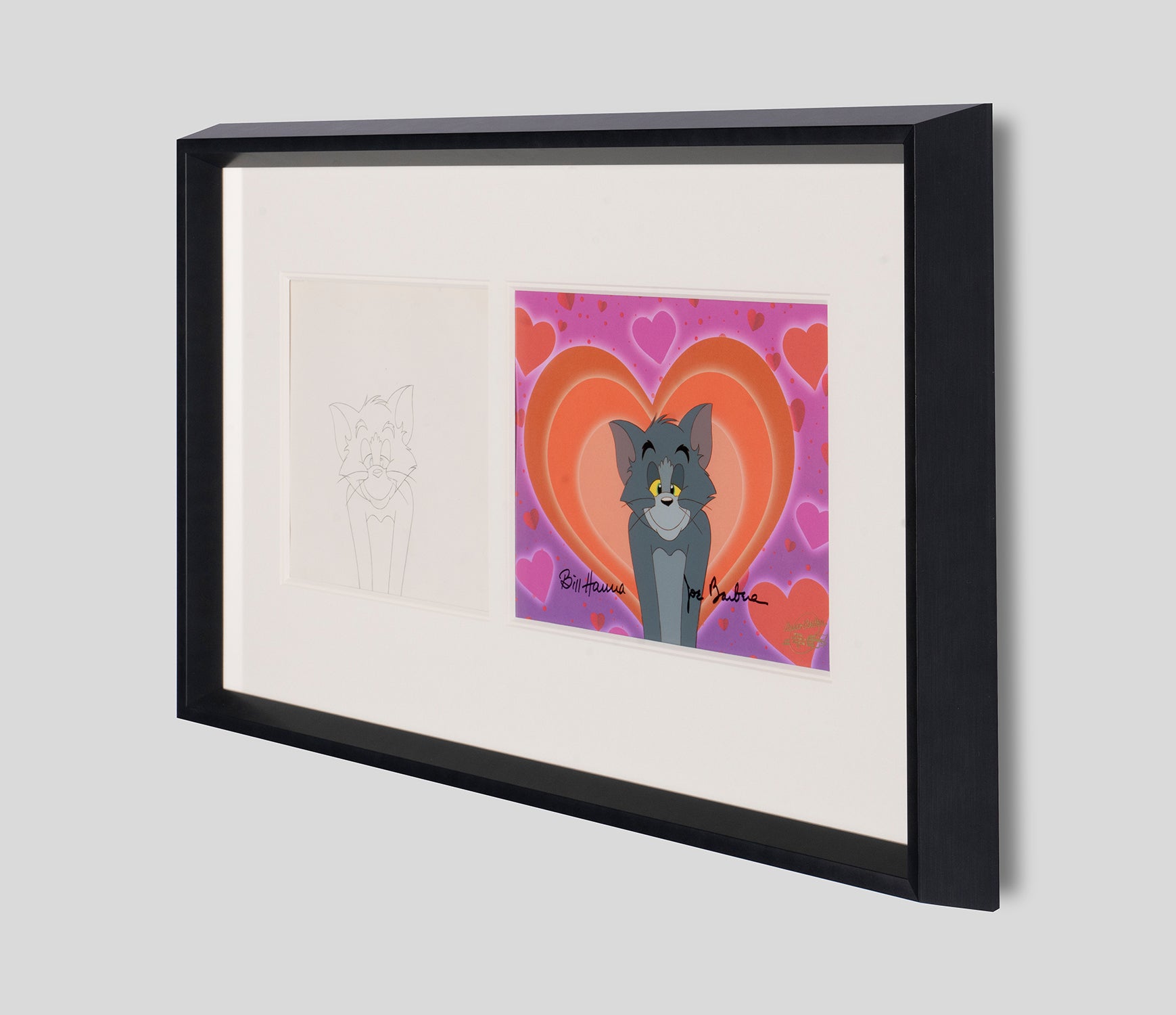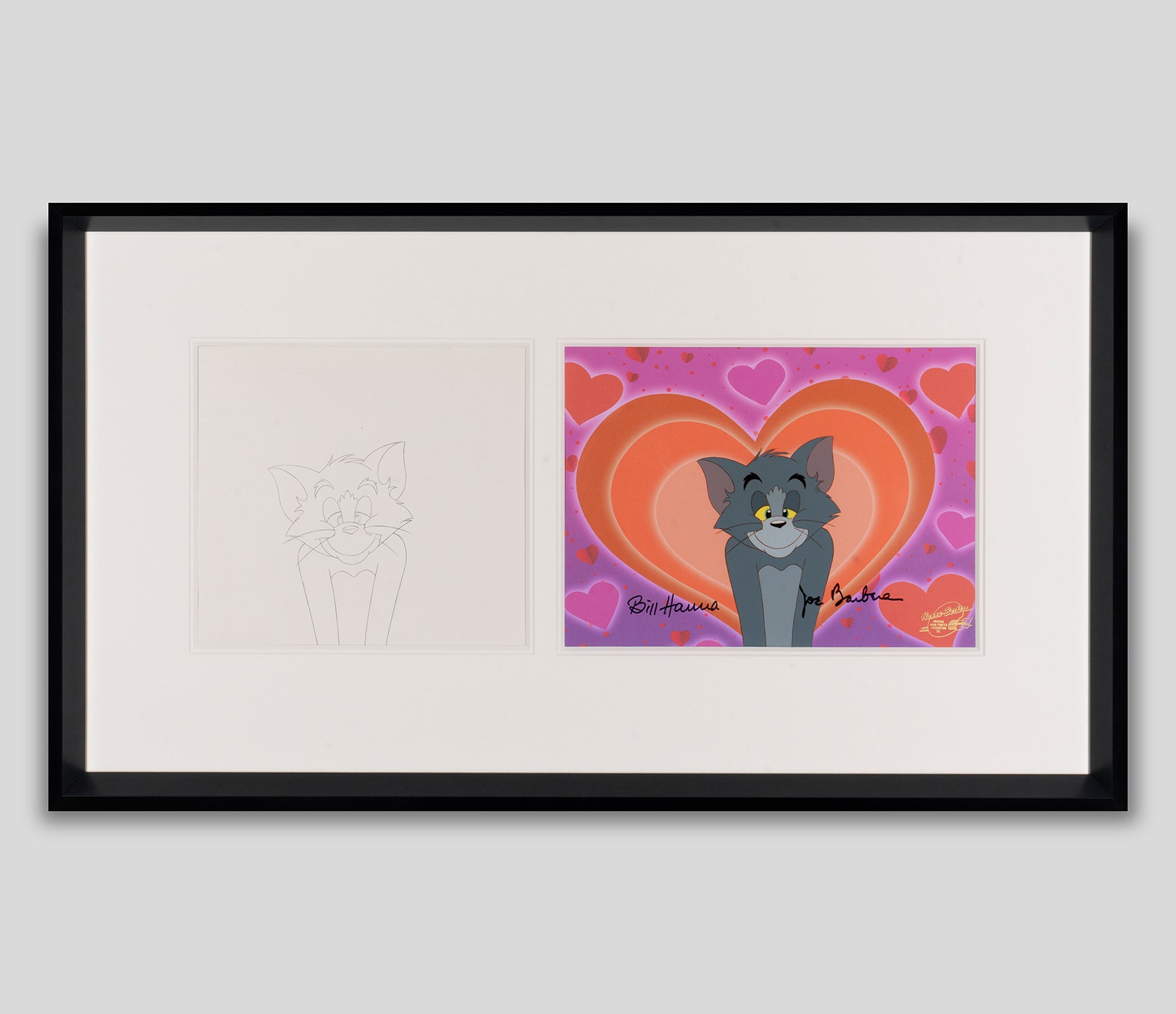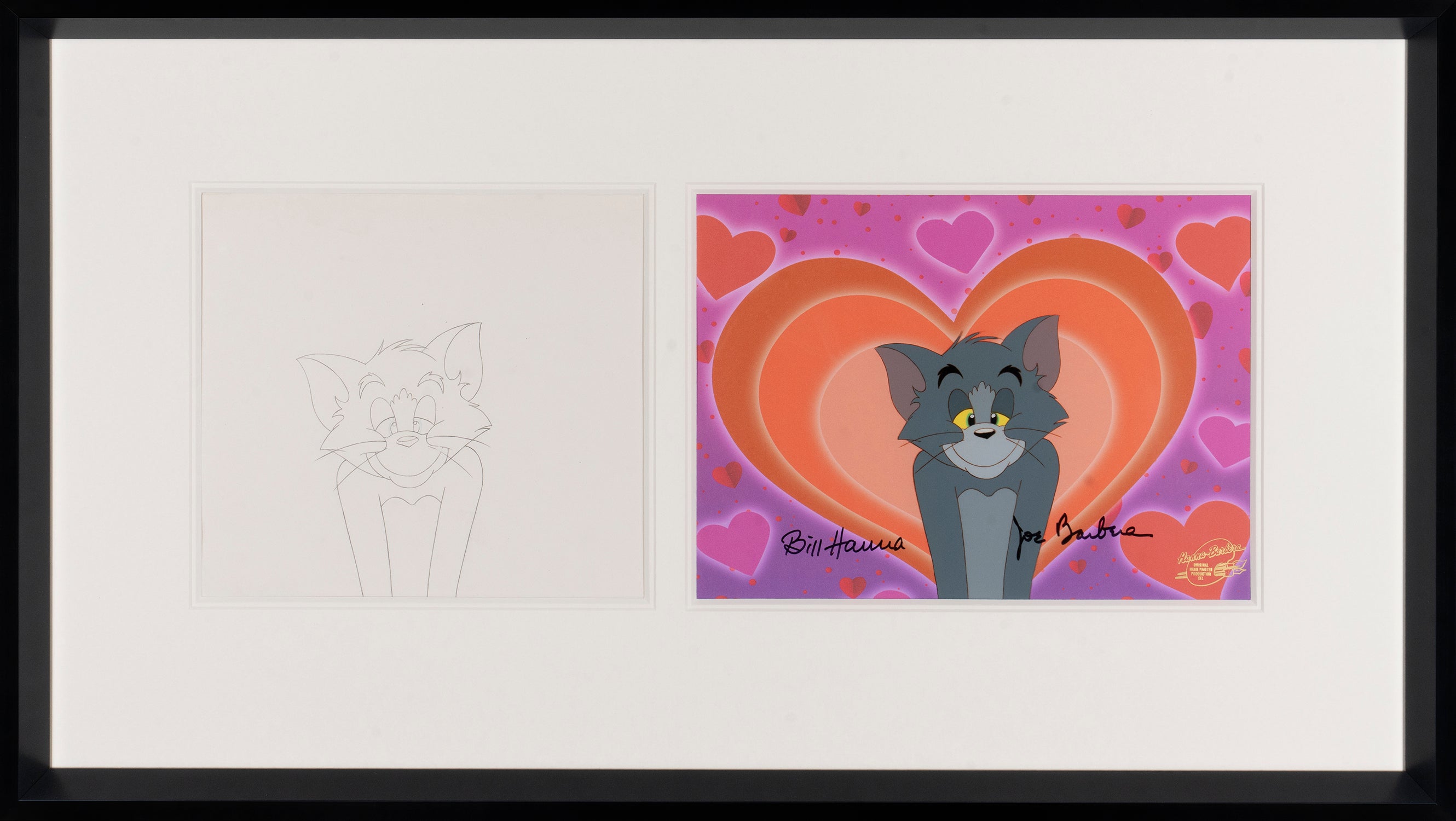 This authentic original production diptych illustrates the meticulous processes of early animation used by Hanna-Barbera studios. The cel or "celluloid" would have been used in the animators' production process after the hand drawing , also featured, was traced by hand onto a sheet of transparent plastic and painted in colour. Then projected onto a separately painted background in front of a camera, each cel - like this one - would be moved by hand according to the animating directors to create a minute yet crucial movement in the final cartoon.