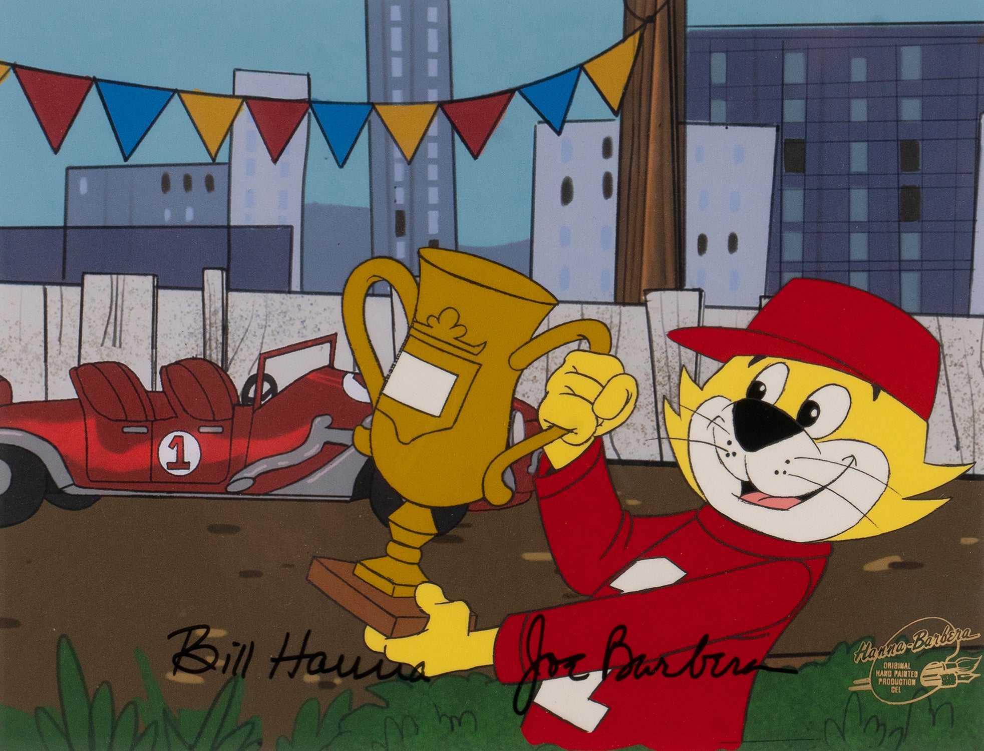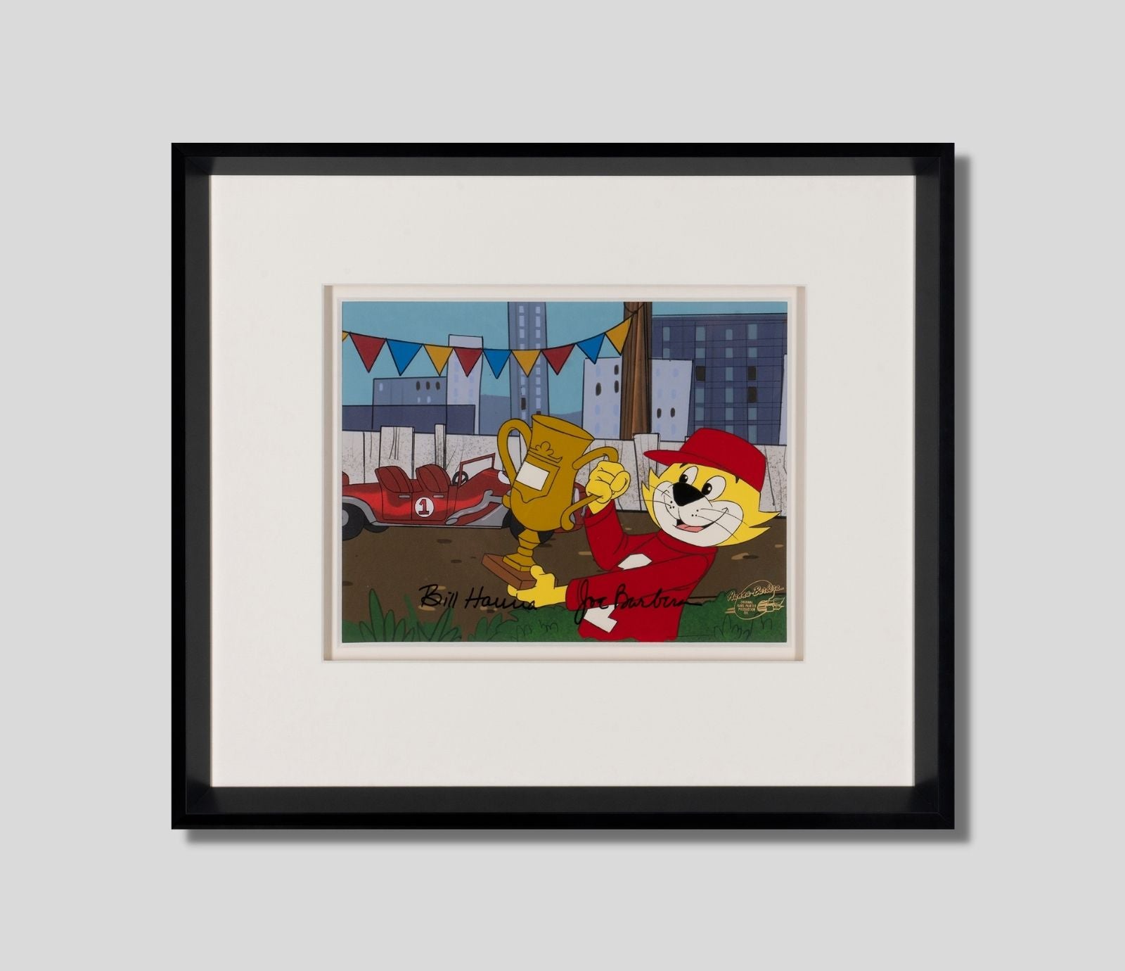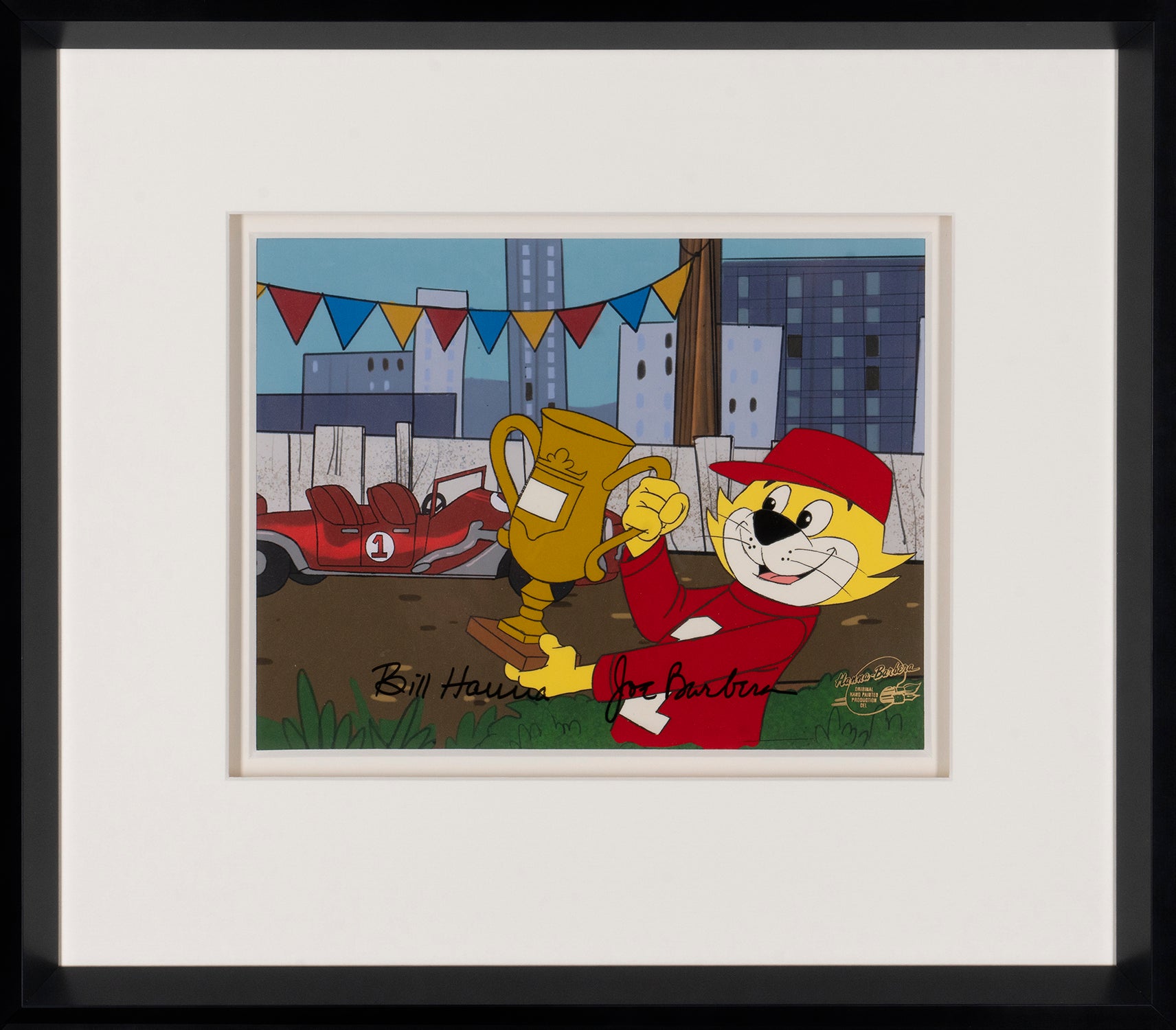 The most effect-ual Top Cat is showcased here on this iconic original production cel. First airing between 1961-1962, the success of Top Cat meant that this cheeky cartoon character and his gang of Manhattan cats were rerun and revisited many times. These included: four other TV shows, four films, and six cameo appearances such as The Powerpuff Girls (2000).